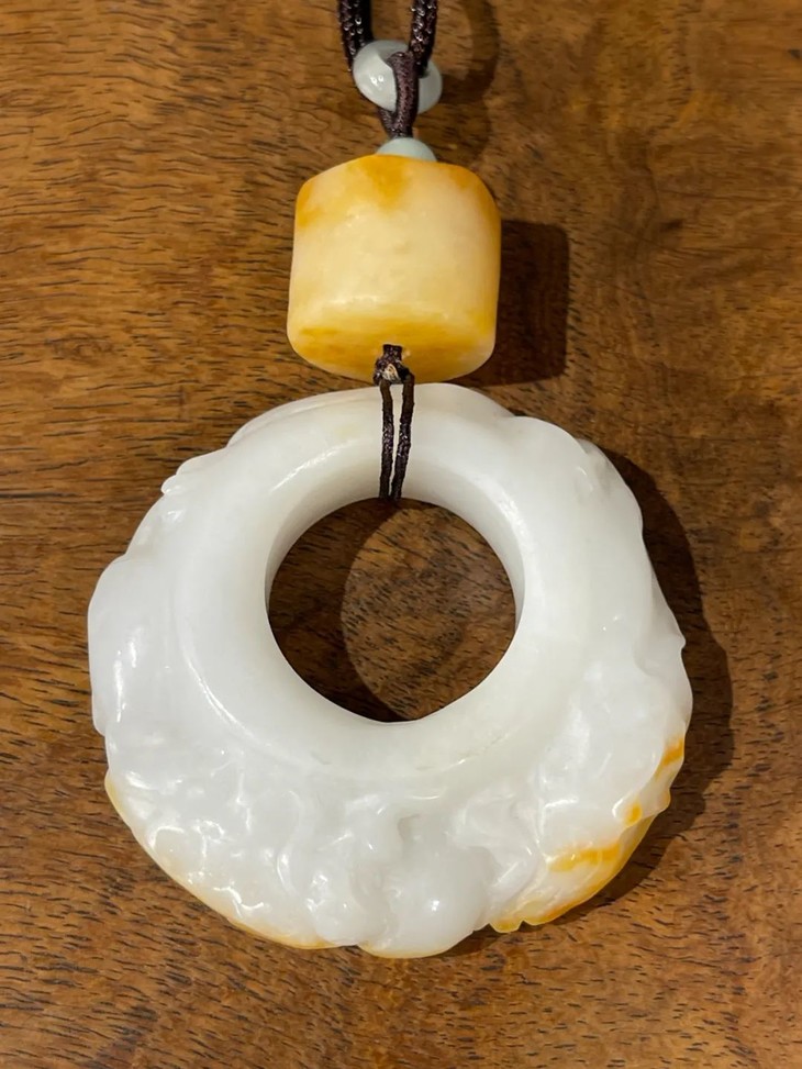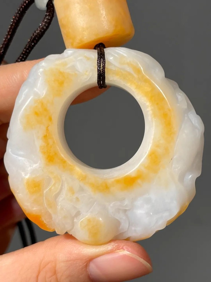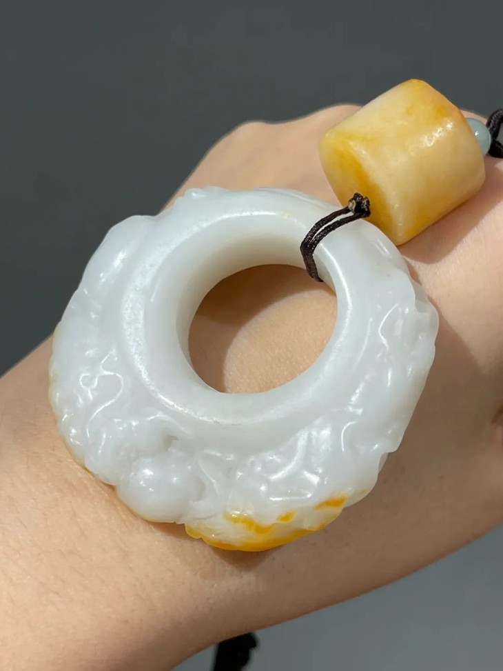 这是一件以纯白带黄金皮沁的和田籽料白玉巧色雕琢成兽纹环形珮与勒子吊坠,纯白无瑕糯性高的和田黄金沁籽料羊脂白玉、质地特别细腻、光亮与温润,强光下透视,除了留皮巧雕黄金沁斑花卉纹外,基本上看不到任何瑕玼,好似刚刚割开的肥羊脂肪,表面光泽正如凝炼的油脂。握于掌中令人心动、爱不释手。