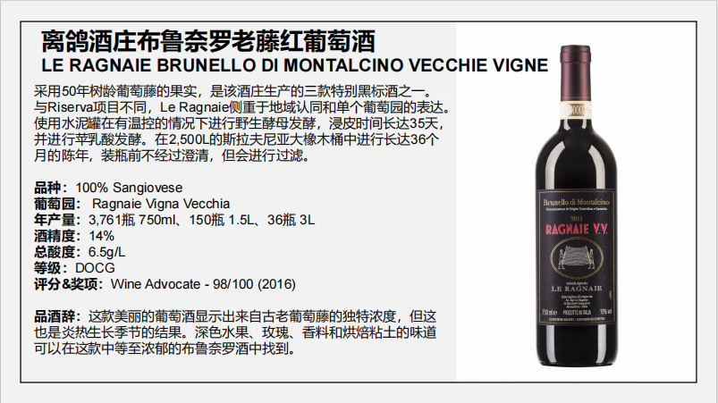 【98 分蒙塔奇诺老藤干红】Le Ragnaie Brunello Di Montalcino Vecchie Vigne 2018 750Ml