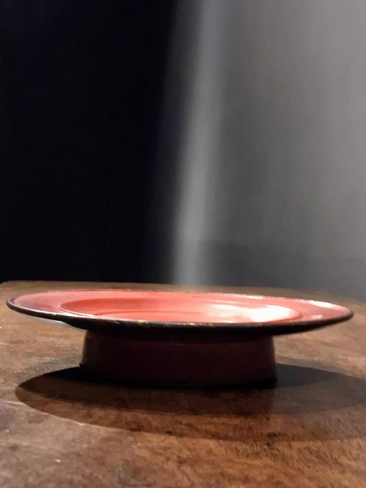 这件承盘是一整块实木琢磨成型后施大漆成器,盘内饰朱红大漆,口边减地凸沿贴金箔(已大部分脱落),背面与高足涂黑色大漆,虽形制简约却细节精美,是高端漆器。入手可当茶席点心盘或小器物展座,也可盛小餐点当出色之餐桌美器。