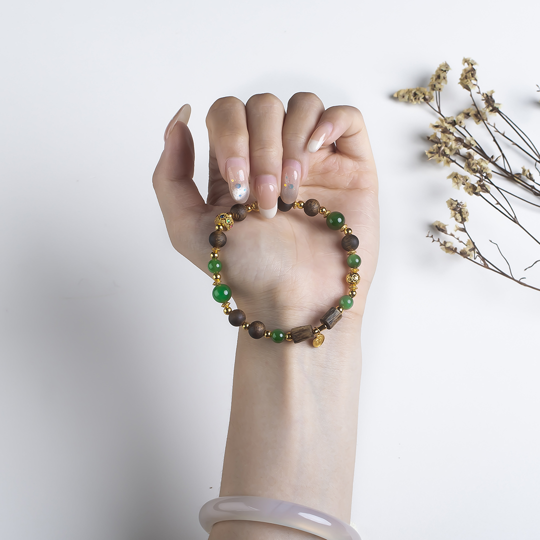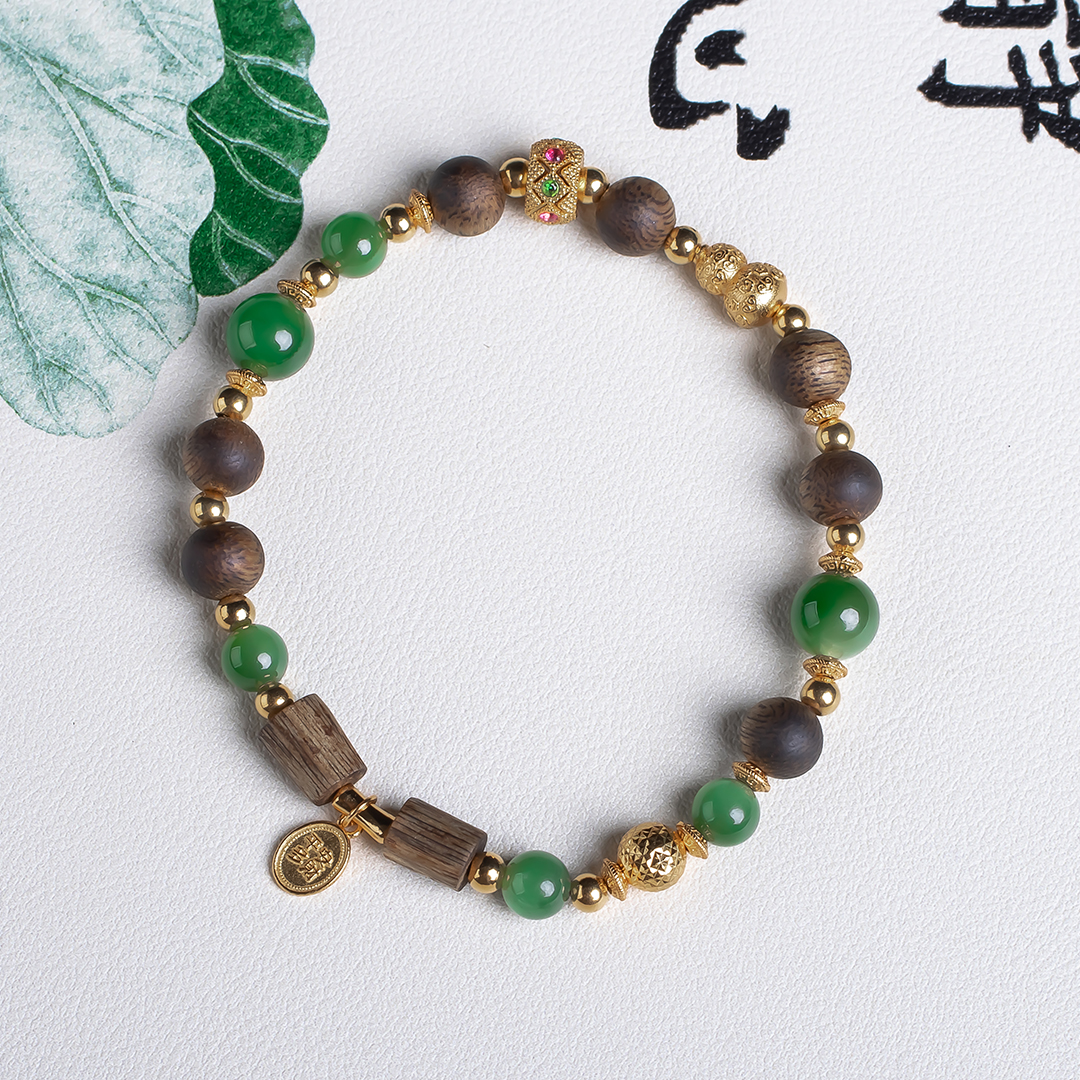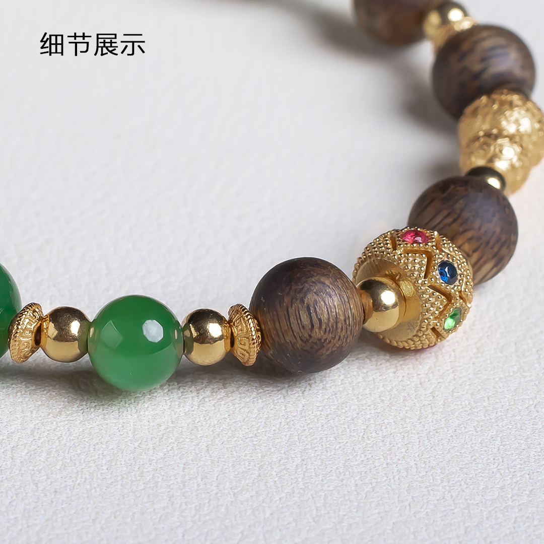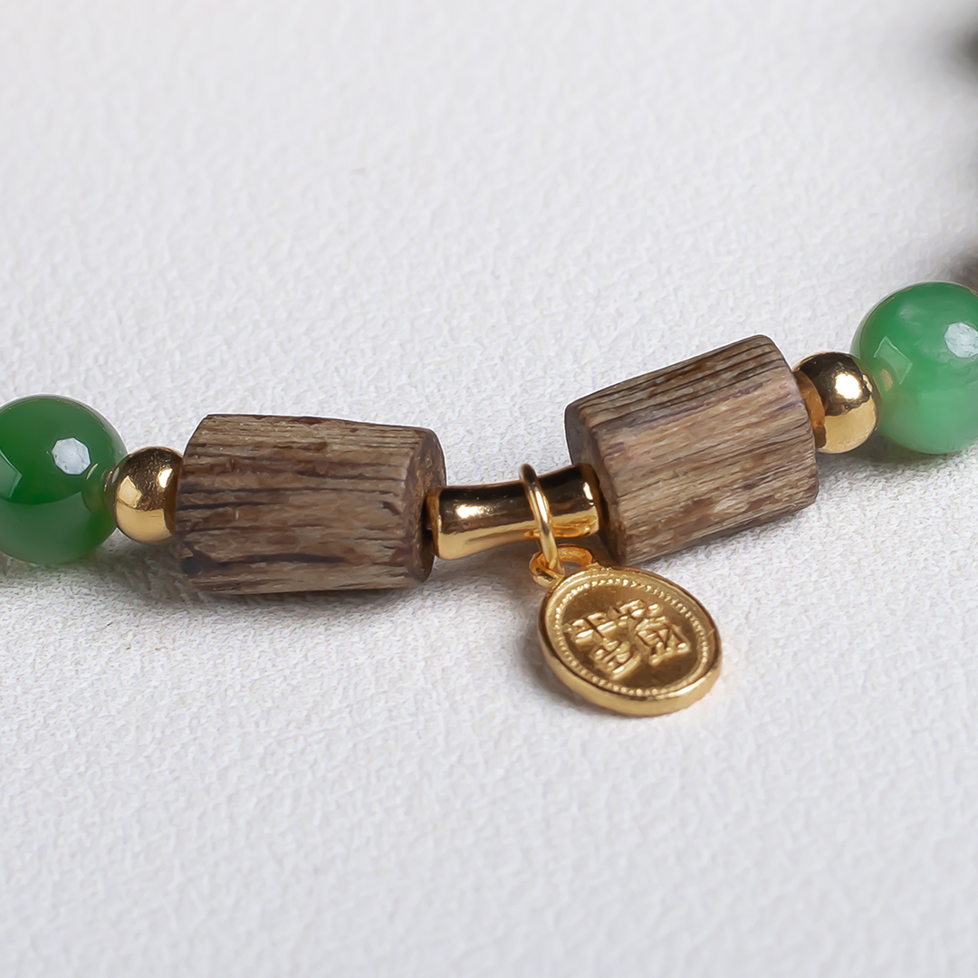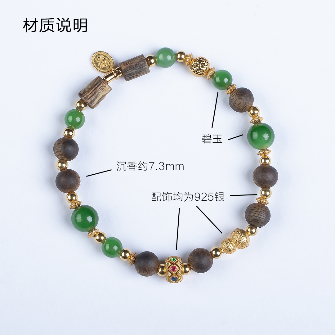 xy0559沉香+碧玉手串,天然沉香约7.3mm,原色原味,香味自然清甜,圆珠与随形桶珠结合穿搭,个性新颖,古风中展示个人气质魅力,上手富贵感十足。