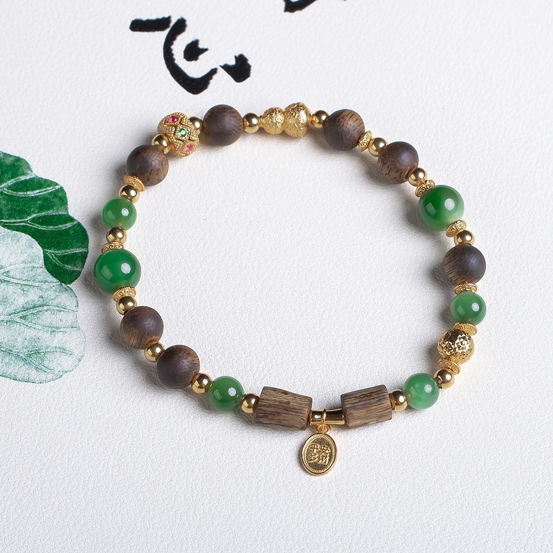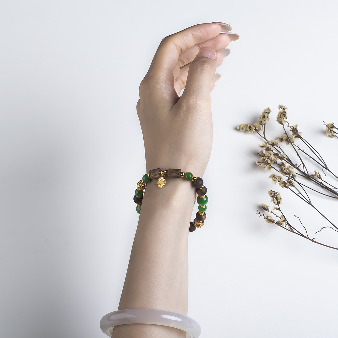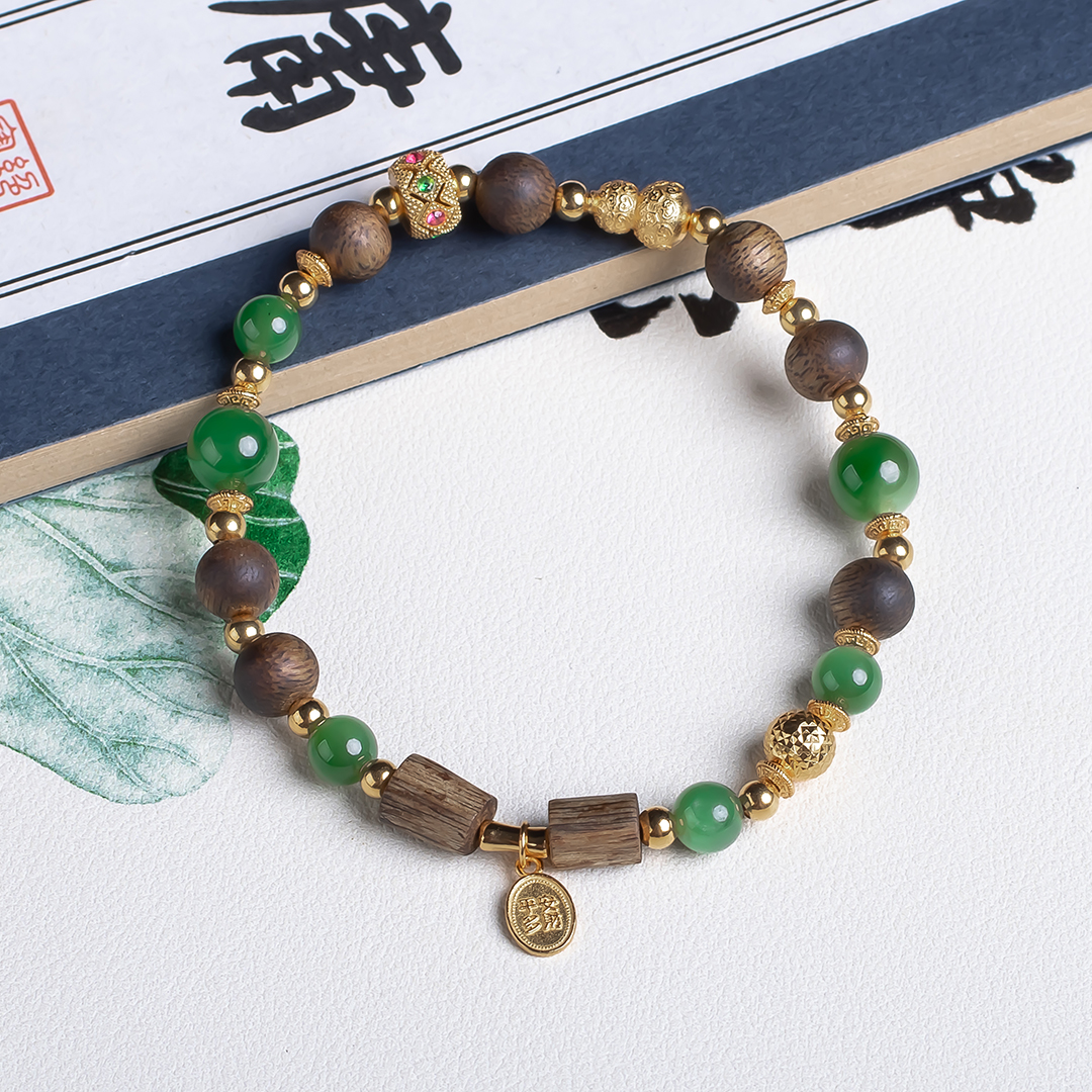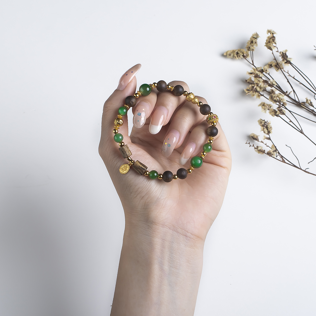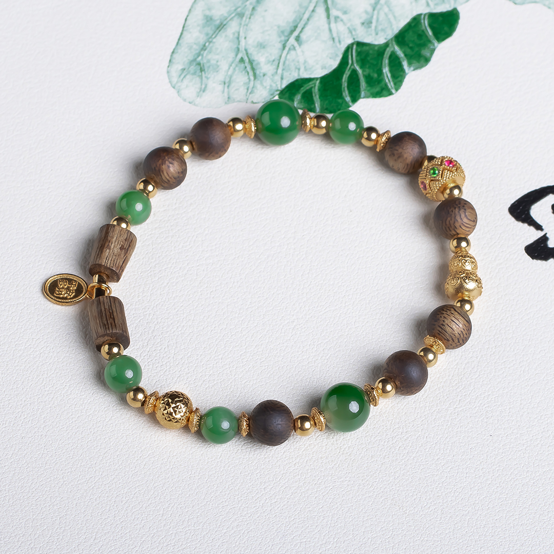 xy0559沉香+碧玉手串,天然沉香约7.3mm,原色原味,香味自然清甜,圆珠与随形桶珠结合穿搭,个性新颖,古风中展示个人气质魅力,上手富贵感十足。