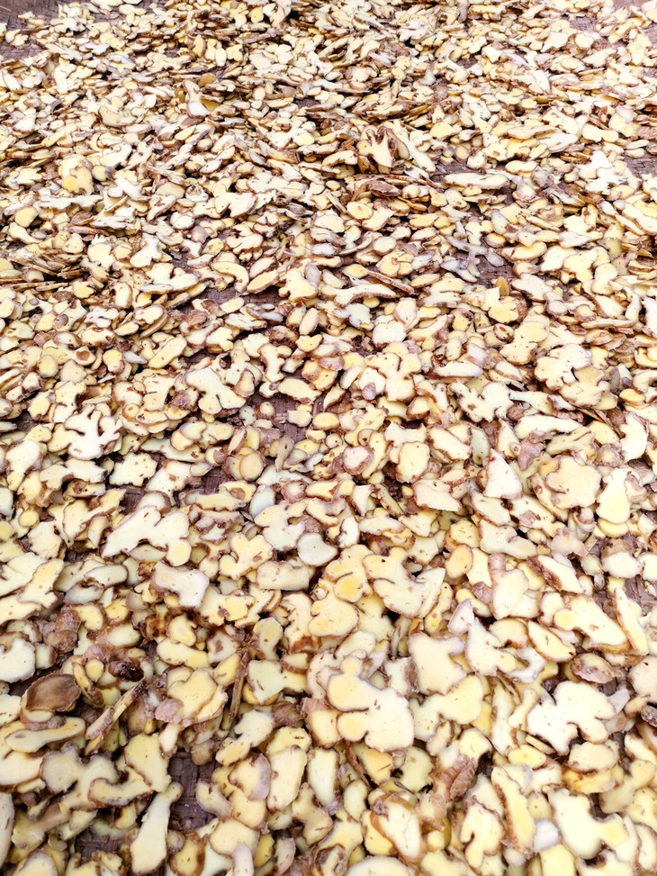 九蒸九晒的姜粉是指姜经过蒸晒,再蒸再晒,反复蒸晒九次制作而成,然后把姜磨成粉(细度200目以上,比面粉还细,更容易吸收),这才称为九蒸九晒姜粉,经过蒸晒,使姜变的更加温和,而且吸收太阳的能量,对身体大有裨益,还有产量非常低,大概12斤鲜姜才能制作一斤左右,天气好需要半个月才能制作完成,我们的姜已经从普通的姜变成一种保健产品。