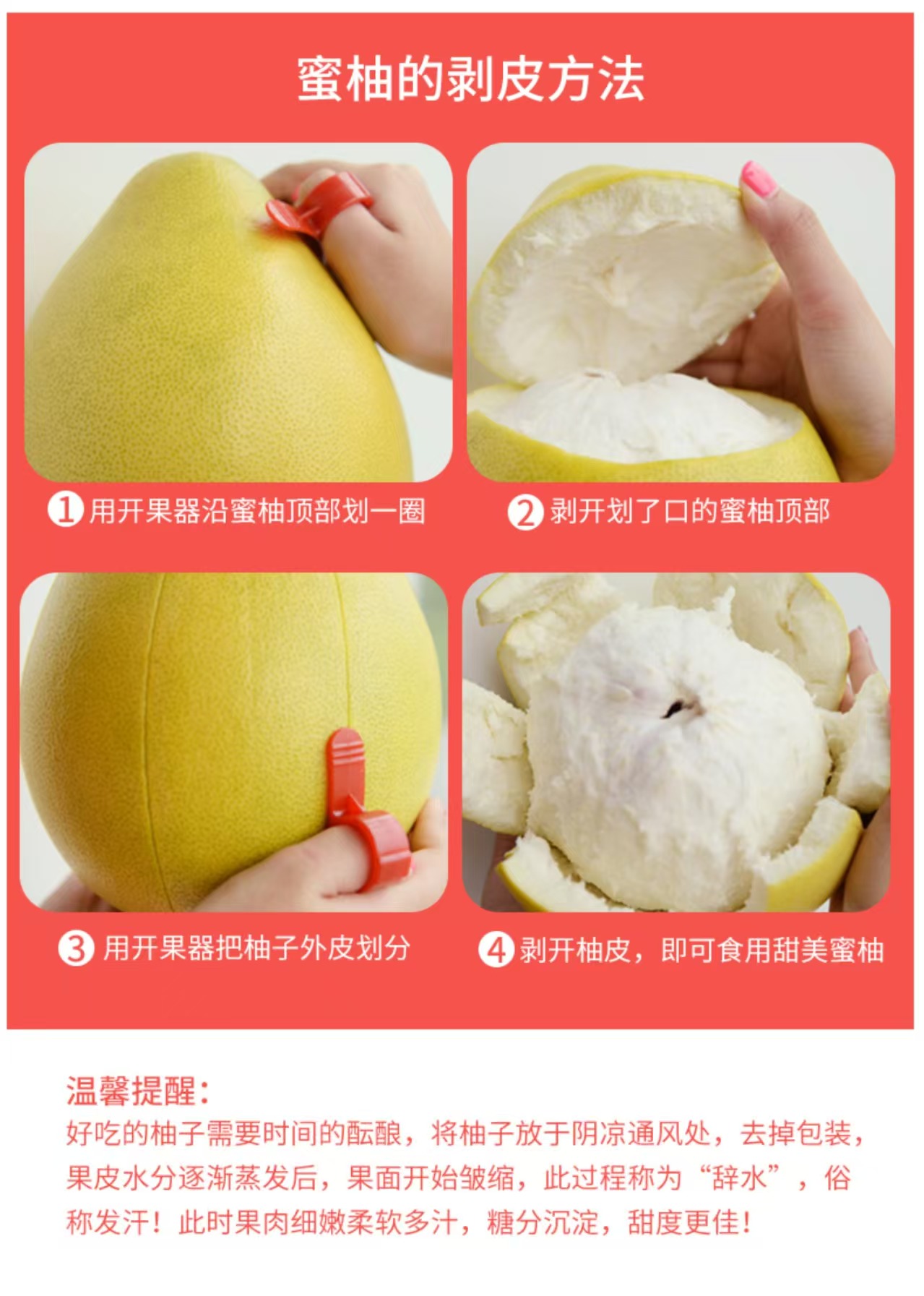 | 【品名】福建平和三红蜜柚//红心蜜柚随机发 【规格】 2个家庭装(4.5-5斤) 3-4个家庭装(8.5-9斤) 2个礼盒装(4.5-5斤) 3-4个礼盒装(8.5-9斤) 【包装】纸箱 【储藏条件】请置于通风、常温处 【产地】福建平和 【发货地】广东/广西/福建 【发货快递】韵达/中通 【不发货区域】新疆、西藏、内蒙古、甘肃、青海、宁夏、黑龙江、吉林、辽宁、港澳台不发货 【补邮费地区】海南+3.5元/件,北京、上海、深圳+1元/件 【发货时效】48小时,节假日顺延 【温馨提示】目前包装厂紧急缺货,包装随机发不指定! ⚠️柚子收到注意了:一定要辞水才吃哟,收到不要着急开,拆除所有包装袋常温放至皮有些发皱再吃最好哈,记得一定要拆除所有包装袋,否则辞水不了,辞水后的柚子才会更甜更水哟! |