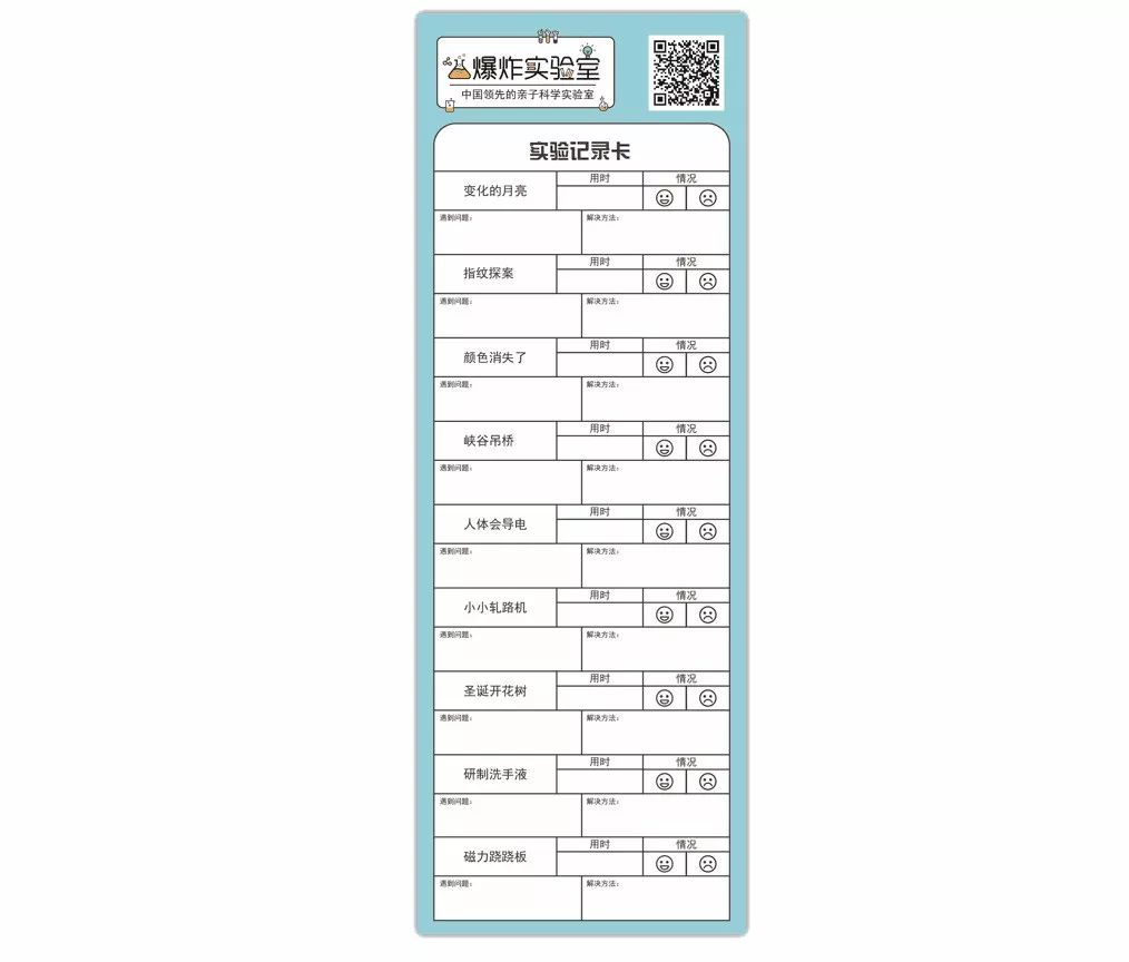 还可以用爆炸盒子中的实验记录卡记录下孩子每次完成实验的时间,成功失败,和遇到的问题。梦想的成功从不是一蹴而就的,坚持和总结可以让孩子走得更远。