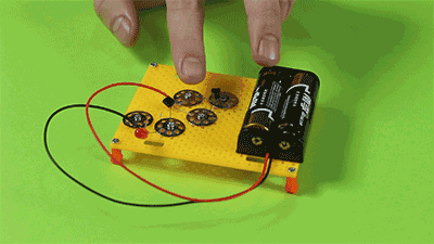 人体会导电实验,和孩子一起DIY电路检测人体导电性,材料中的小灯泡不光可以展现人体导电,把手放在触电板上面,小灯泡发光,还可以帮助孩子观察电荷运行原理,通过实验使孩子对电这个看不见摸不着的物质有初步的了解。