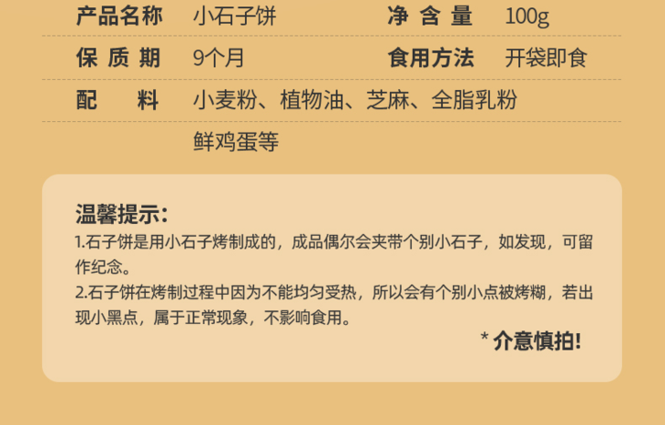 小石子饼是陕西小特产,豫北的阳光小麦粉,谷物香真的超浓,配料表也是干净到一眼就能看透!面粉低温发酵24小时,口感更酥更脆,咬下去层次分明,越嚼越有味。而且它用的是追溯到旧石器时代的石烹技术,两层鹅卵石恒温烘烤,不是油炸也不是膨化,满满醇厚麦香,完全不油腻,全家都能吃,0香精、0防腐、0蔗糖、0起酥油,还通过了CMA 26项安全检测,放心啃!