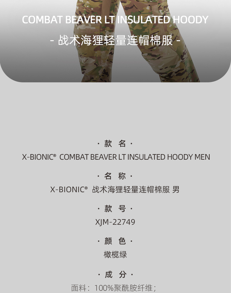 X-BIONIC 战术系列 男子海狸轻量连帽棉服 户外保暖外套 XJM22749
