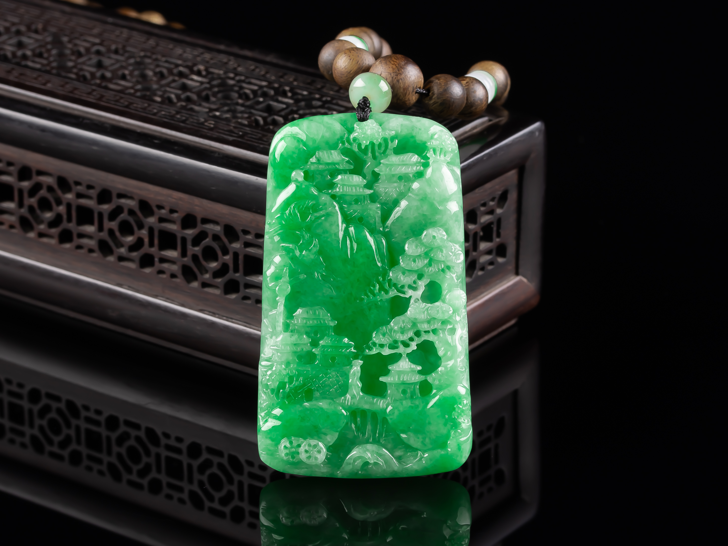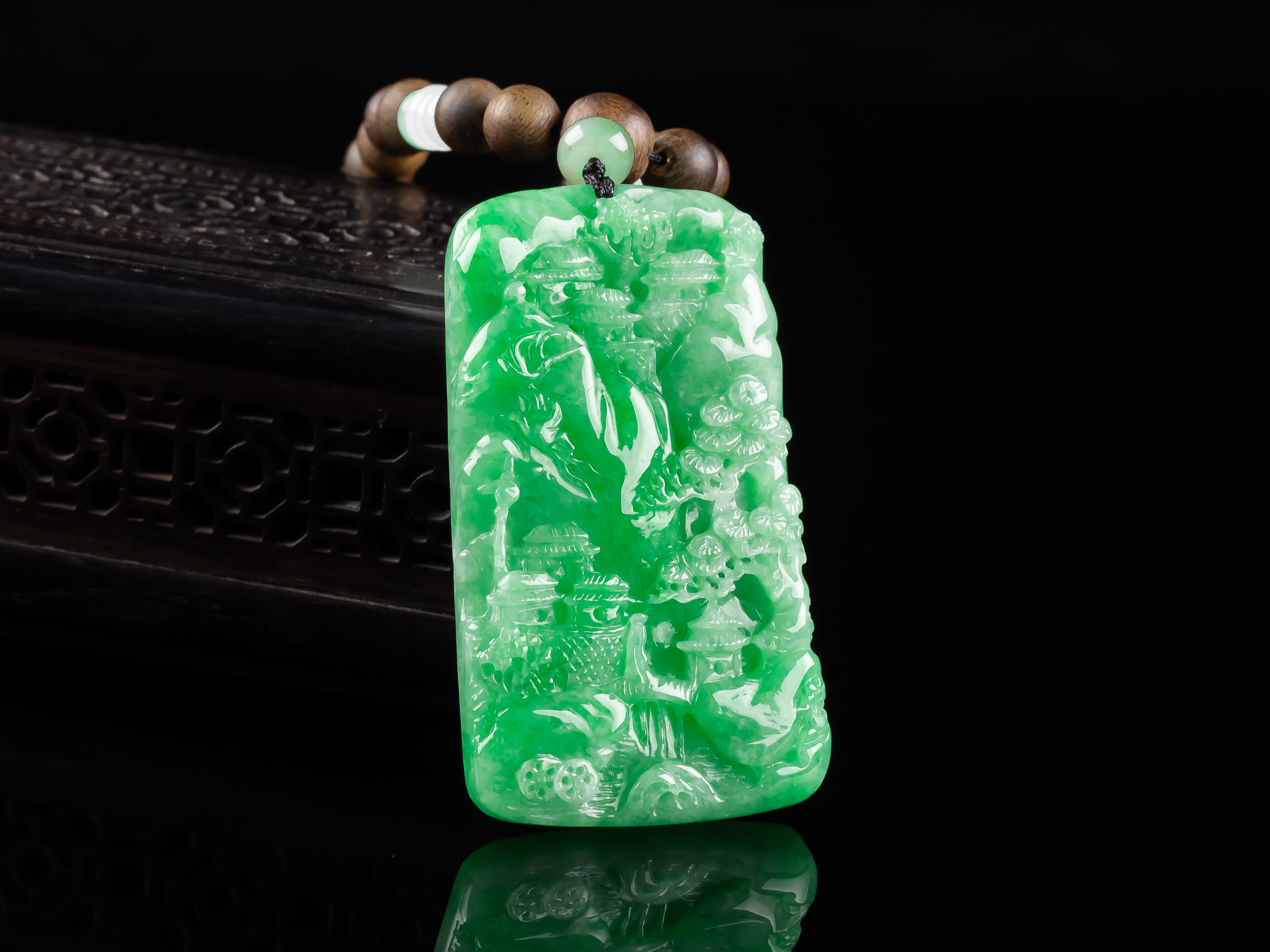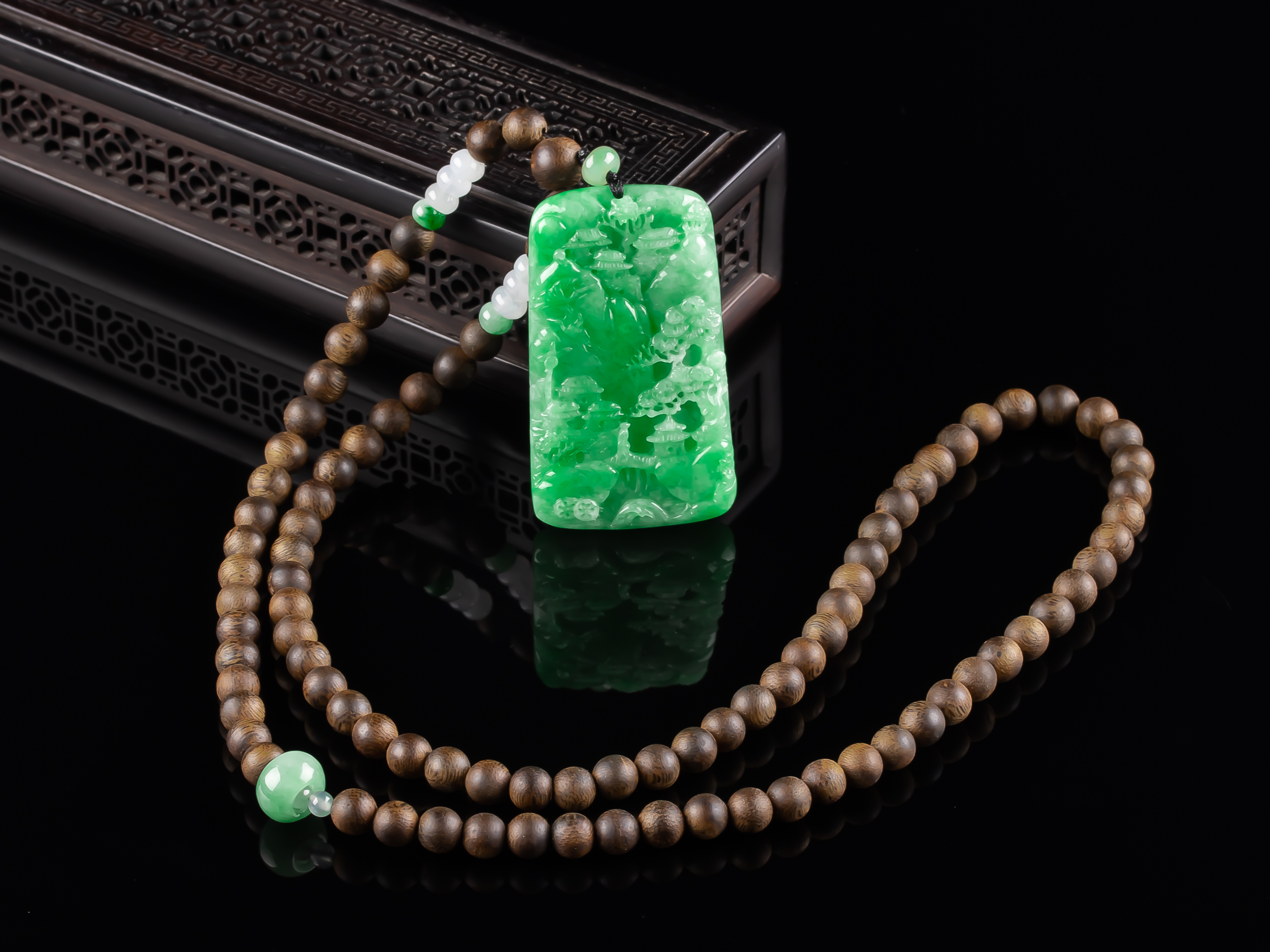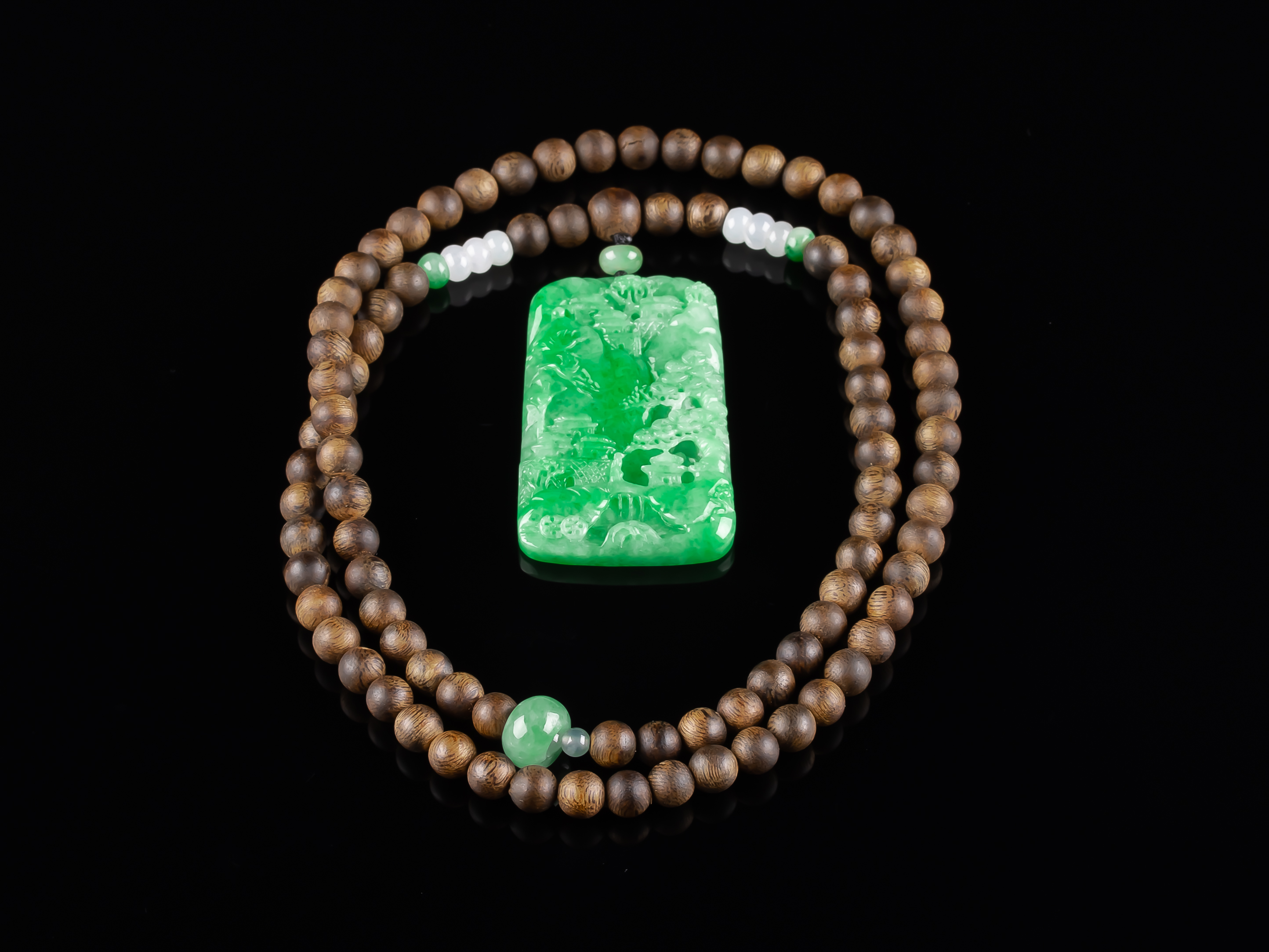 原创 沉香+阳绿翡翠山水牌挂件,天然沉香圆珠7.5mm,原色原味,香味清甜自然,阳绿色翡翠山水牌,35*60*6.6mm,雕刻精细,完美无裂,款式大方,古色古香。