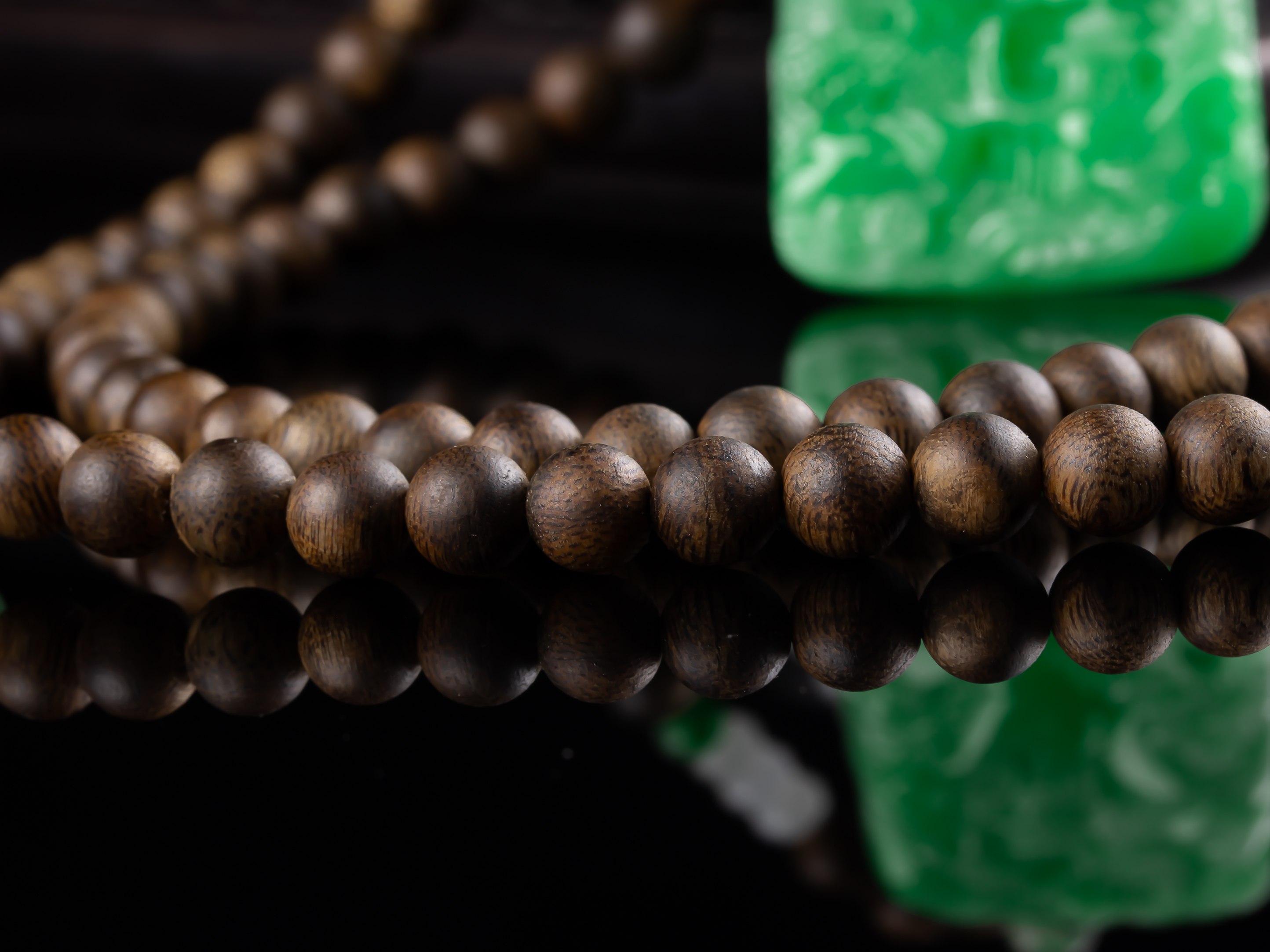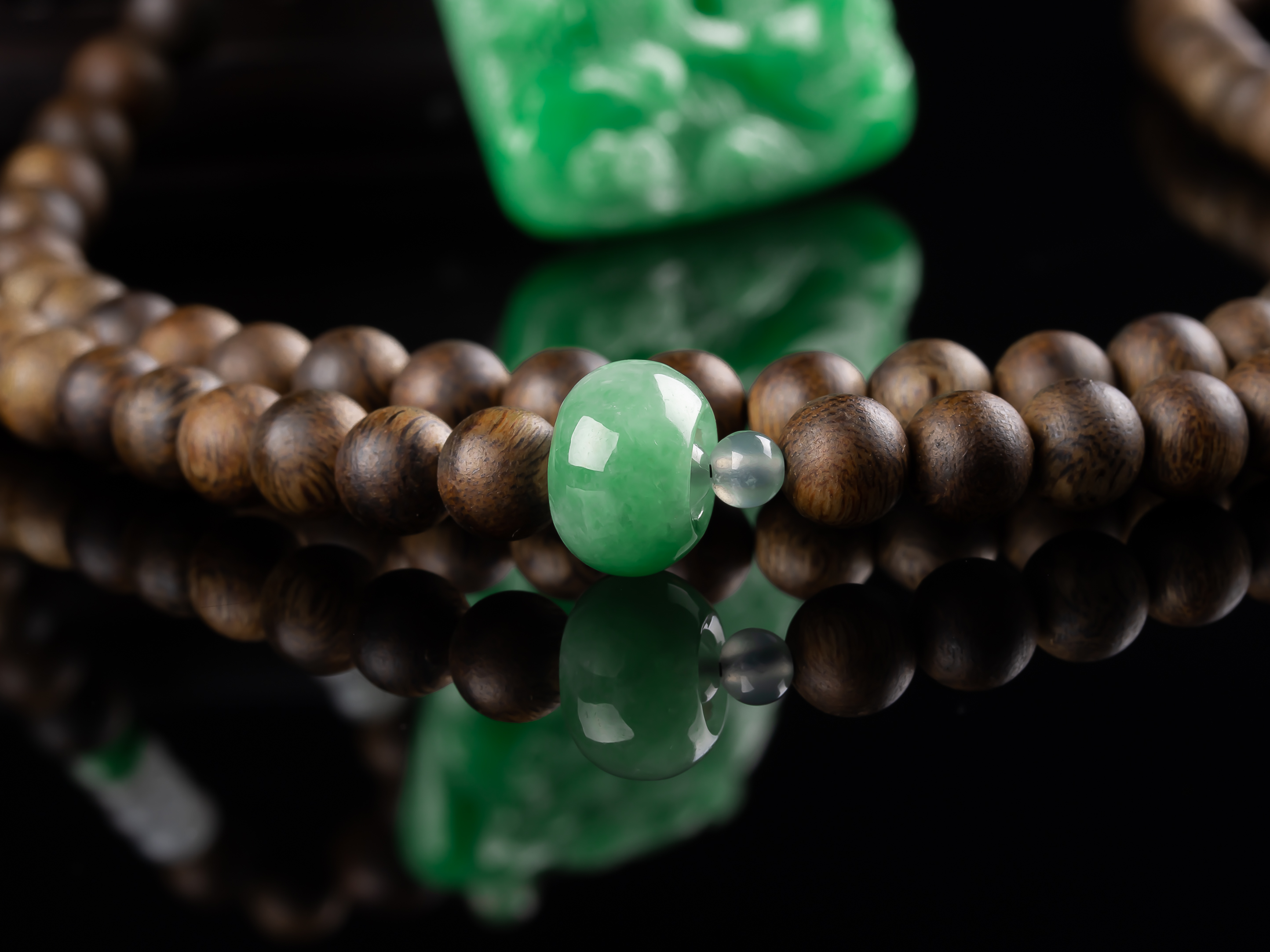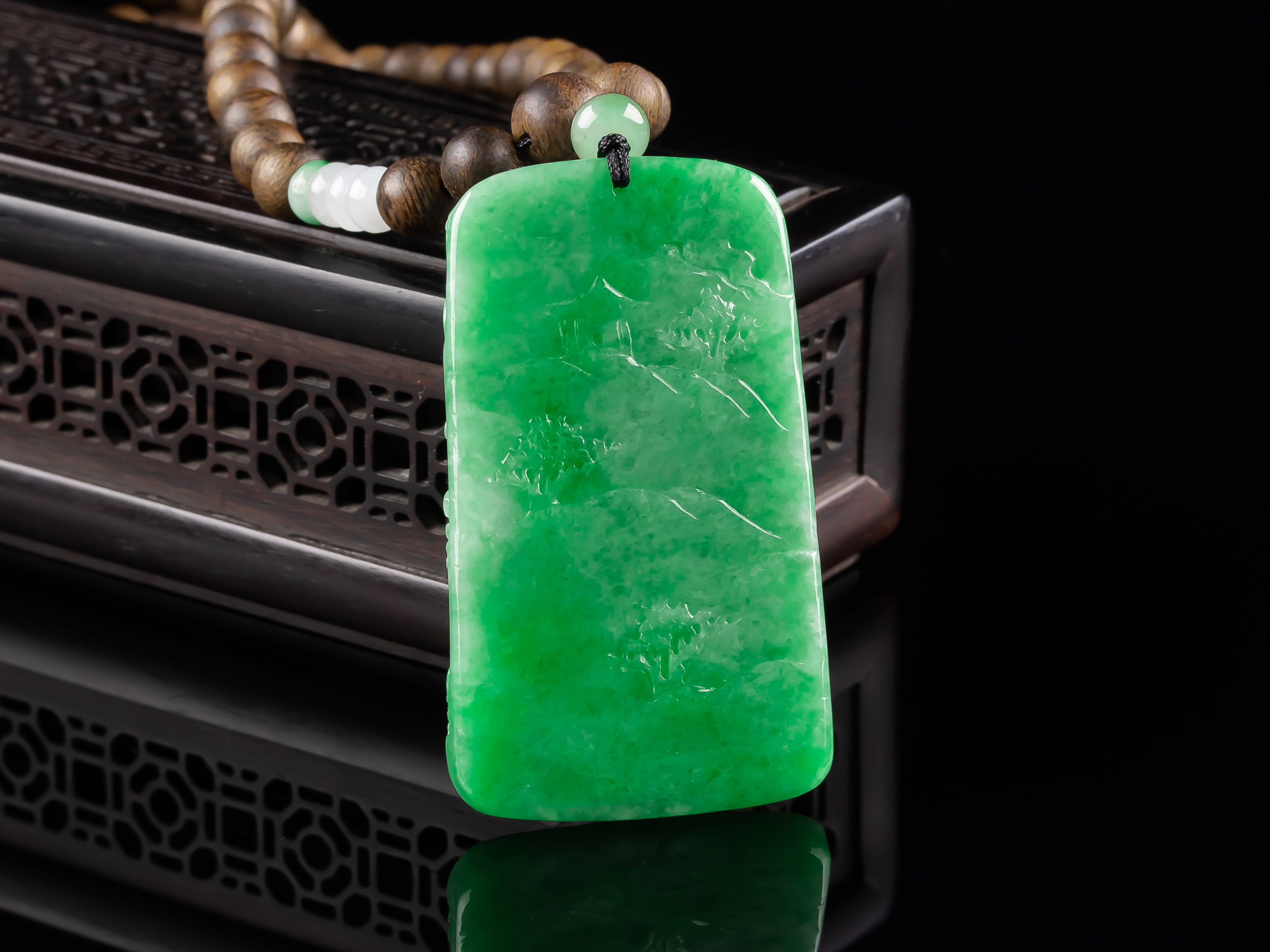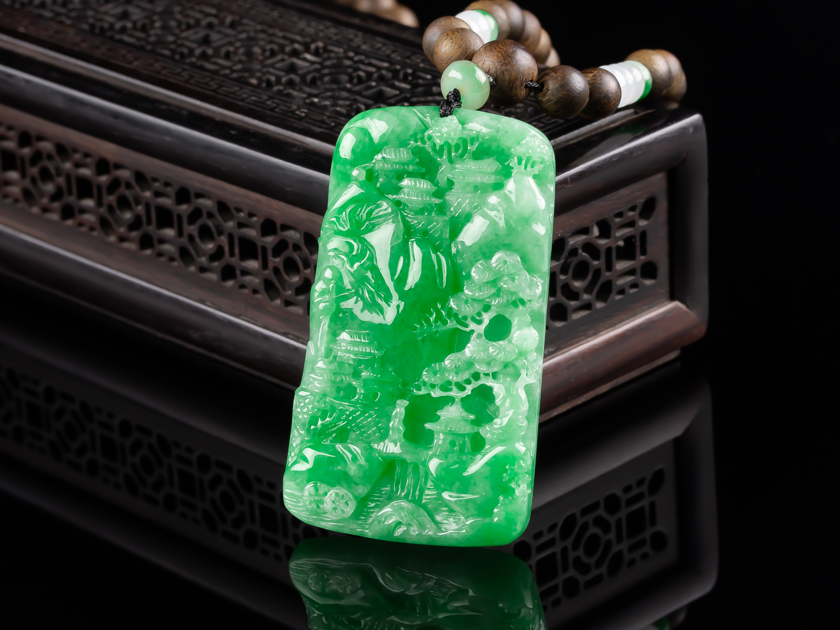 原创 沉香+阳绿翡翠山水牌挂件,天然沉香圆珠7.5mm,原色原味,香味清甜自然,阳绿色翡翠山水牌,35*60*6.6mm,雕刻精细,完美无裂,款式大方,古色古香。
