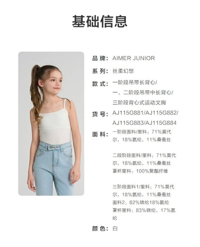 【春上新】8楼爱慕儿童Aimer Kids女孩丝柔幻想一阶段吊带中长背心AJ115G882,吊牌价269元