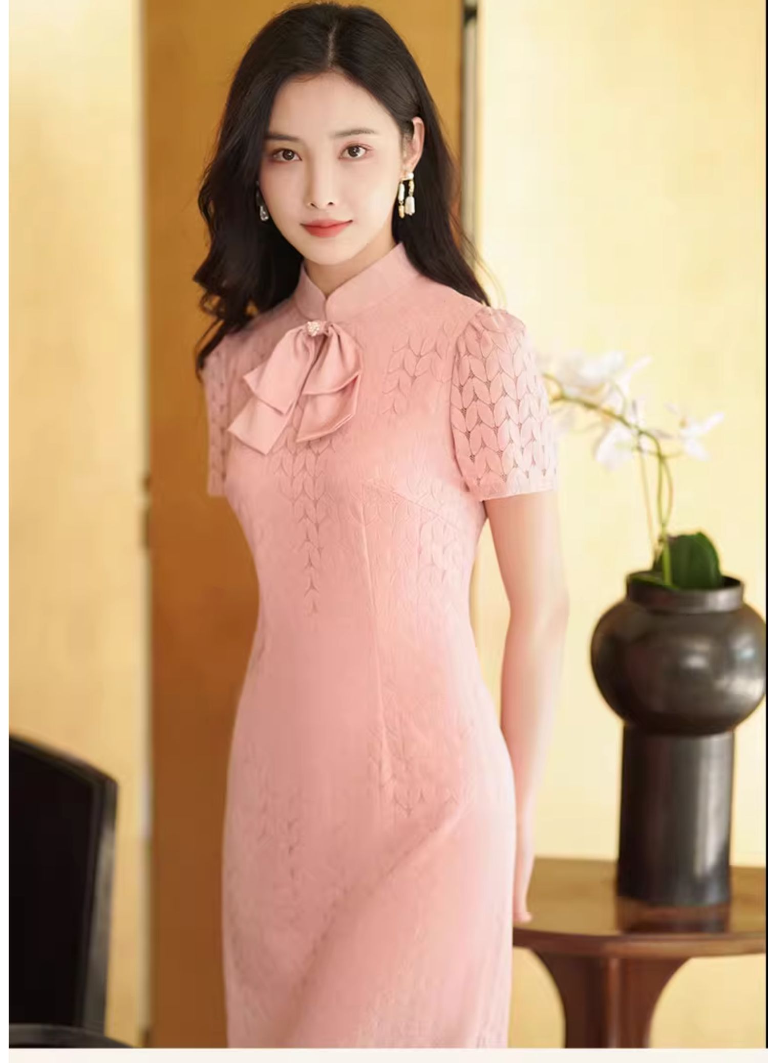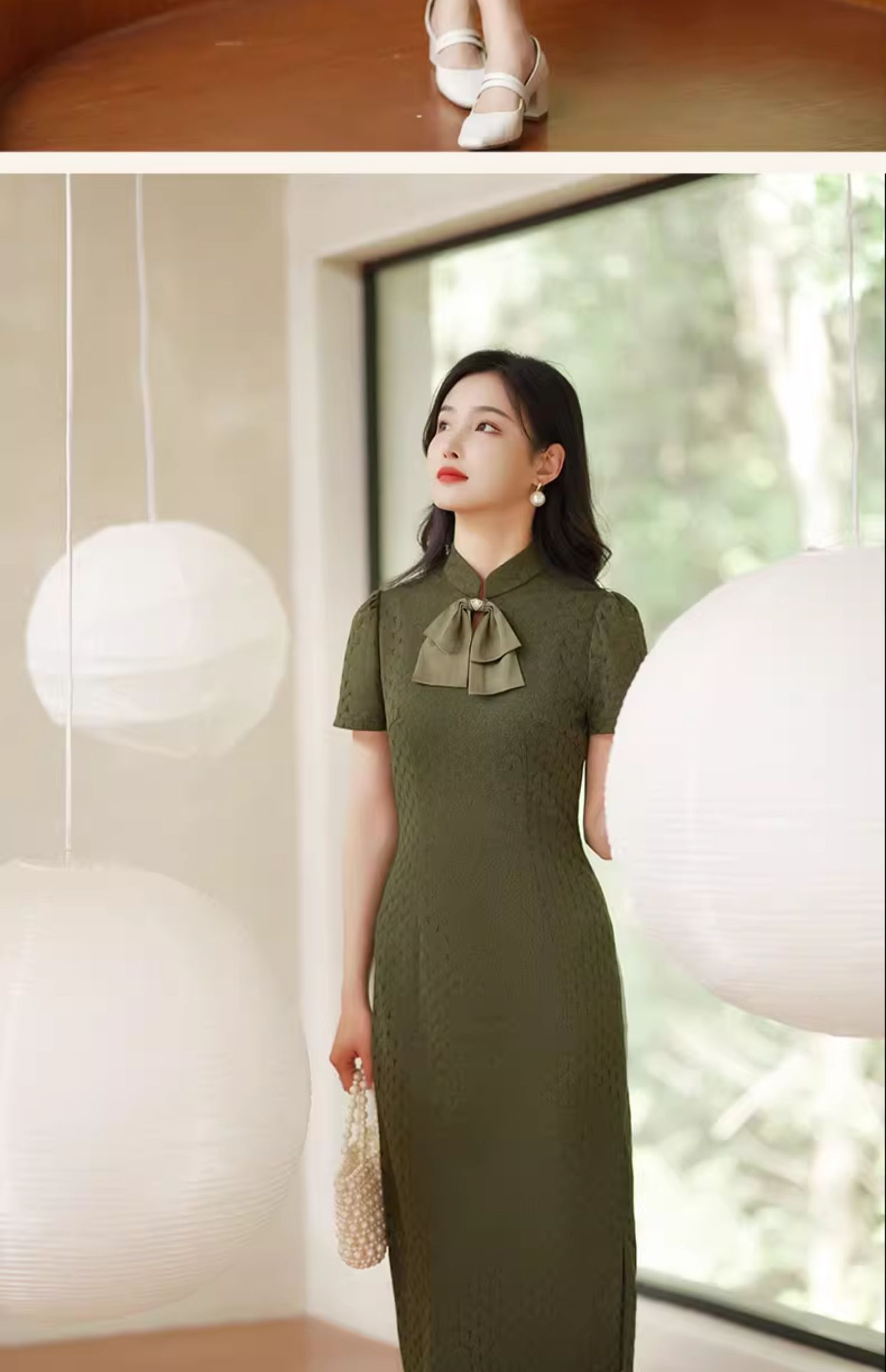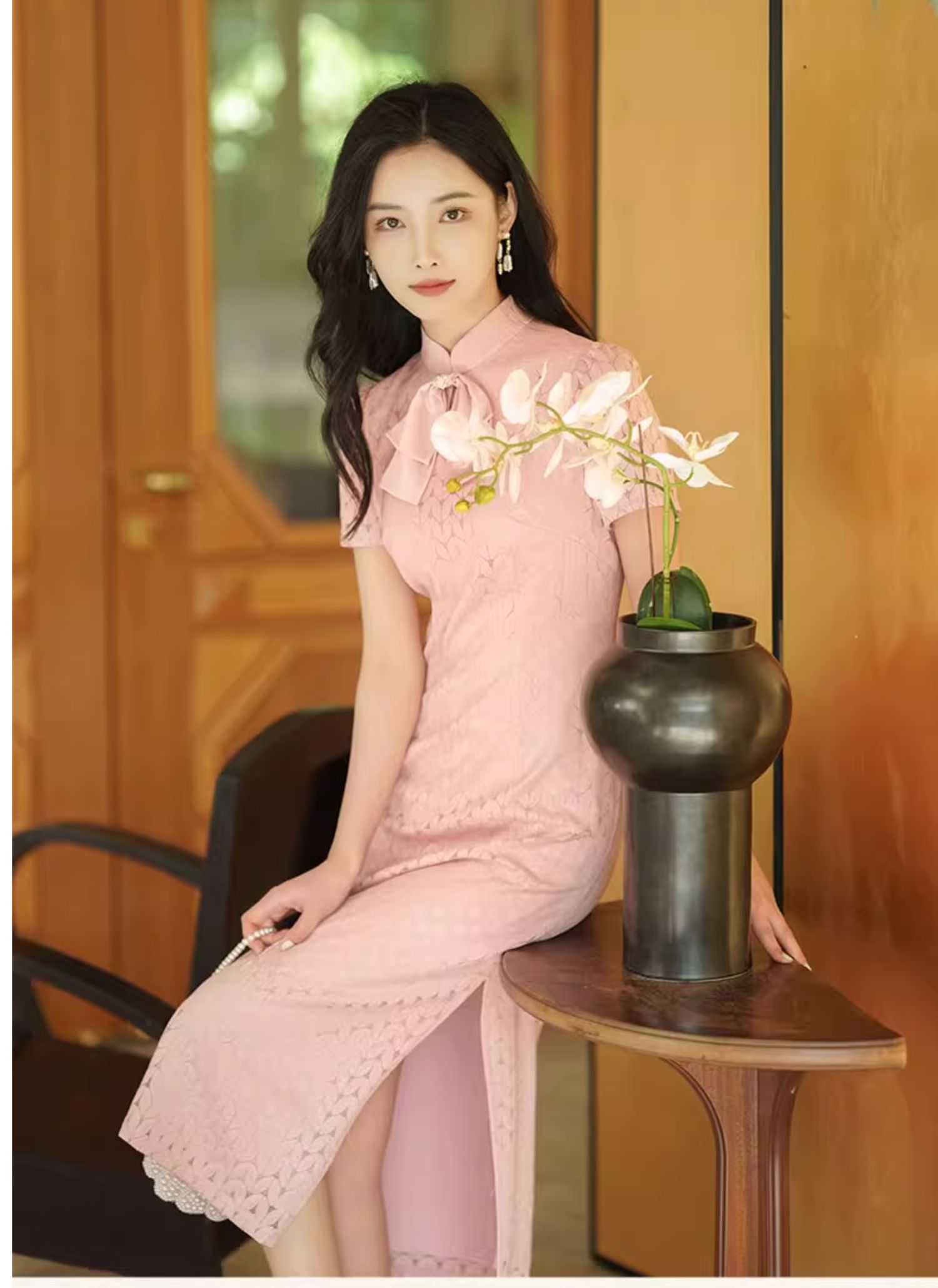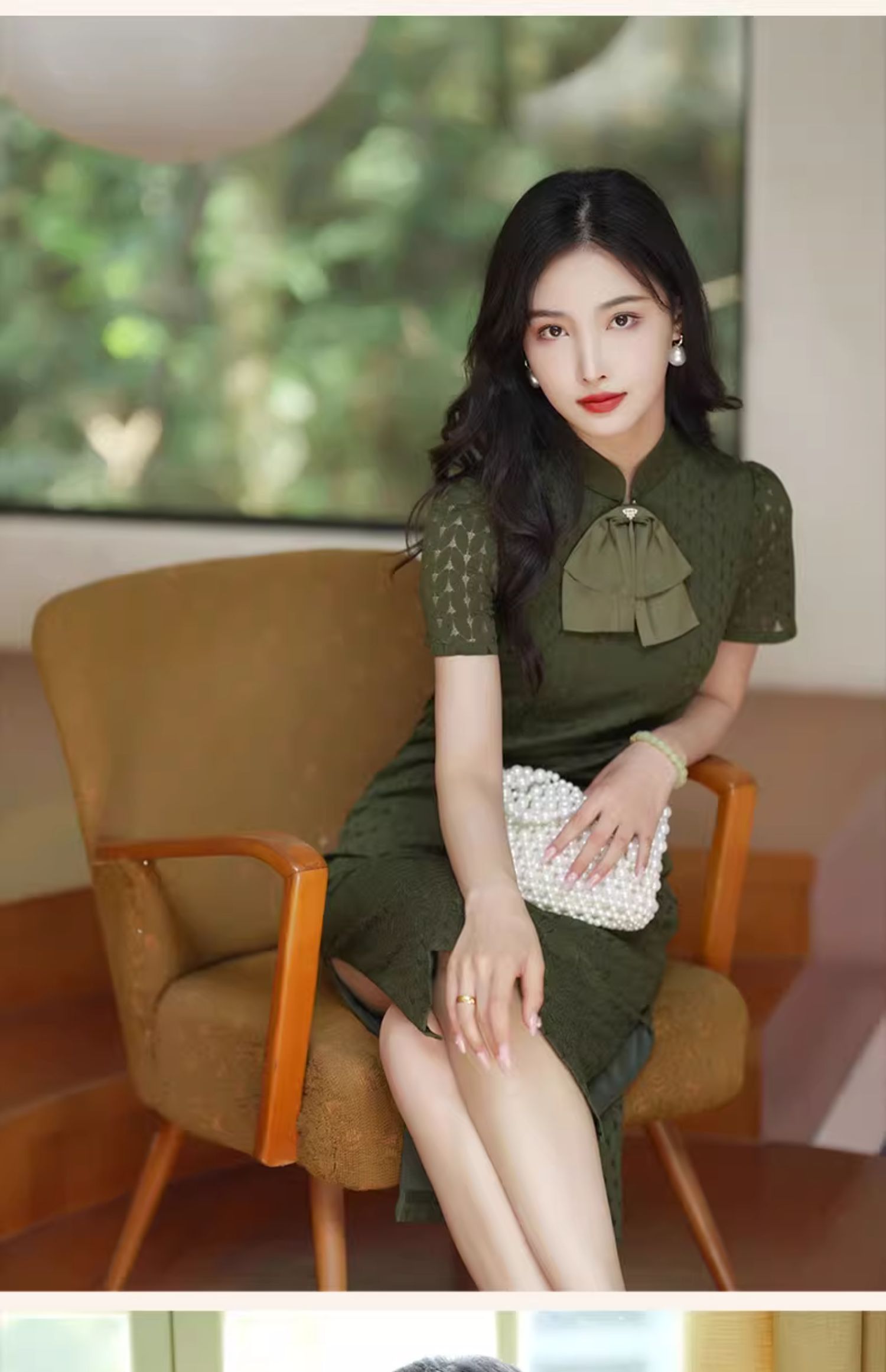 逸红颜苏然2025年夏季新款旗袍改良版连衣裙女蝴蝶结设计蕾丝旗袍