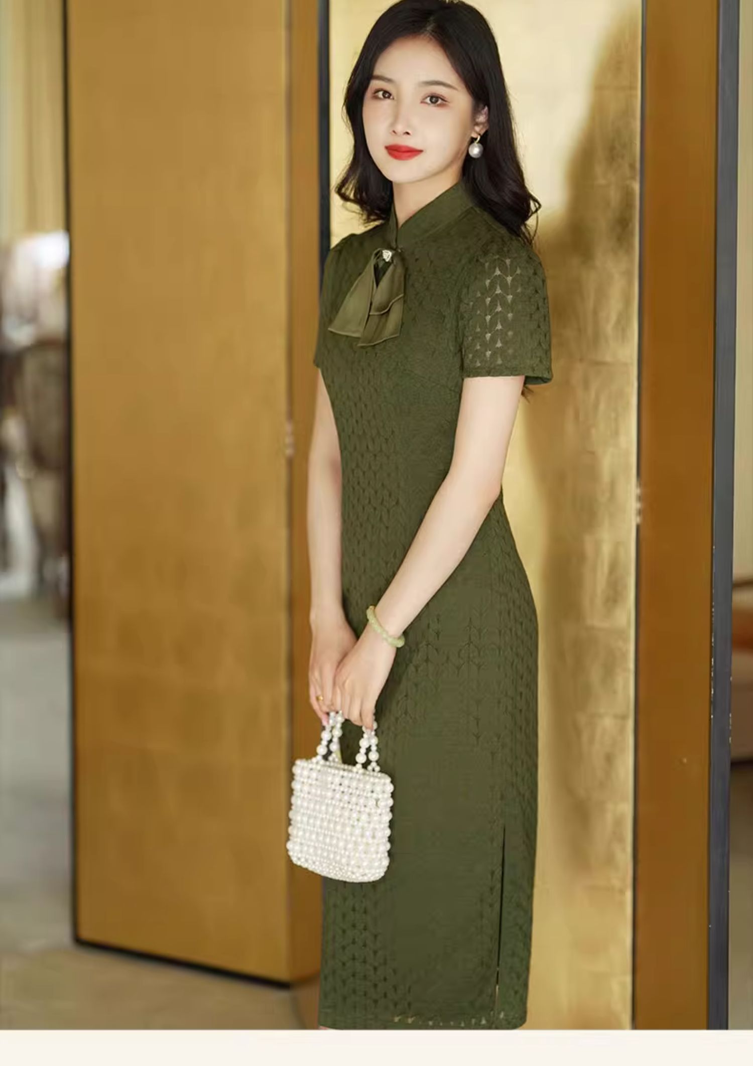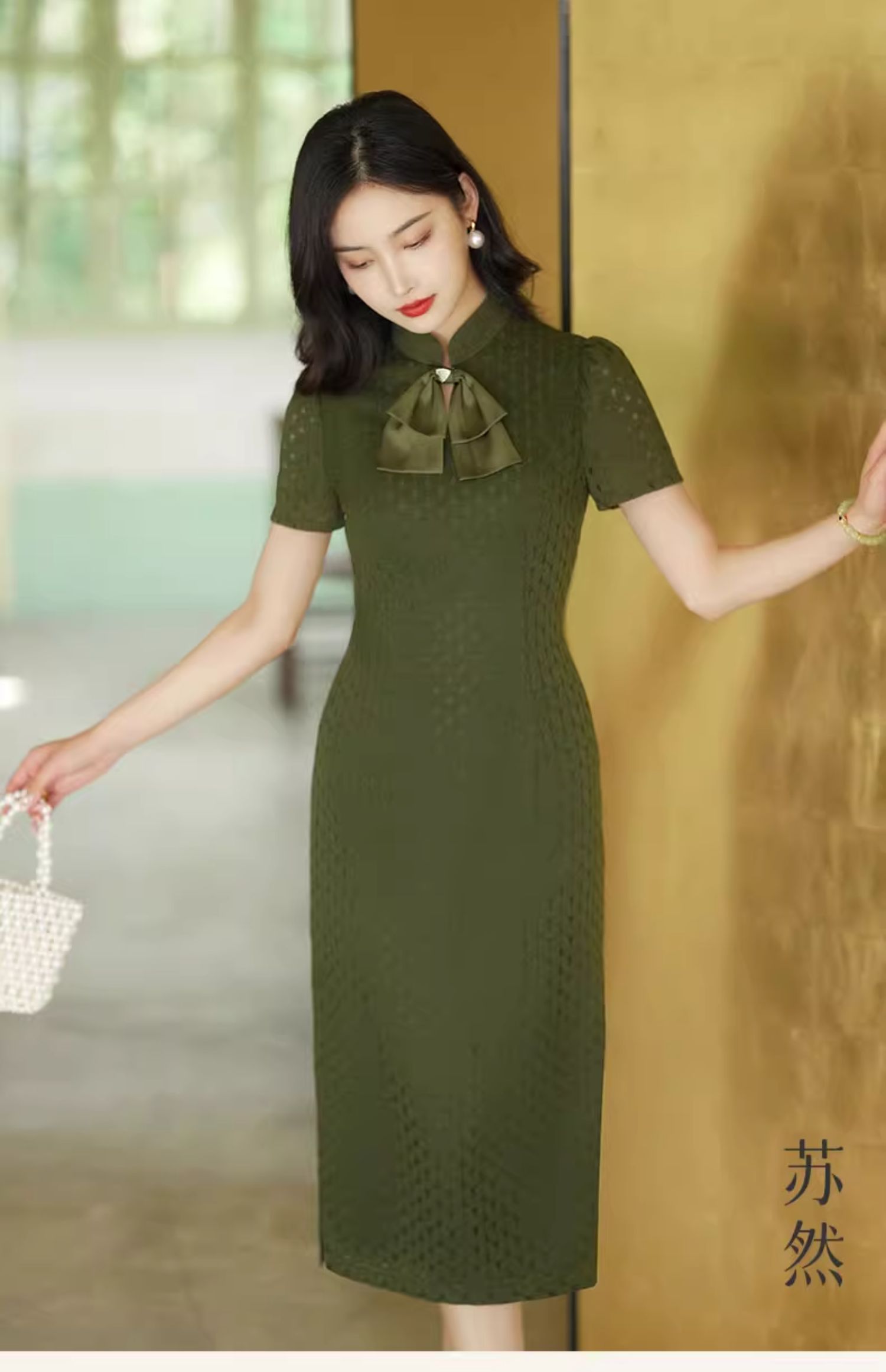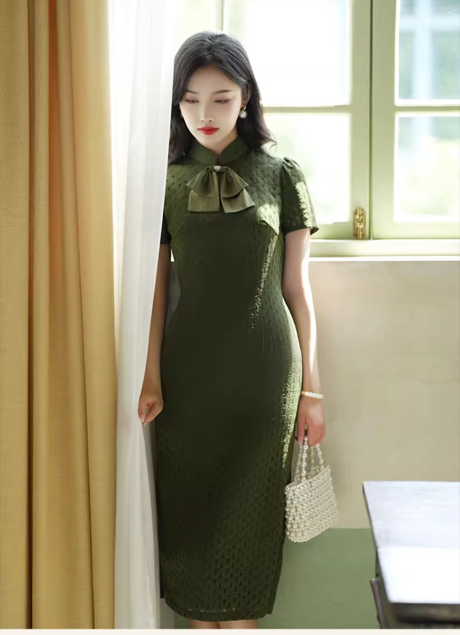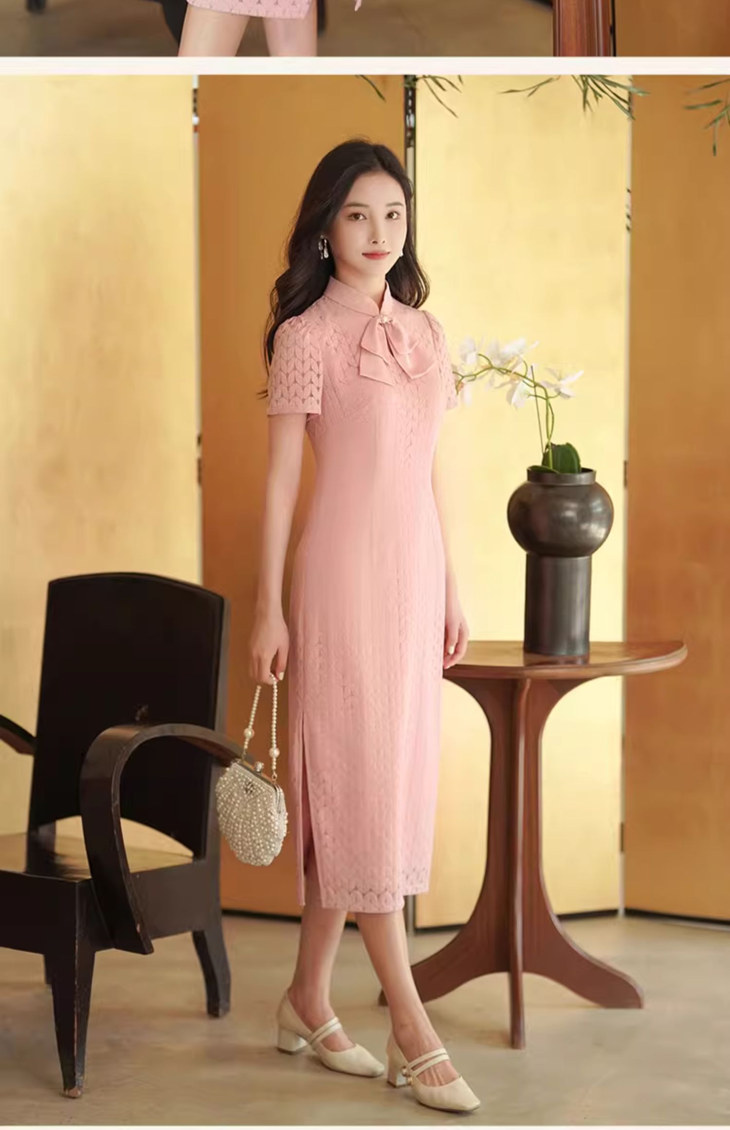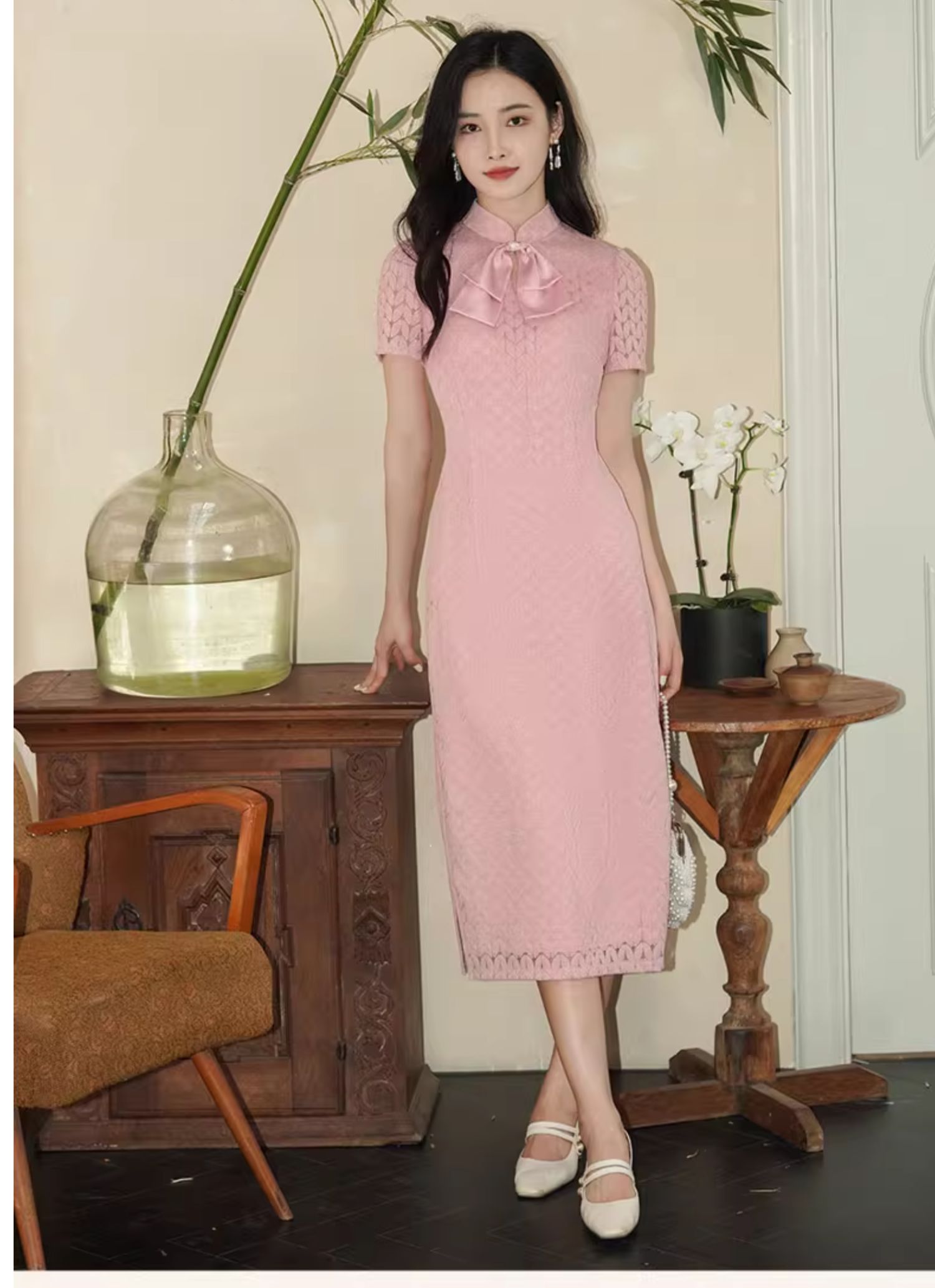 逸红颜苏然2025年夏季新款旗袍改良版连衣裙女蝴蝶结设计蕾丝旗袍