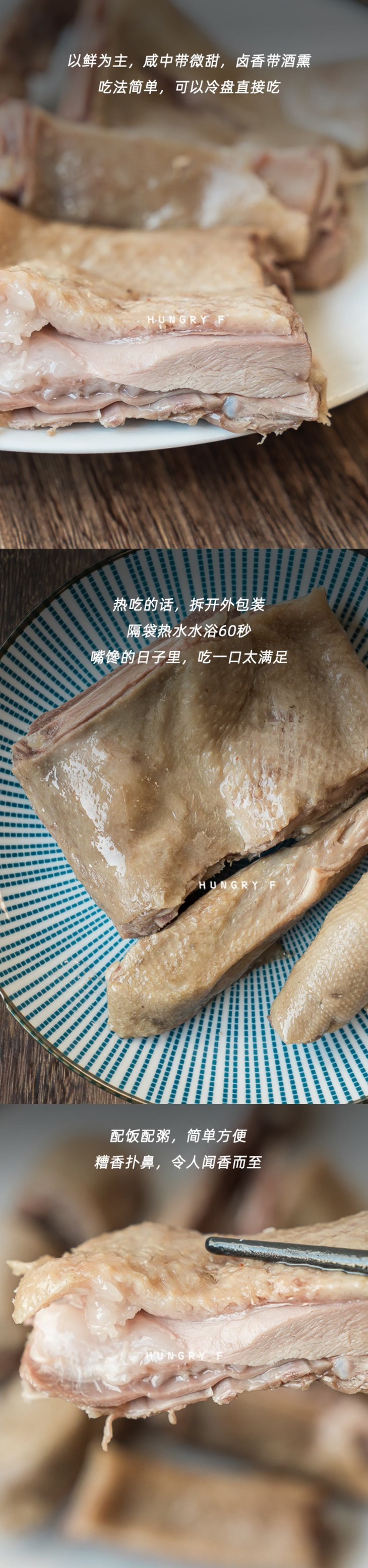 喜欢吃酒糟酒酿类美食的,吃到应该会欣喜,这肉啊,真的大块,但又不会柴,很Juice,鹅皮更是弹弹韧韧,相当有味!可以直接吃,也可以加热,真空袋直接放进热水泡20分钟或者开袋后微波炉叮一会,切一切就可以装盘了,方便又好吃!天气冷了,偶尔偷个懒不想做菜时,一分钟就可以上桌,晚饭轻松解决,简单又美味!