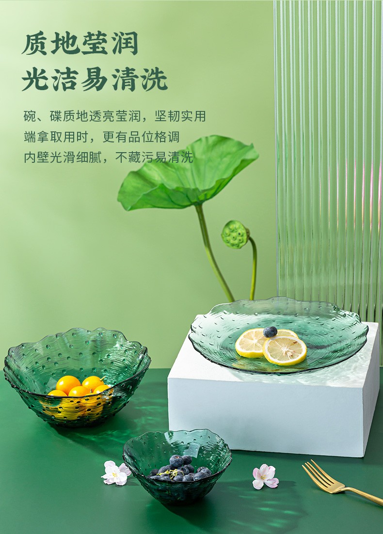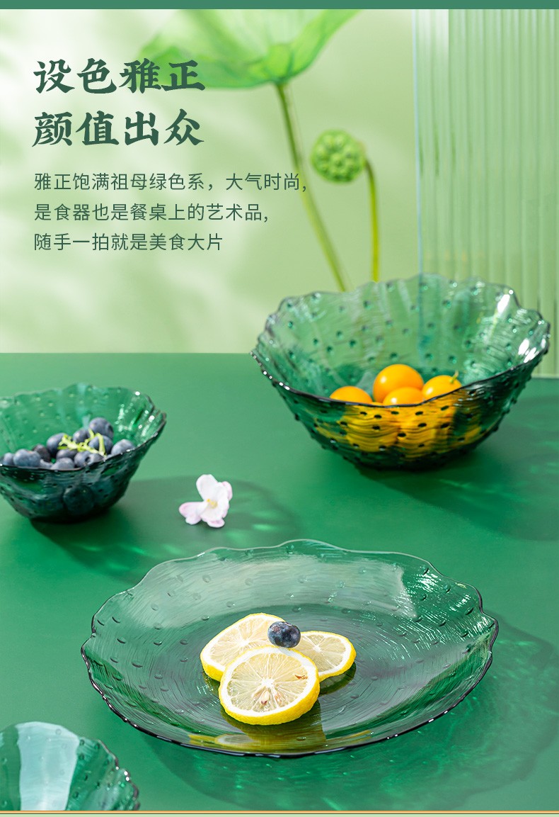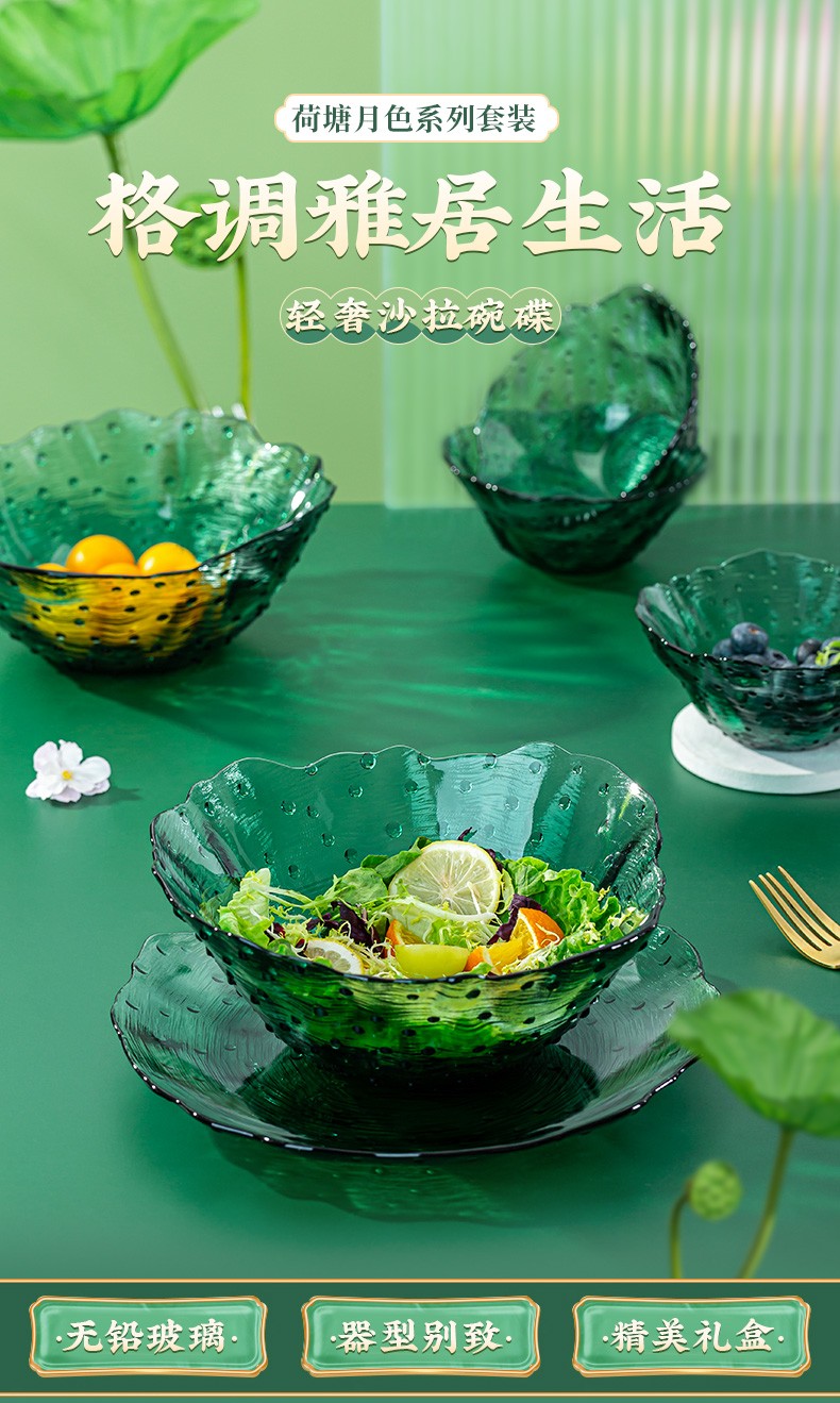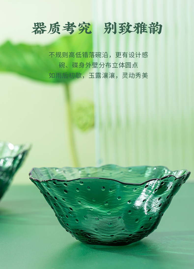 2022新品荷塘月色系列餐饮具碗盘套装ins玻璃祖母绿荷叶清新简约家用碗轻奢 A-W7058-8.5/L4