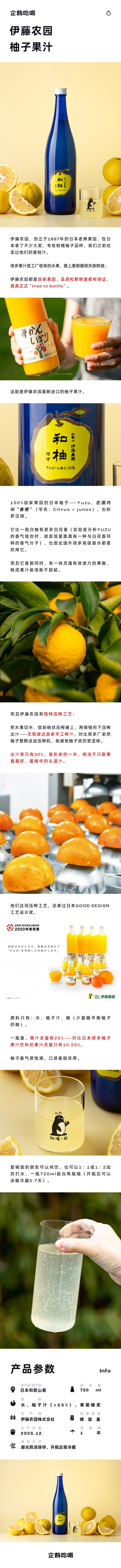 企鹅市集|和歌山县伊藤农园 柚子果汁720ml 罗汉橙白花香 独特压榨工艺 香气饱满口感浓厚