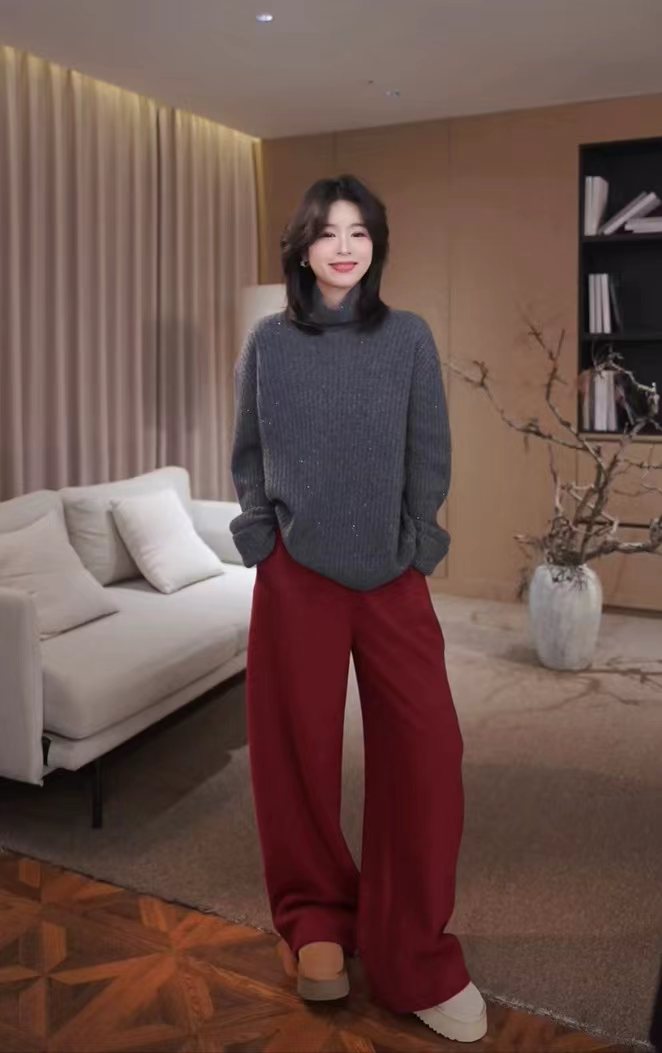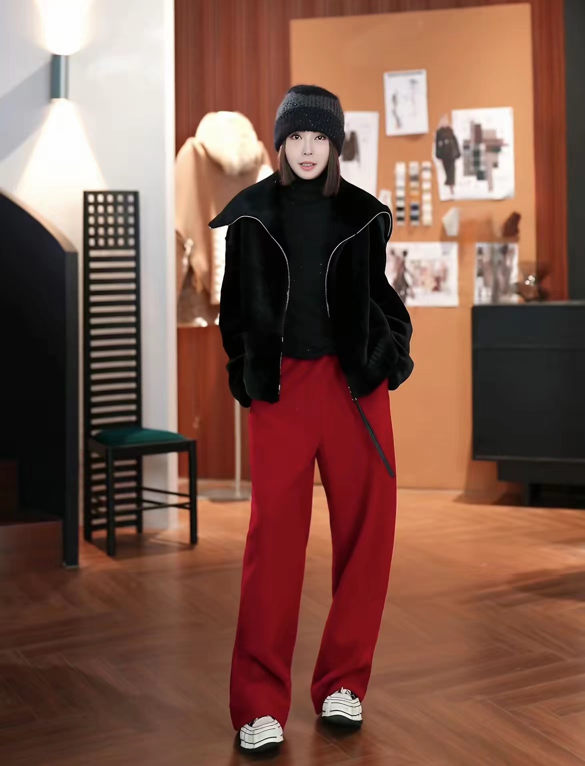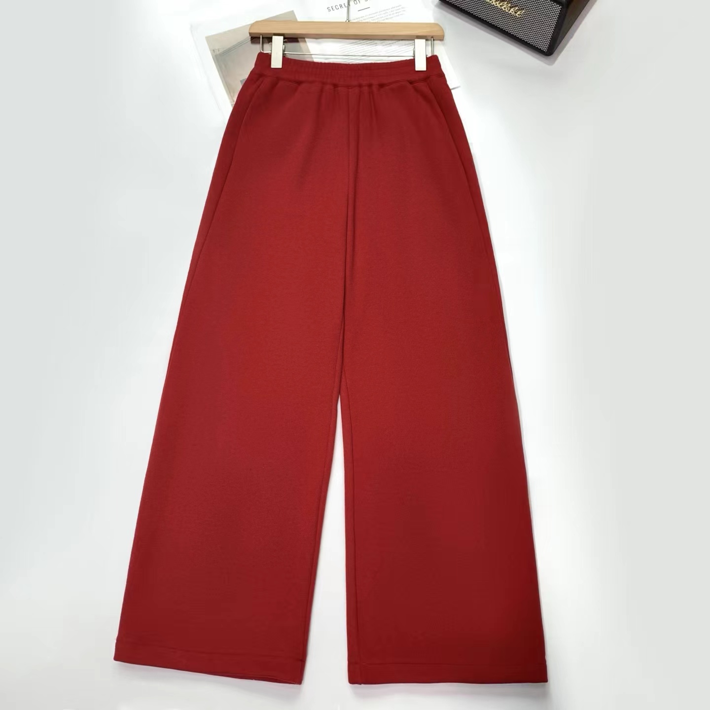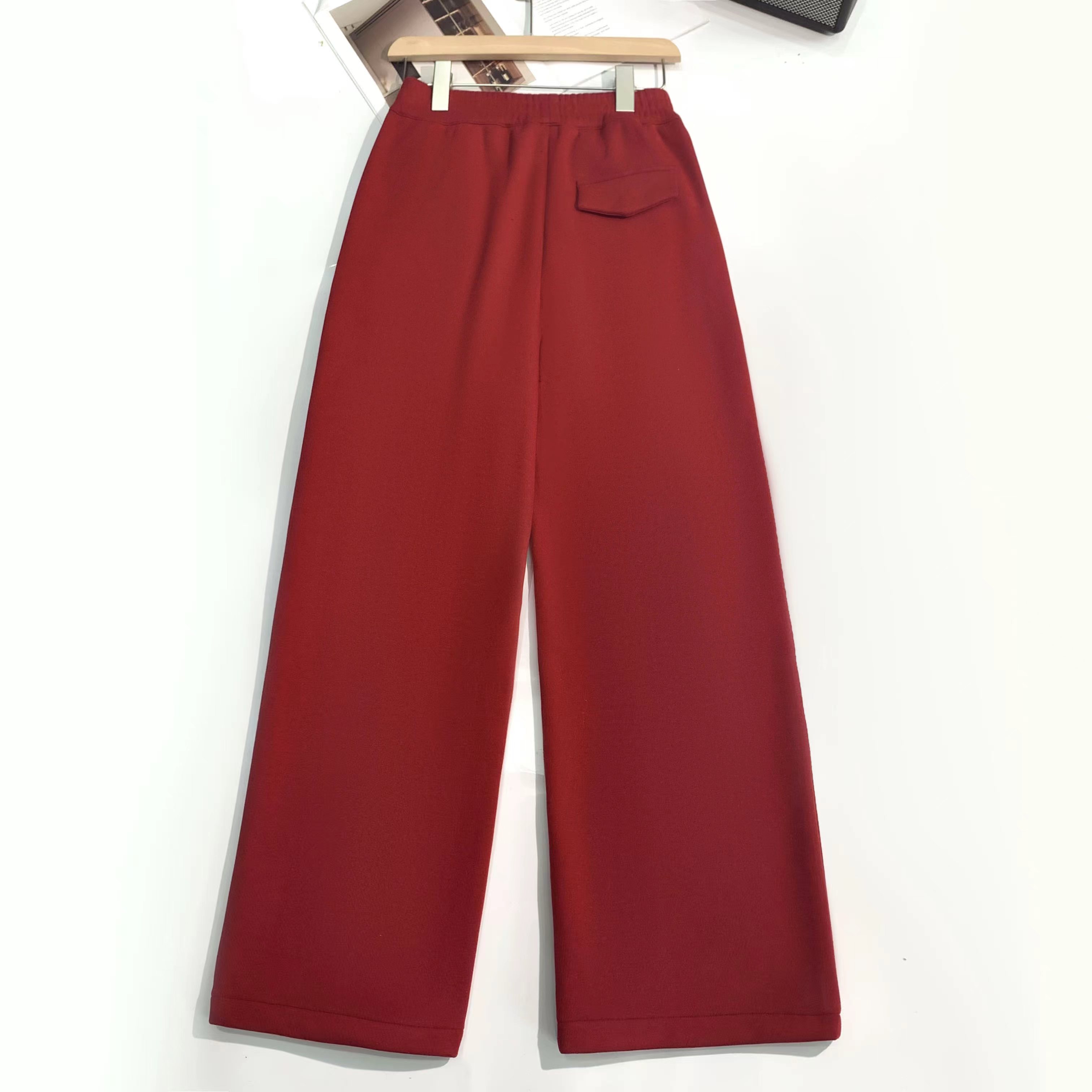 热门圣诞新年b备~冬季新款加绒加厚拉腿显瘦红色羊毛阔腿裤,圣诞~新年的仪式感需要穿搭来诠释!浓郁的正红色调,不掺杂杂色的红既显白又提气,黄皮上身能瞬间提亮肤色,冷白皮更是衬得肌肤通透,自带节日的热烈氛围,无论是圣诞、元旦还是春节,穿上它都能成为人群中的焦点。宽松直筒阔腿剪裁,从胯部到裤脚呈自然垂坠的直线型,不挑胯宽、腿粗的身材,能巧妙藏住大腿赘肉和不直的腿型,不挑身材包容性更高;腰头做了高弹松紧设计,保证了穿着的舒适度,又不挑腰围,包容性更高!侧边做了隐形斜插口袋设计,既不破坏裤身的整体线条,又能放置手机、钥匙等小物件,实用性拉满。后面臀部做了单侧假口袋设计,时尚不单调;做了加绒加厚的内里锁温却不显臃肿,裤脚没有多余的装饰,保持了纯平的剪裁,与阔腿的版型相呼应,让整体更显简约大气
