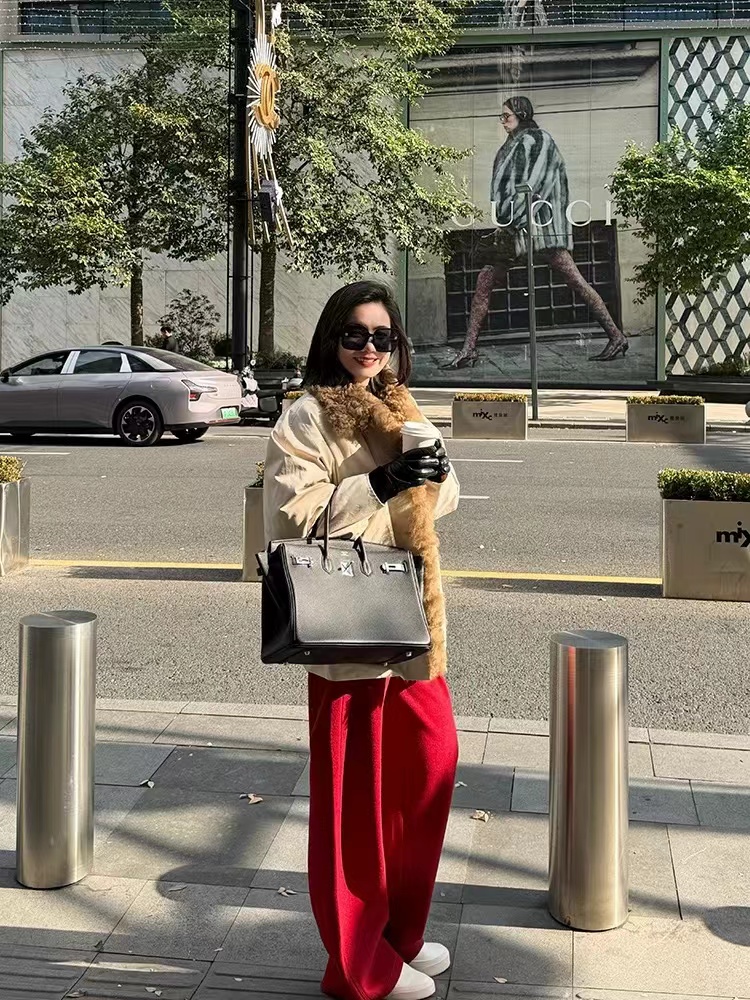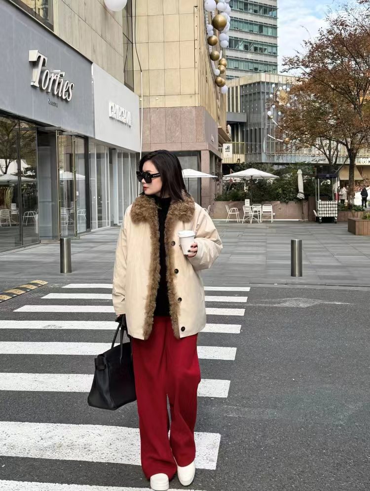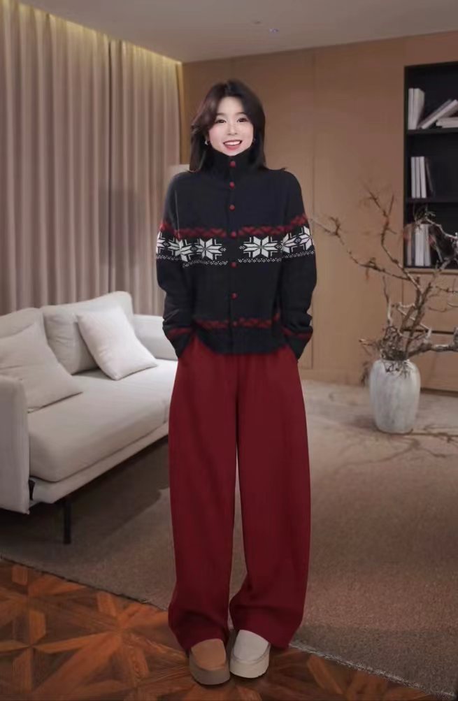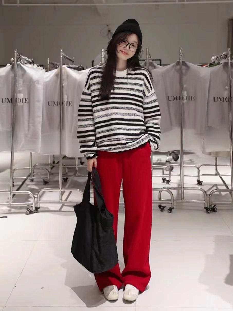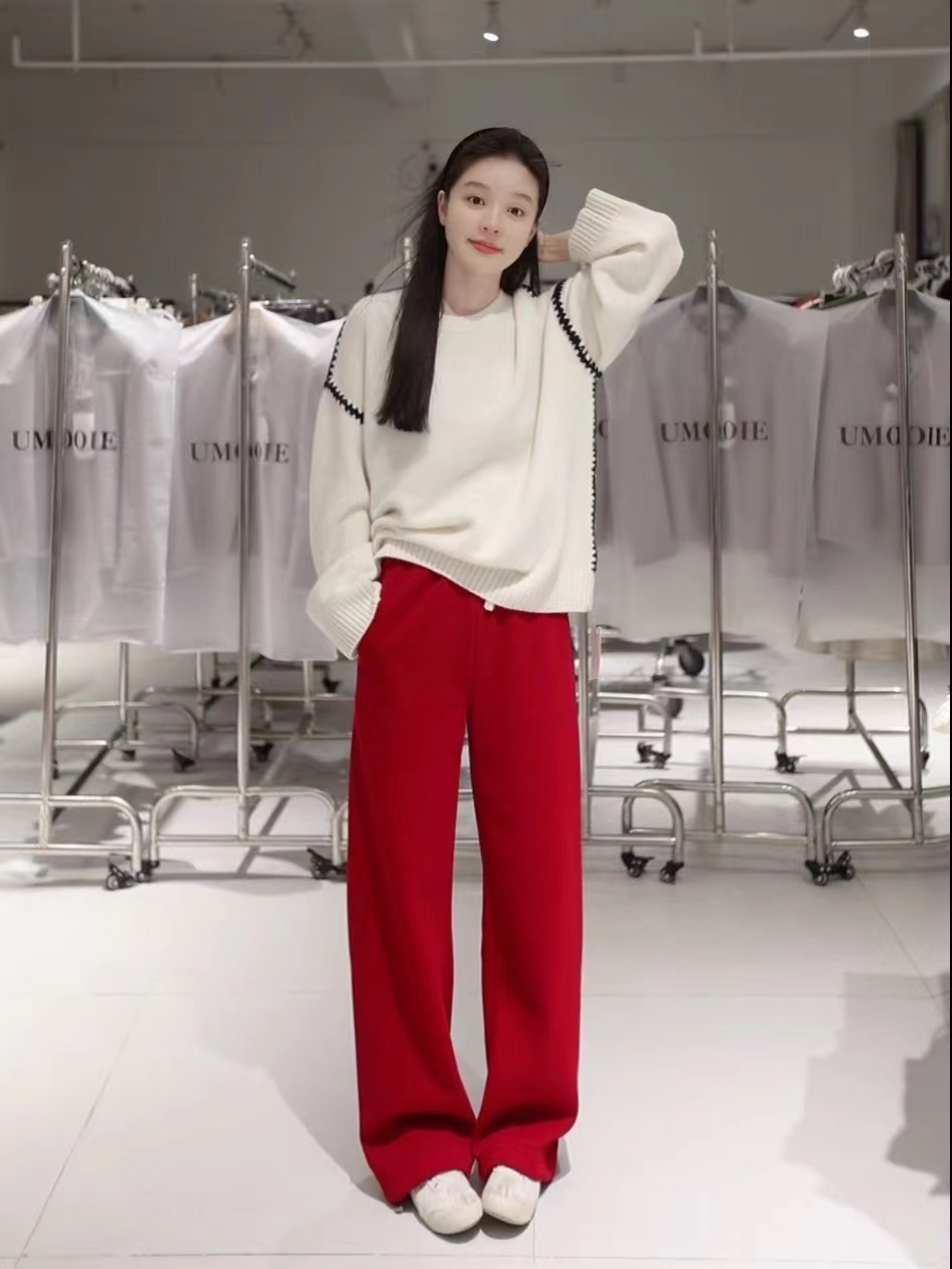 热门圣诞新年b备~冬季新款加绒加厚拉腿显瘦红色羊毛阔腿裤,圣诞~新年的仪式感需要穿搭来诠释!浓郁的正红色调,不掺杂杂色的红既显白又提气,黄皮上身能瞬间提亮肤色,冷白皮更是衬得肌肤通透,自带节日的热烈氛围,无论是圣诞、元旦还是春节,穿上它都能成为人群中的焦点。宽松直筒阔腿剪裁,从胯部到裤脚呈自然垂坠的直线型,不挑胯宽、腿粗的身材,能巧妙藏住大腿赘肉和不直的腿型,不挑身材包容性更高;腰头做了高弹松紧设计,保证了穿着的舒适度,又不挑腰围,包容性更高!侧边做了隐形斜插口袋设计,既不破坏裤身的整体线条,又能放置手机、钥匙等小物件,实用性拉满。后面臀部做了单侧假口袋设计,时尚不单调;做了加绒加厚的内里锁温却不显臃肿,裤脚没有多余的装饰,保持了纯平的剪裁,与阔腿的版型相呼应,让整体更显简约大气