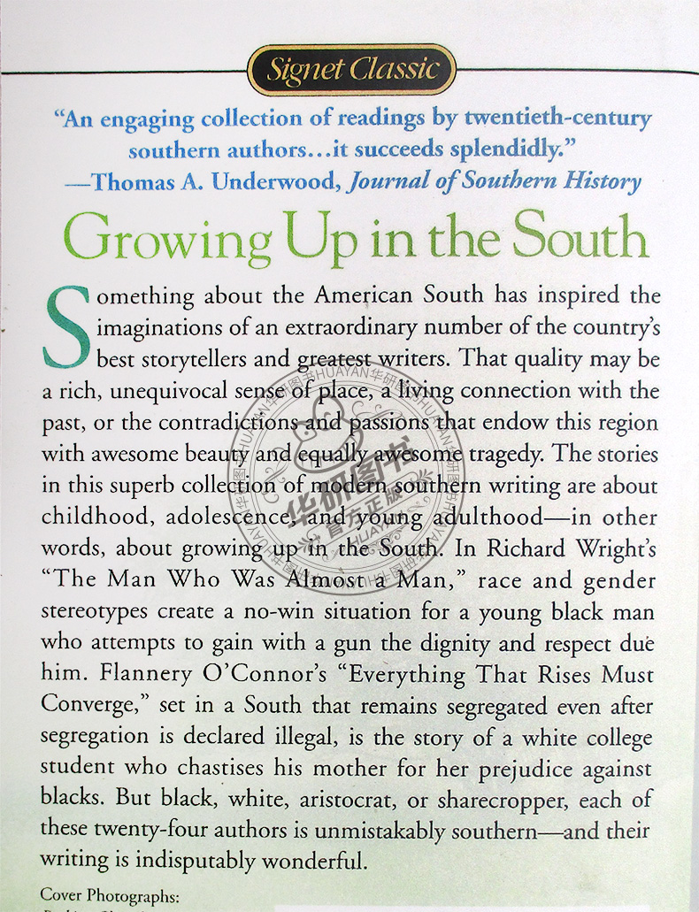 Growing Up in the South《在南方长大》是美国作家Suzanne Jones的著作,描述了关于童年、青春期和青年时期在南方长大的故事,激发了许多美国优秀的故事讲述者和伟大作家的想象力。本书为Signet Classics推出的英文原版,内容完整无删减,书本轻巧便携。