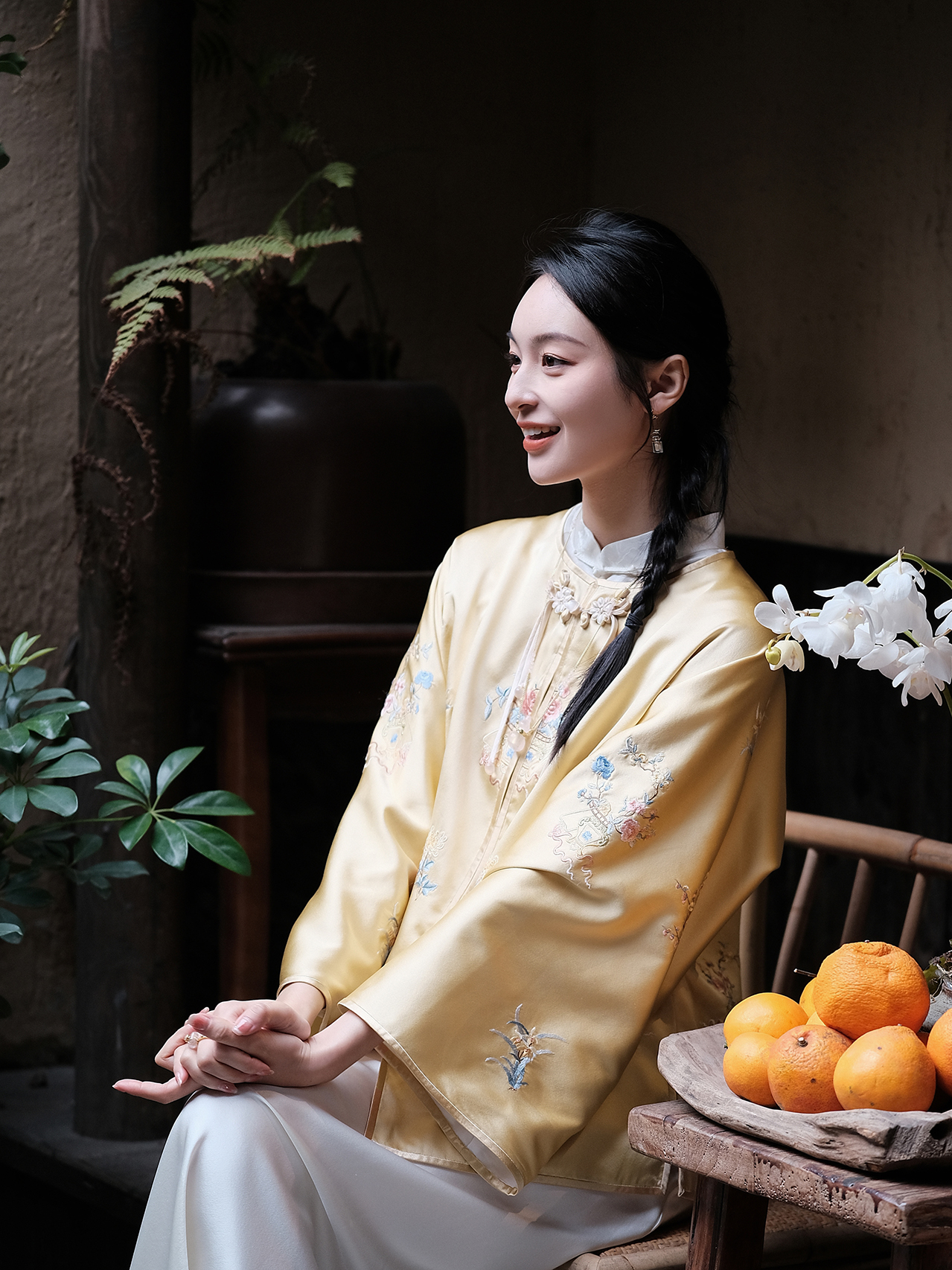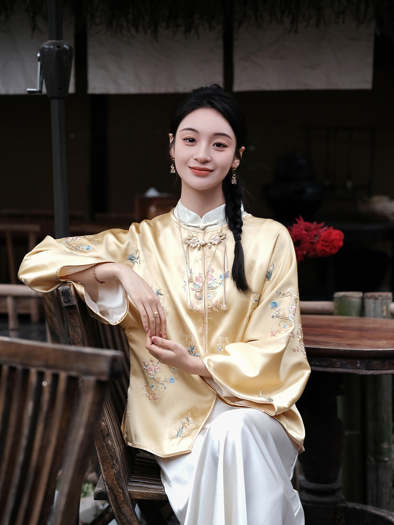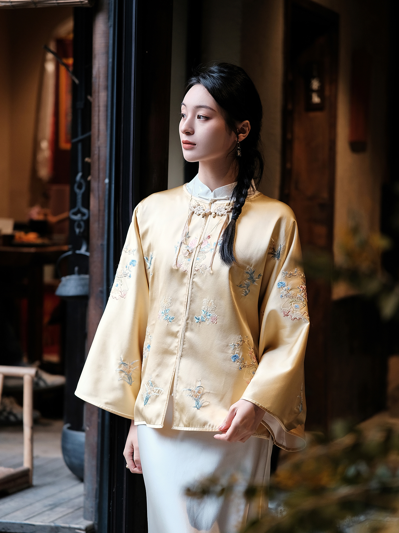 盛唐牡丹 |松花黄重缎真丝散花手推绣外套