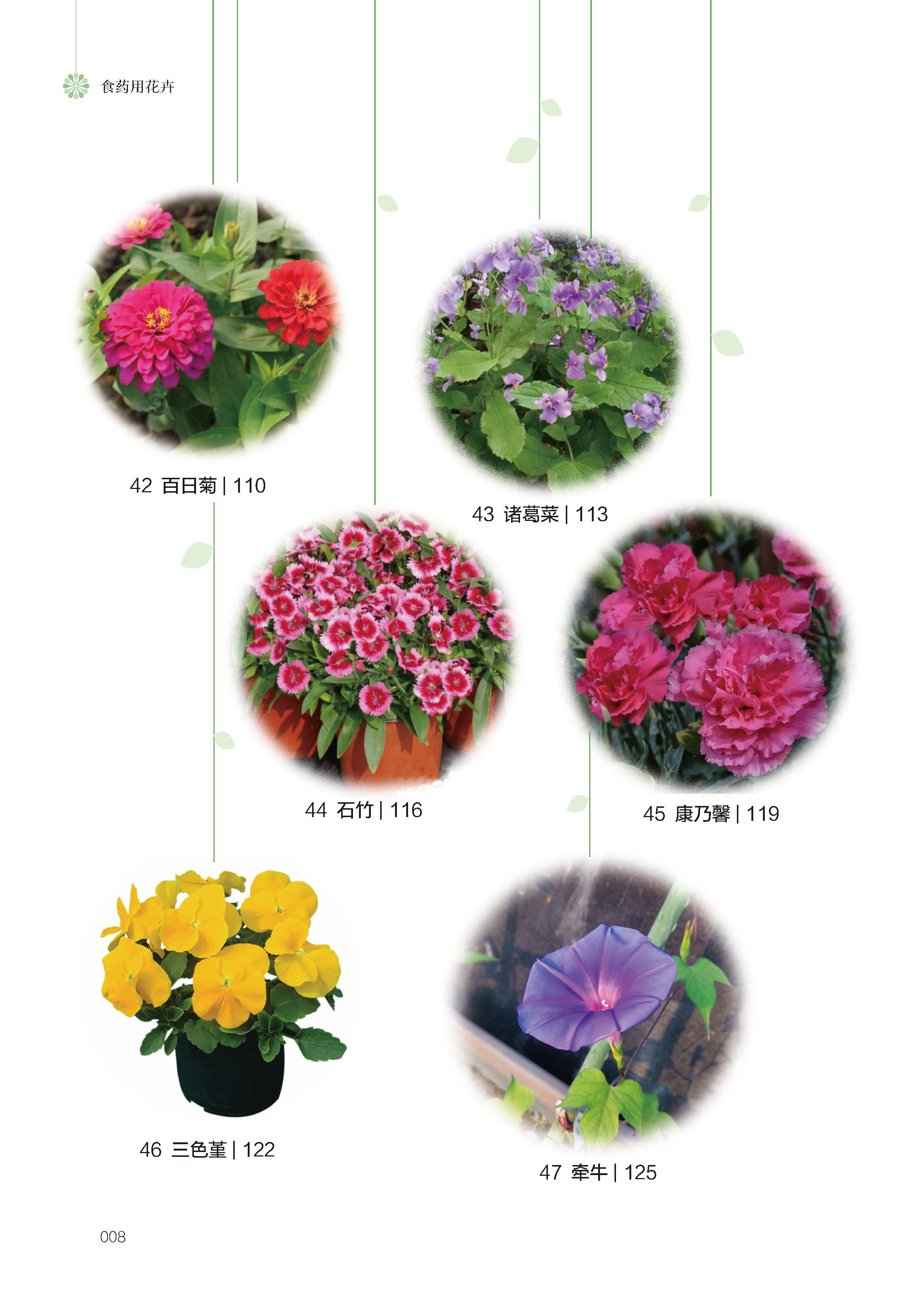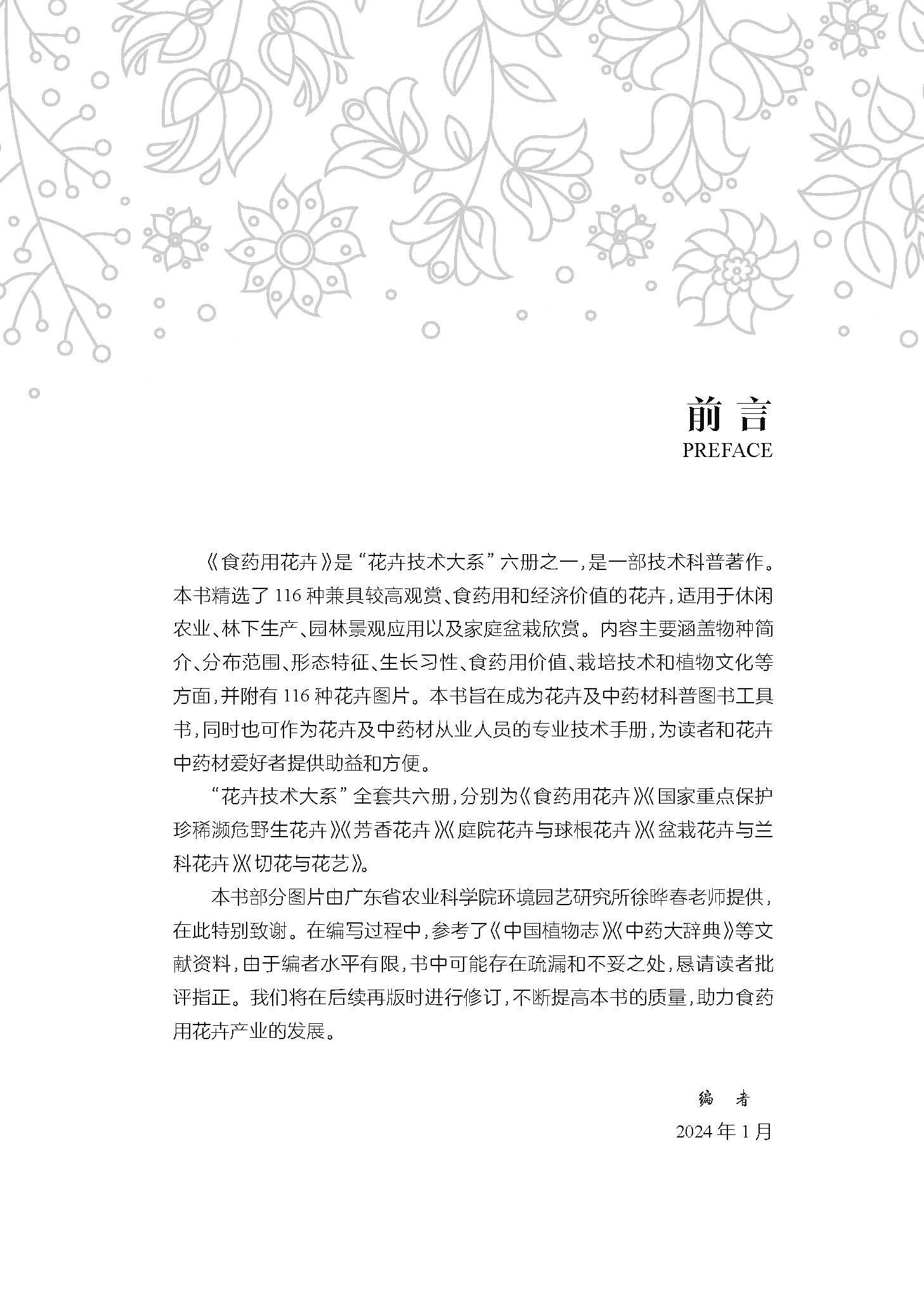 《食药用花卉》是《花卉技术大系》六册之一,独立出版的一部技术科普著作。本书精选了116种兼具较高观赏、食药用和经济价值的花卉,适用于休闲农业观光农园生产、林下生产、园林景观应用以及家庭盆栽欣赏。内容主要涵盖物种简介、分布情况、形态特征、生长习性、食药用价值、栽培技术和植物文化等方面,并附有116种花卉图片。本书旨在成为花卉和中药材科普图书工具书,同时也可作为花卉和中药材从业人员的专业技术手册,为读者和花卉中药材爱好者提供一些助益和方便。由于编者水平有限,书中可能存在疏漏和不妥之处,恳请读者予以批评指正。