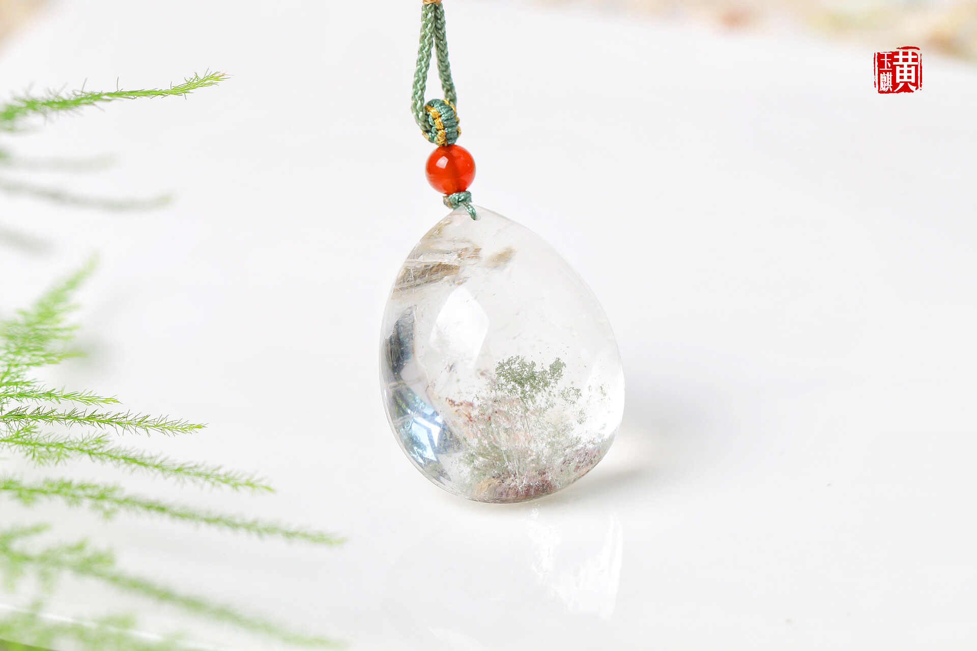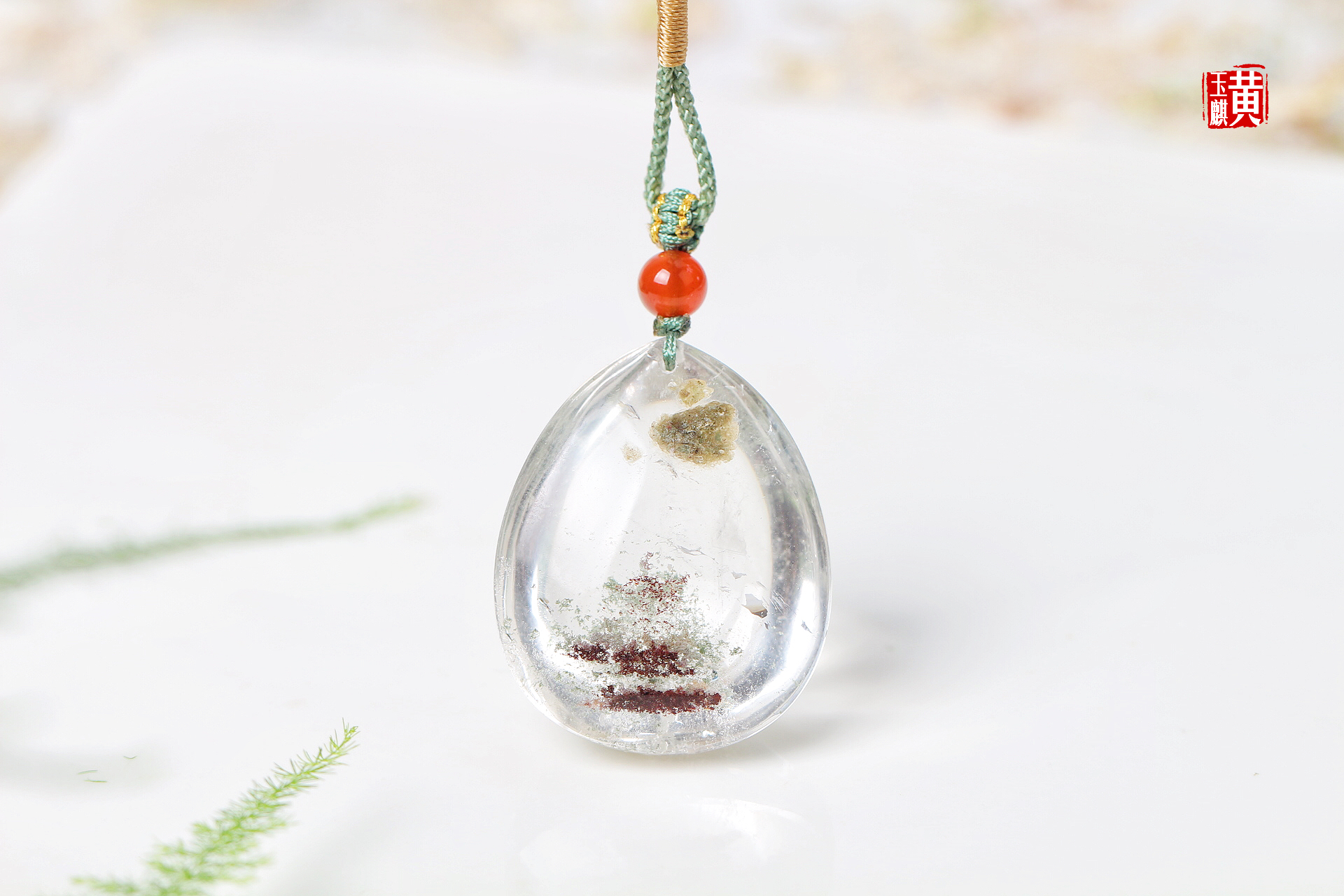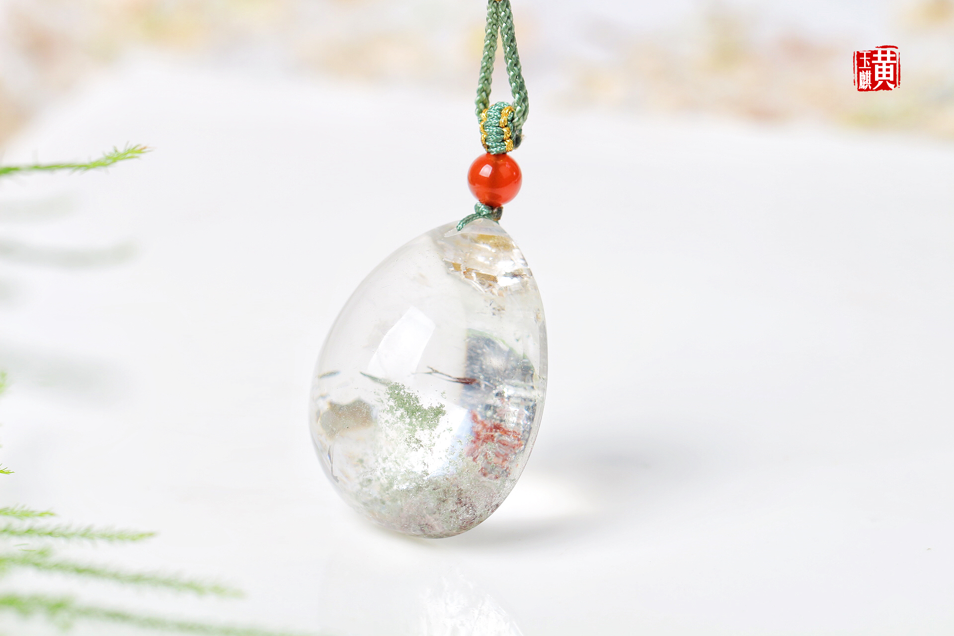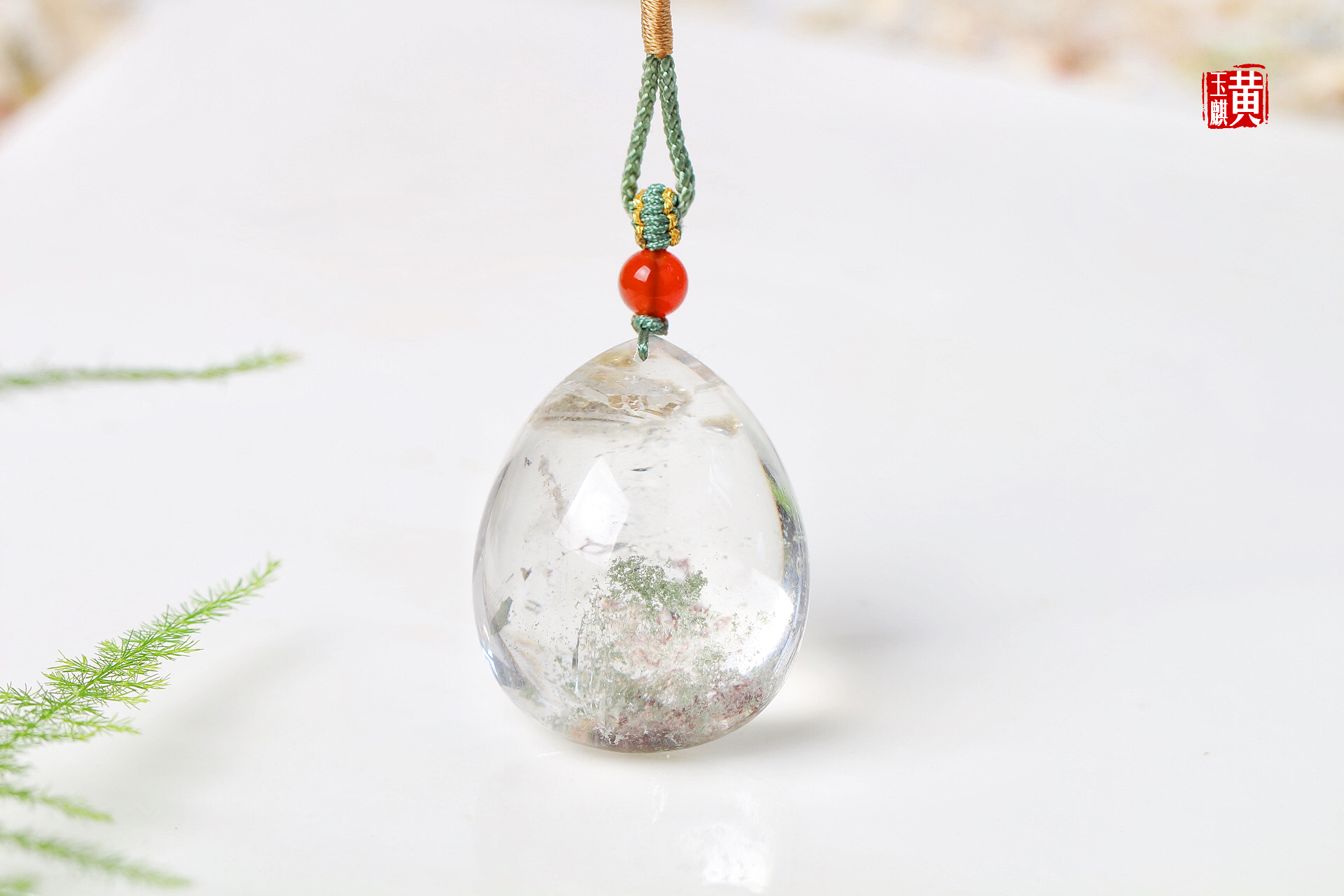 绿幽灵水晶吊坠,晶莹剔透,内含绿幽灵和红幽灵,稀有的满天星景象,十分漂亮,寓意财富汇集、事业高升。