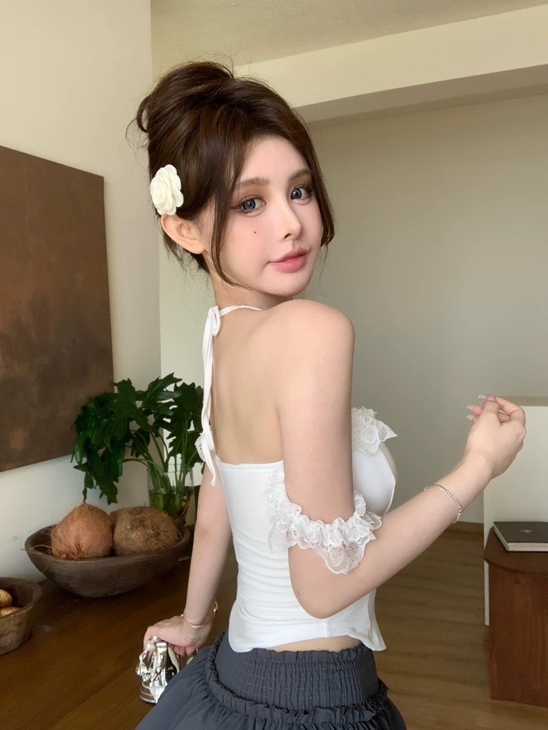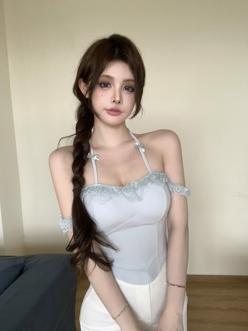 【纯欲风❗️挂脖蕾丝吊带衣】挂脖设计 + 精致蕾丝花边,一秒拿捏甜欲少女感,完美勾勒身体曲线,视觉上显瘦又显高,轻松打造 S 型身材,蝴蝶结带胸垫小T恤女夏季辣妹外穿L