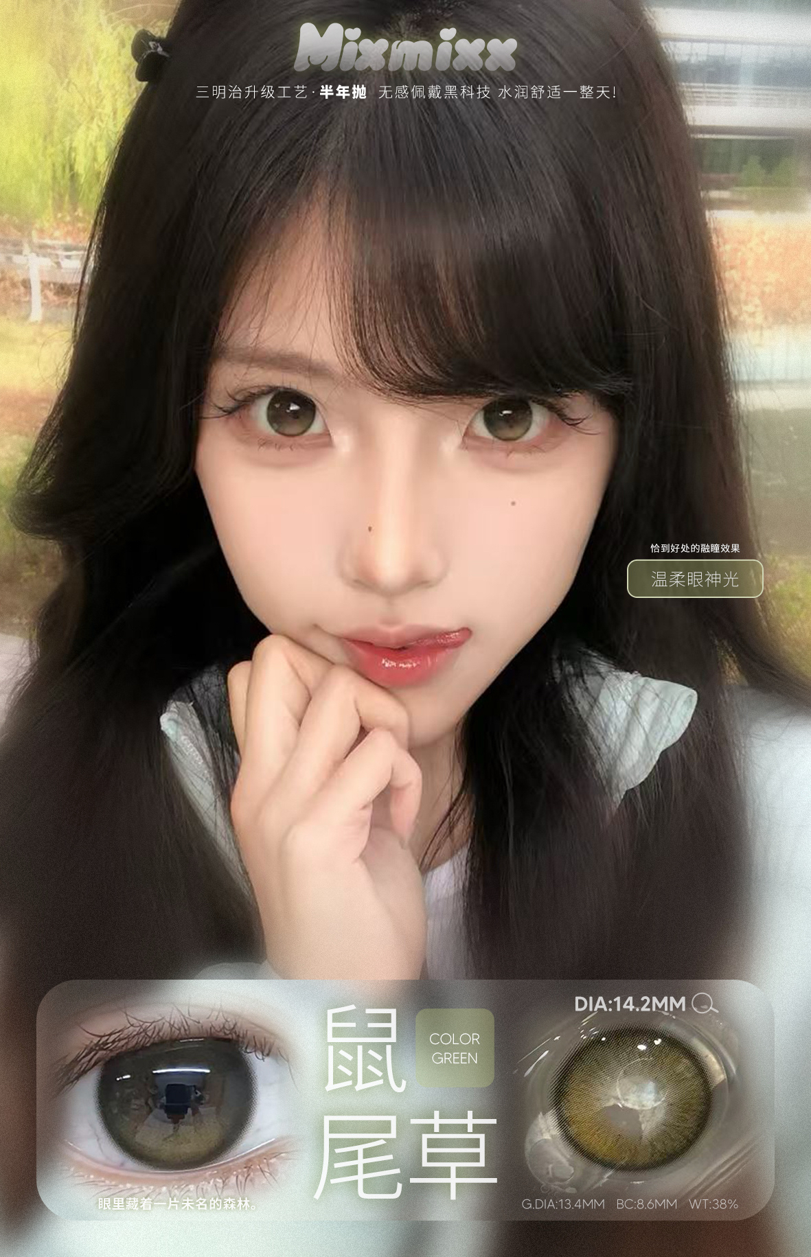 标注直径:14.2mm着色直径:13.4mm含水量:38%佩戴期限:半年型(建议6个月)可配:0-800度(无525/575)工厂:icodi含硅水凝胶