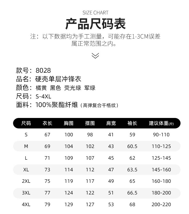 【品名】「鸟家同款式」斯辰唯佳 户外冲锋衣 全方位保暖 防风 防水 E55-8028 【规格】橘色、荧光绿、黑色、军绿 【尺寸】S-4XL 【产地】国内 【材质】聚酯纤维100% 【发货包装】独立包装袋 【发货地】福建 【发货快递】申通 【不发货区域】新疆、西藏、港澳台 【发货时效】48-72小时,周末节假日顺延 |