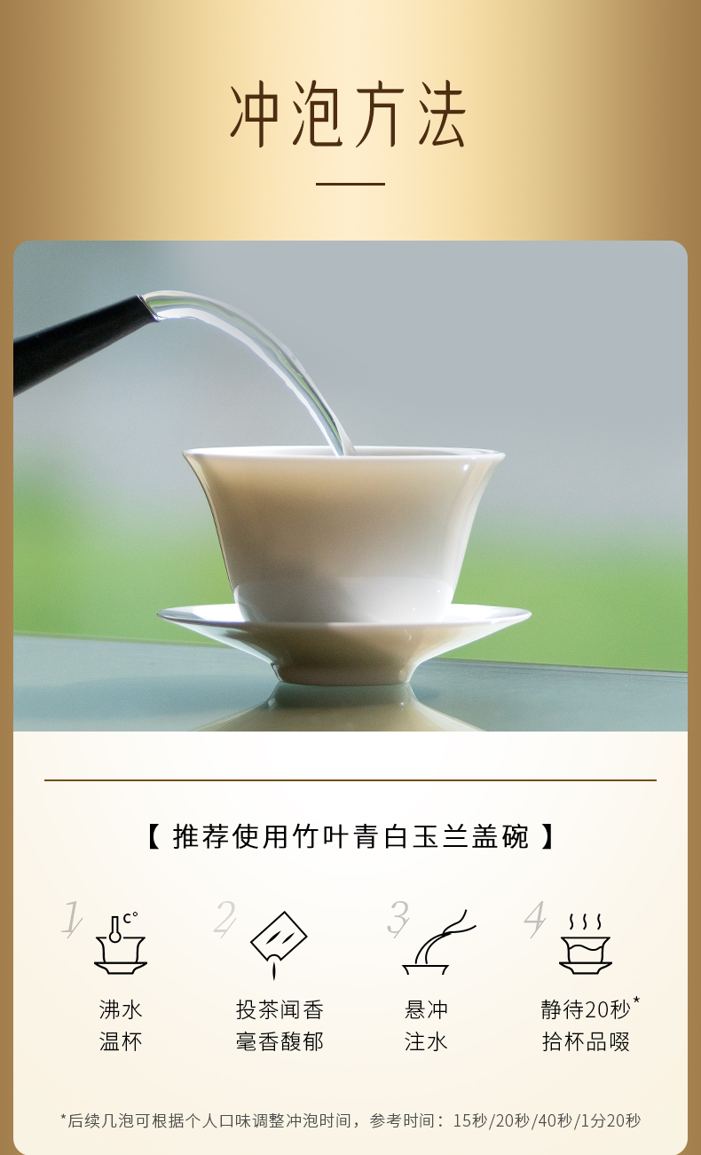- 中国制茶大师徐金华(徐公)传承 古方制作技艺 开创新派茉莉花茶 精选峨眉高山明前春茶 配以广西横县双瓣茉莉 花与茶,黄金配比 时间酝酿,层层历练 花香与茶香交融 盖碗之间 仿佛茉莉花在舌尖绽放