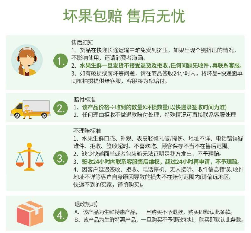 3、生鲜水果非标品众口难调,所有口感不好、品相不好、表皮轻微擦伤、地址不详、电话错误、乡镇地址、超区都不在售后范围。