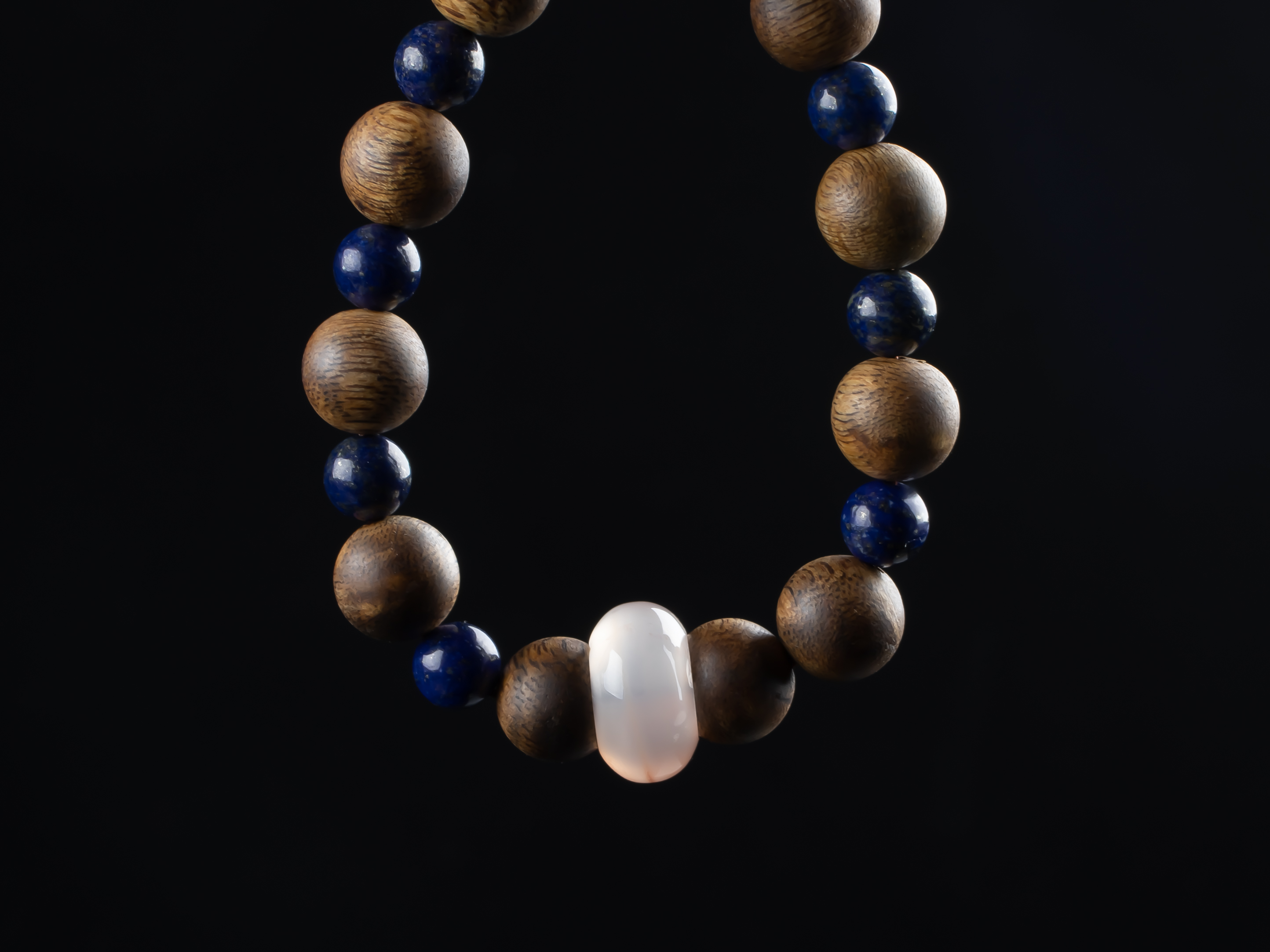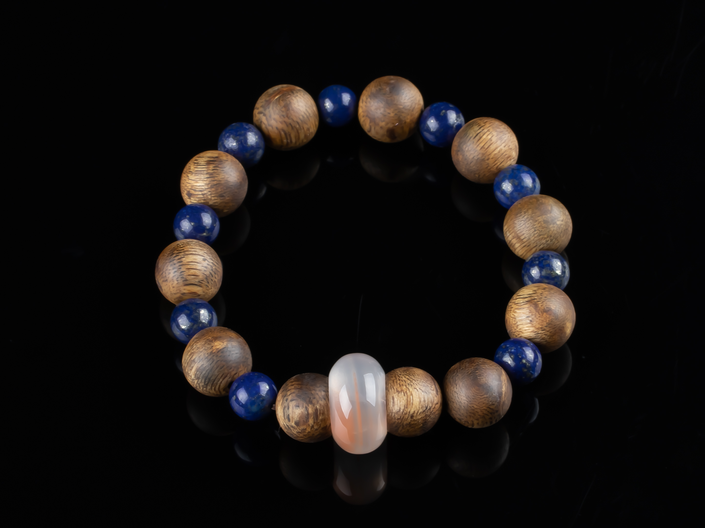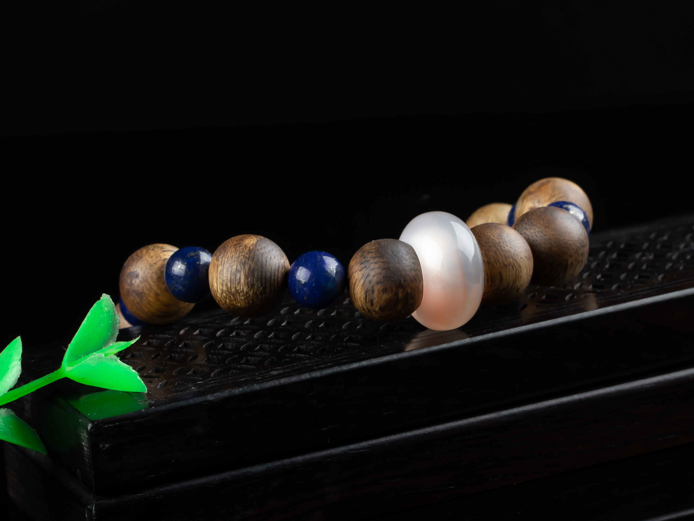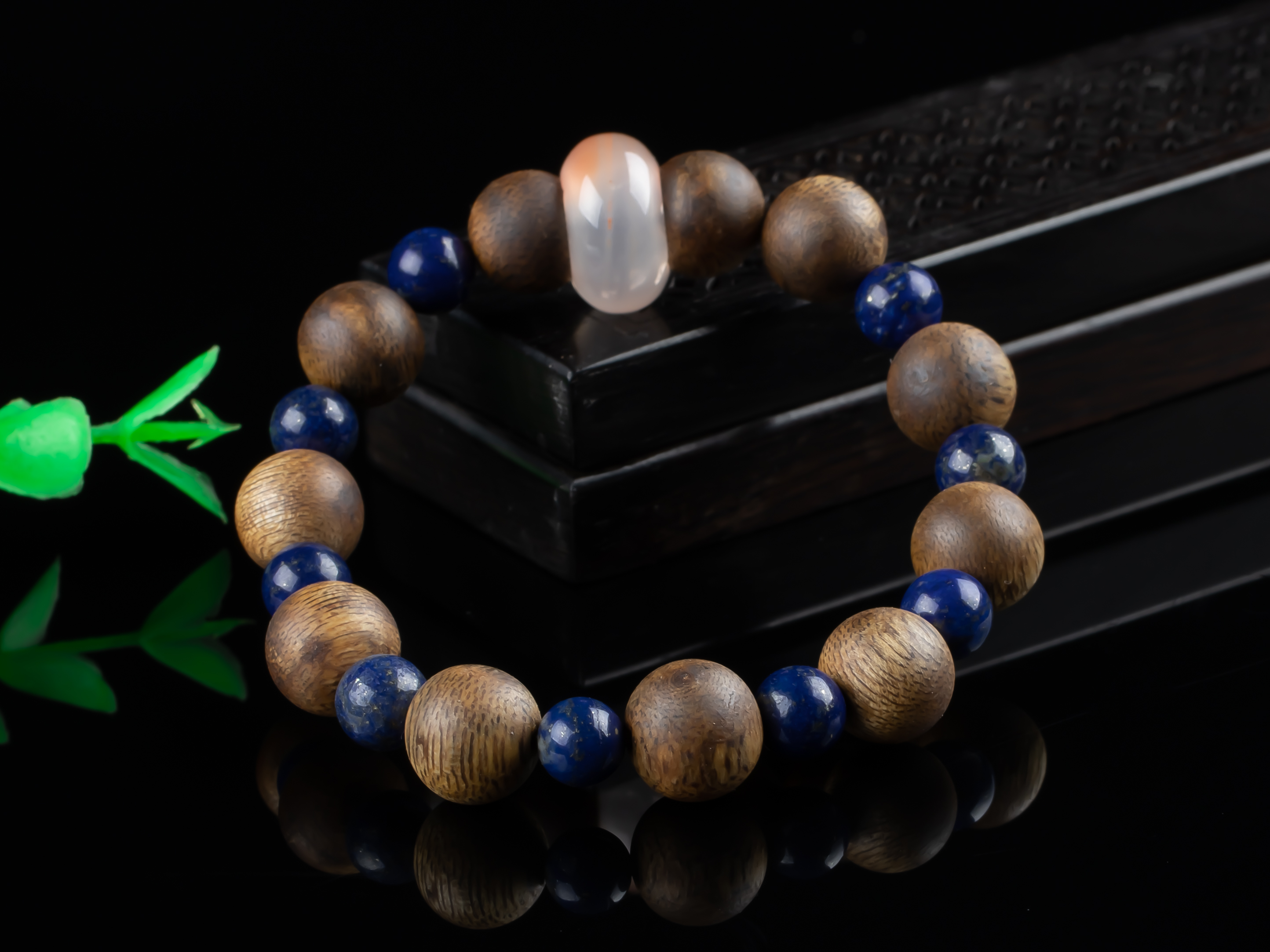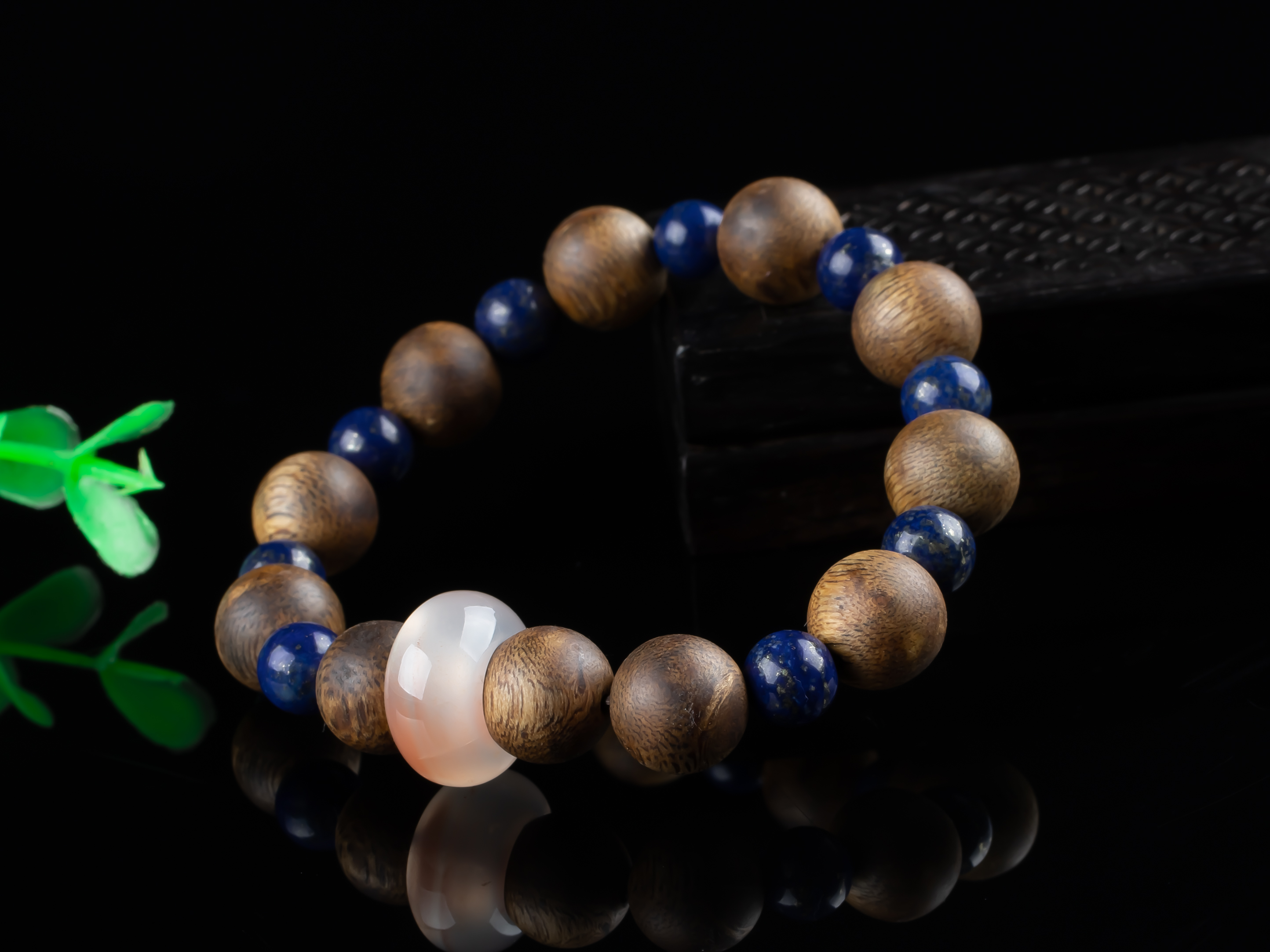 XY0133沉香青金石冰飘南红手串,天然沉香圆珠10.3mm,原色原味,香味自然清甜,9颗6.3mm有帝王色之称的青金石+1颗冰飘色的南红,古色古香之中带来一股冰润之美,有点睛之效。