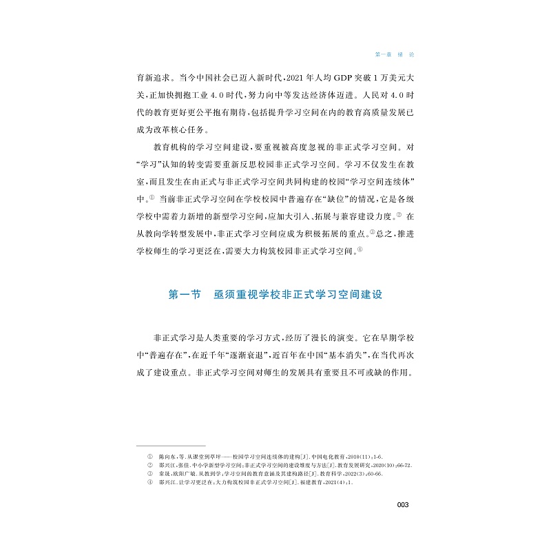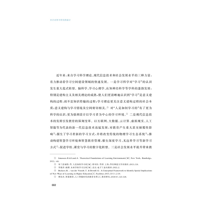 非正式学习空间愈发成为当代学校规划与设计的重要领域,成为师生素养发展的关键场所。本书对非正式学习空间的发展历史与现存问题进行了全面梳理,阐述了空间中非正式学习的发生机制,富有深度地系统呈现了开展非正式学习空间建设的设计理念、设计原则、设计方法与设计策略,特别是首创提出了非正式学习空间设计的PDCA模式。书中既有基于比较研究方法展开的全球多国案例研究,更有90余个由研究者设计的在中国学校中真实应用的实例。全书理实相合,图文并茂,是一本指导各类教育机构开展非正式学习空间设计,十分富有价值的理论成果与实践指南。