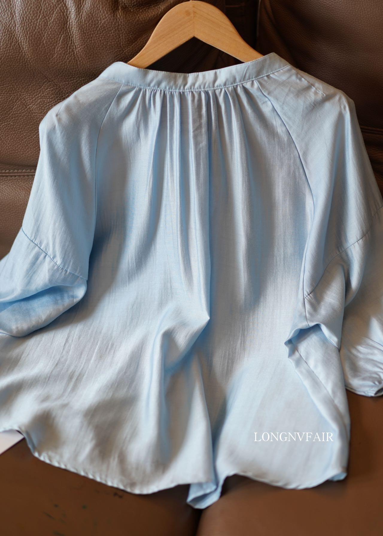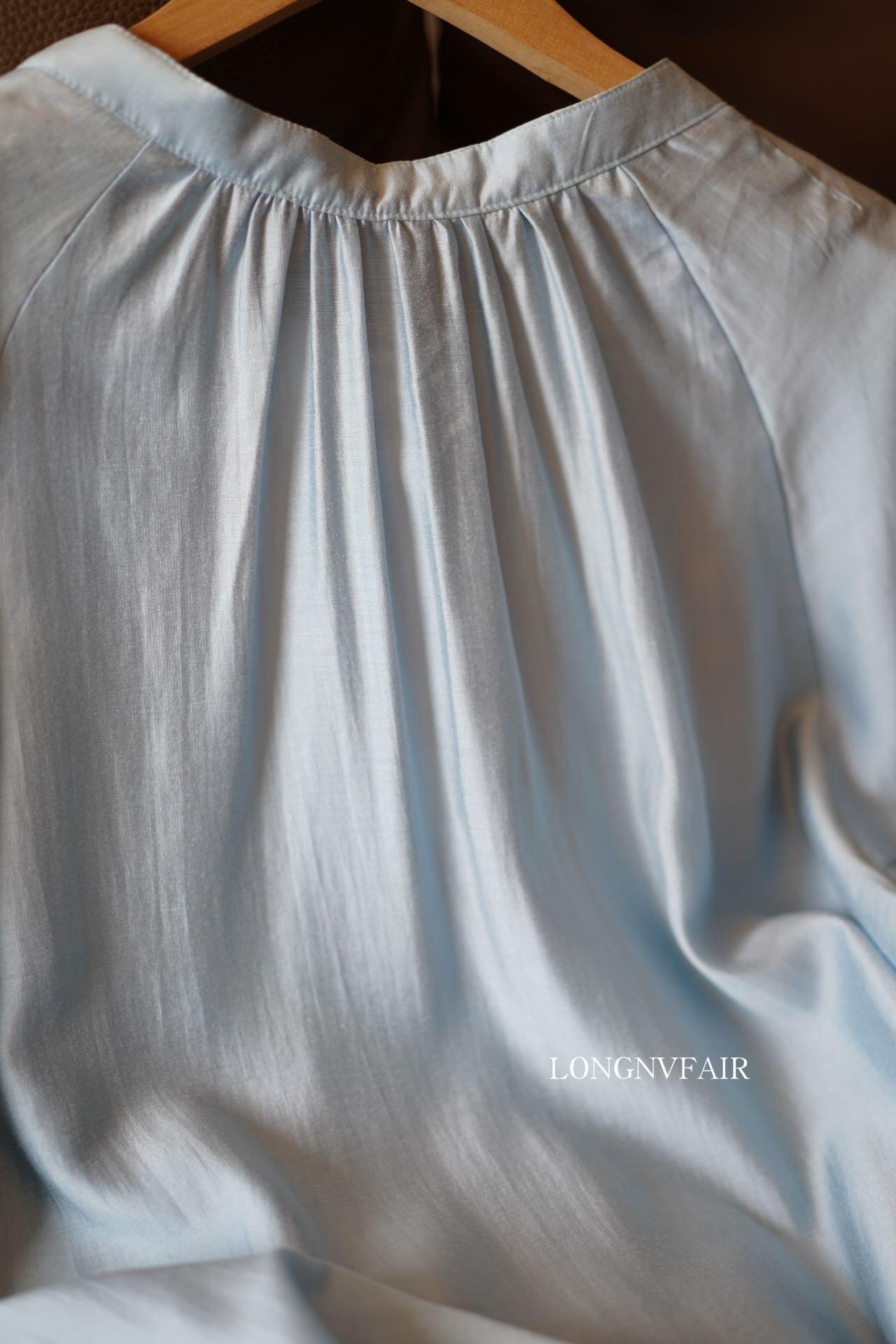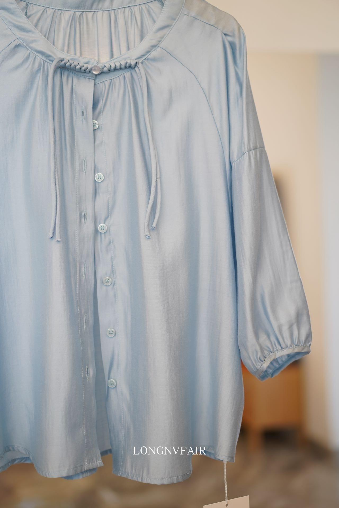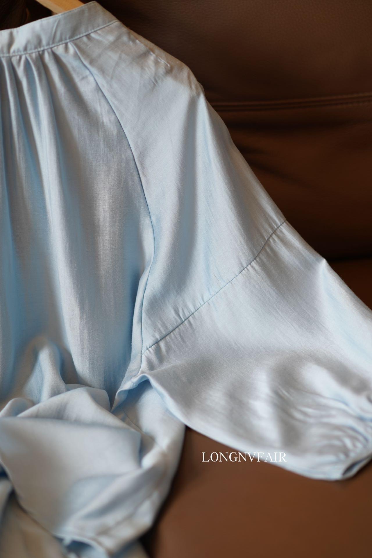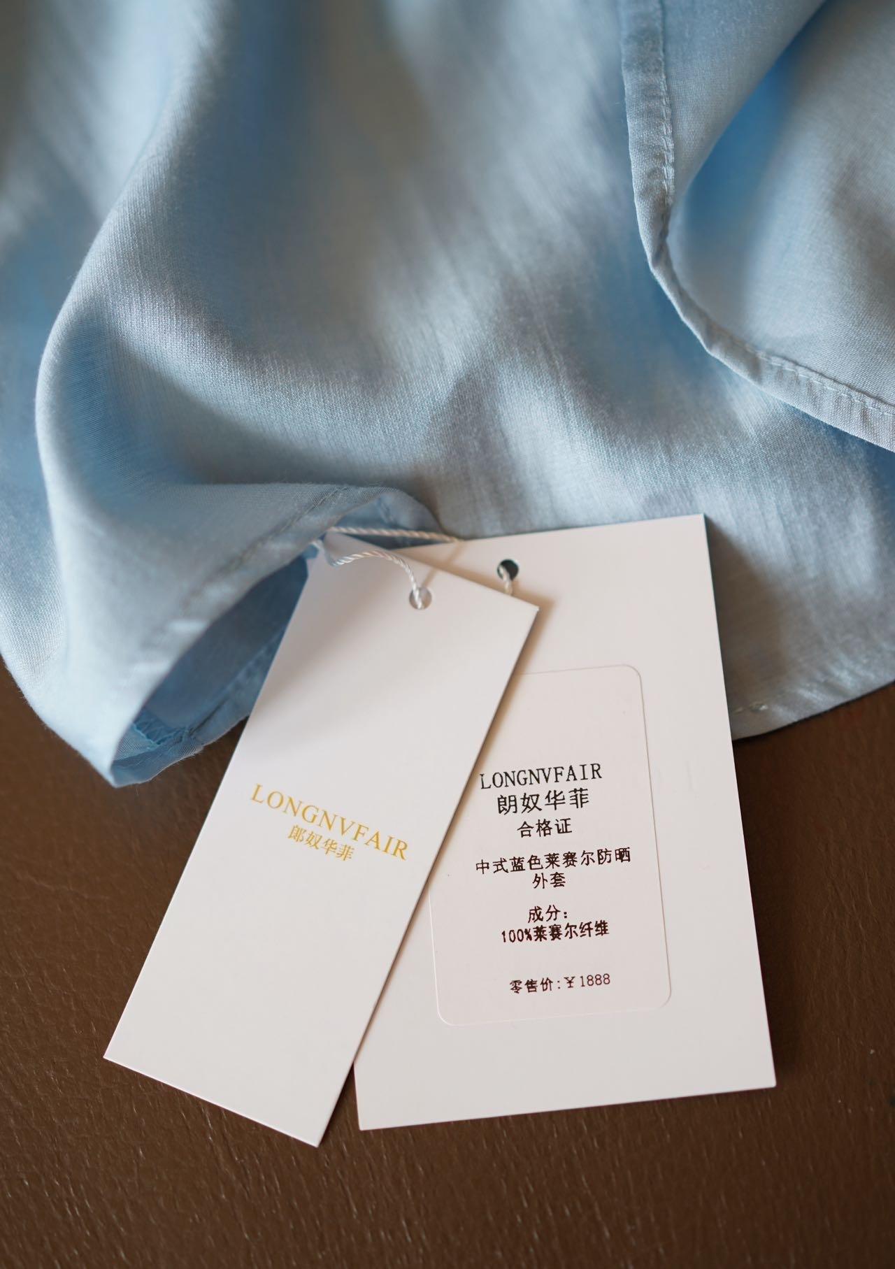 【下单后7天发货】LONGNVFAIR 华菲中式蓝色莱赛尔防晒外套 国风天空蓝盘扣天丝衬衣