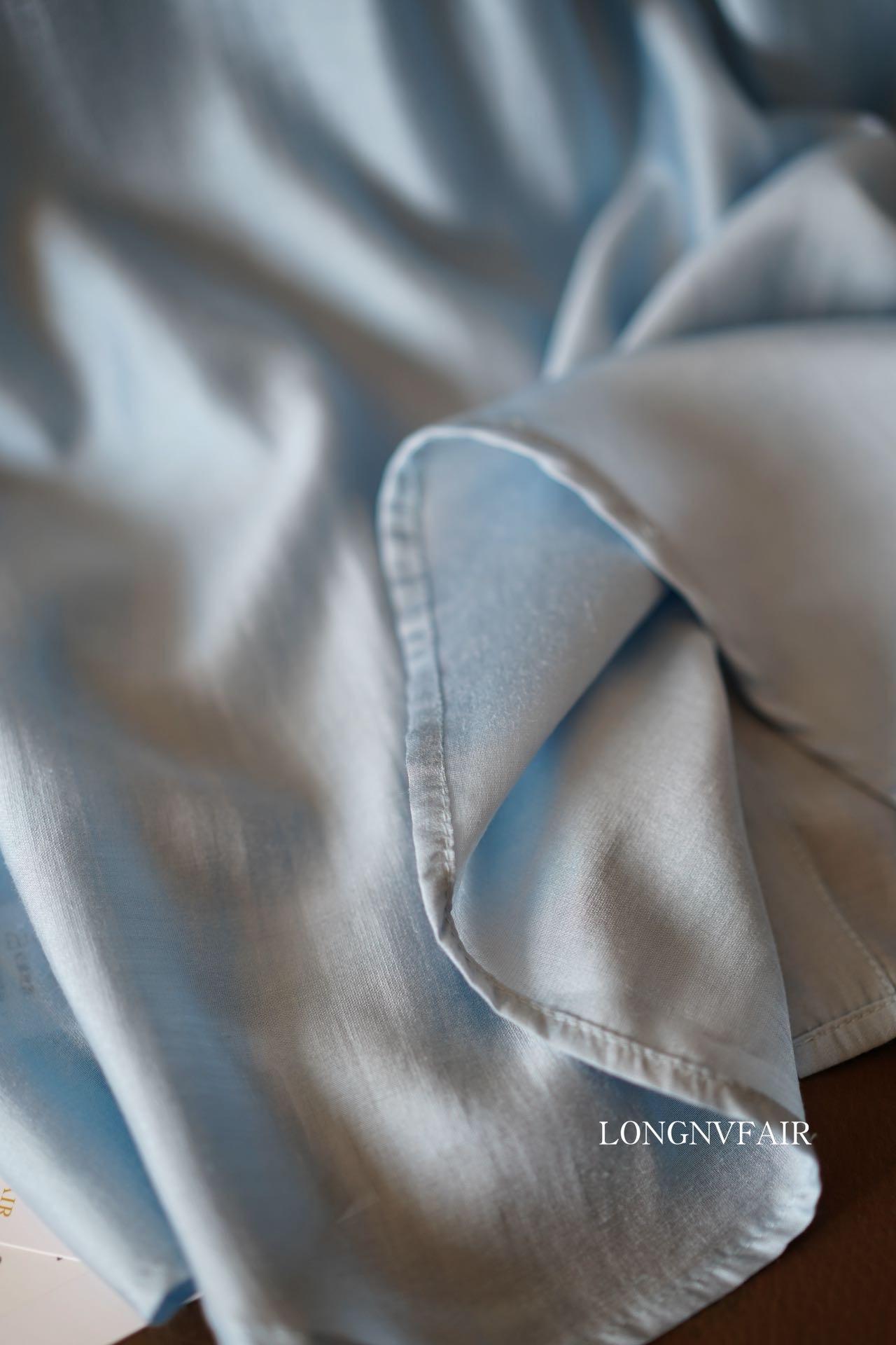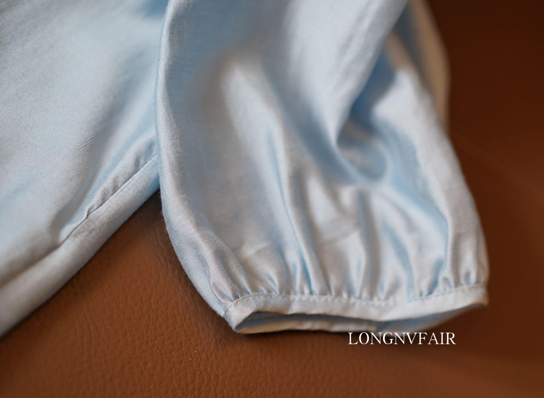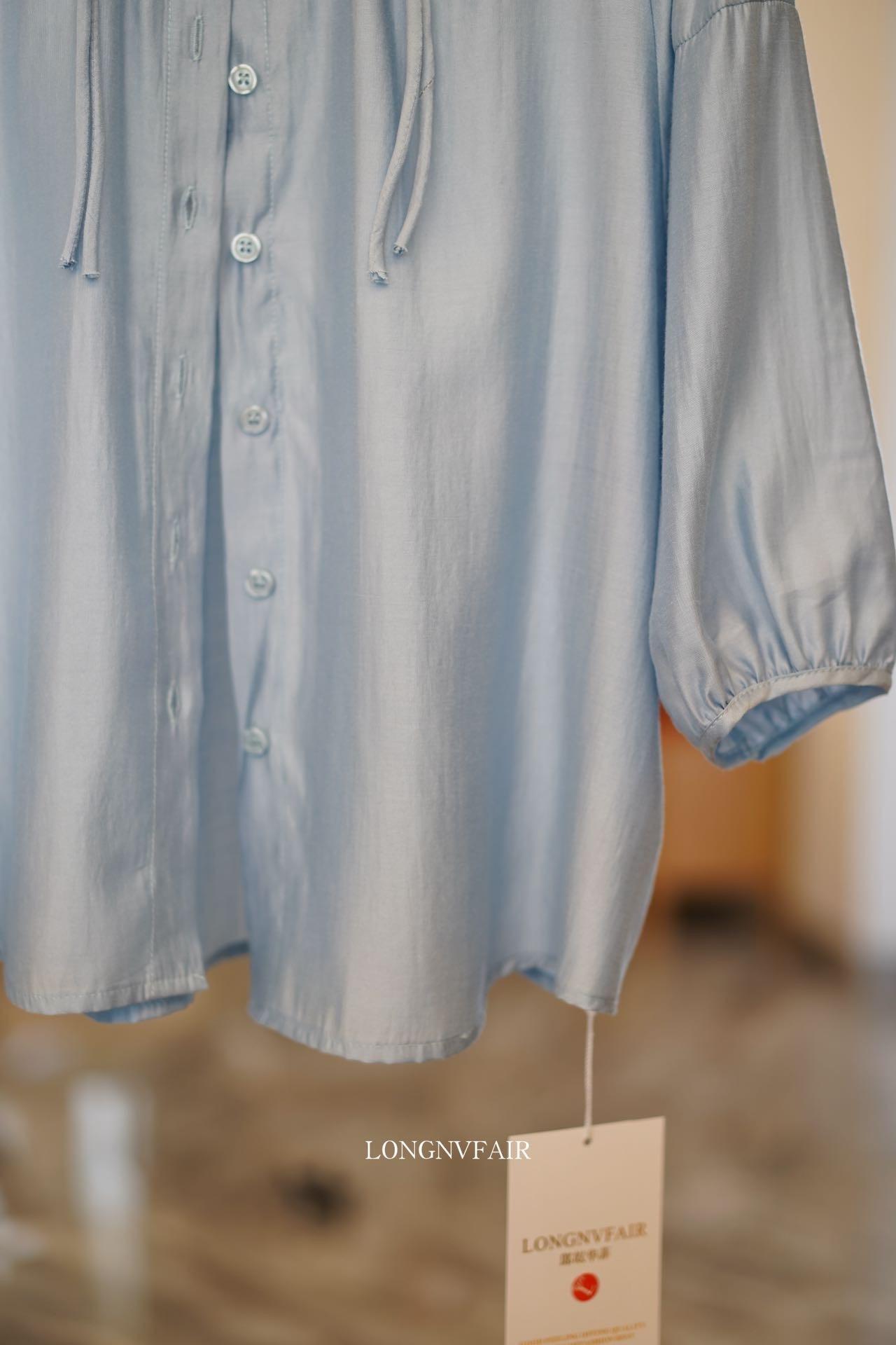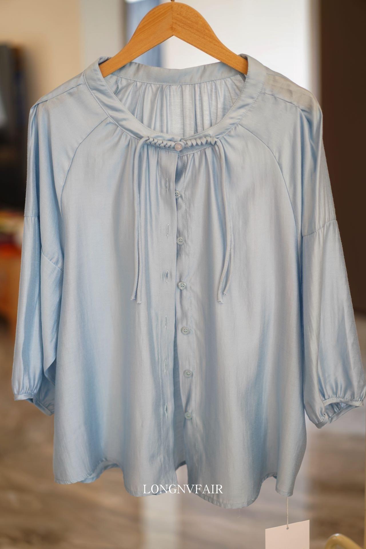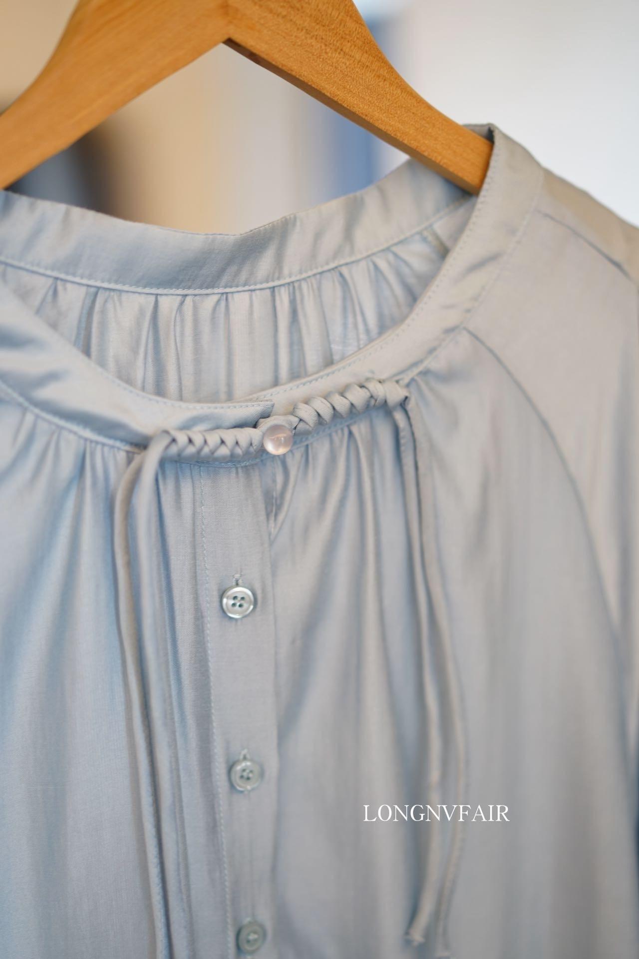 【下单后7天发货】LONGNVFAIR 华菲中式蓝色莱赛尔防晒外套 国风天空蓝盘扣天丝衬衣