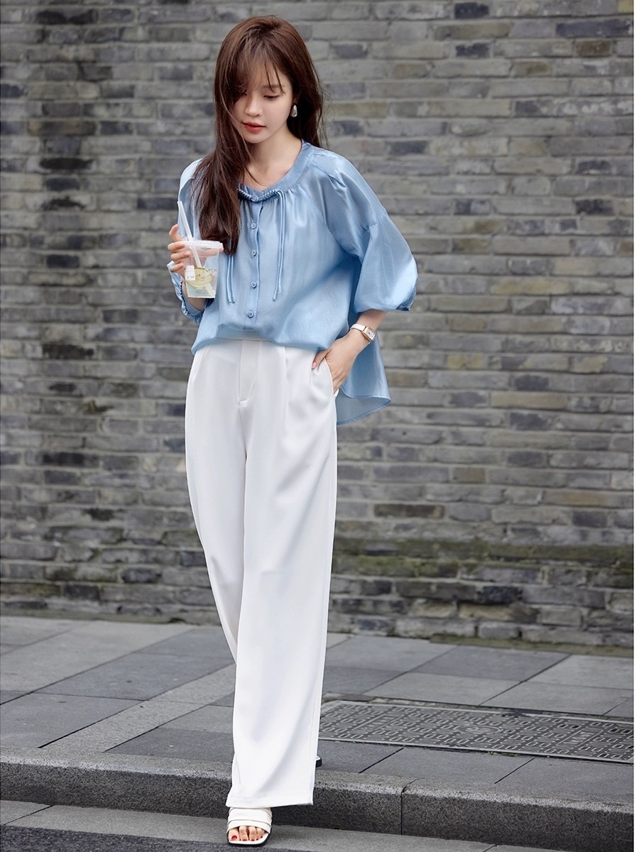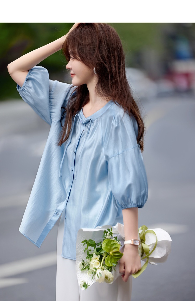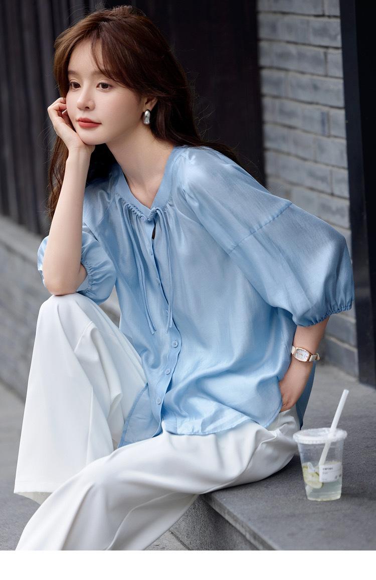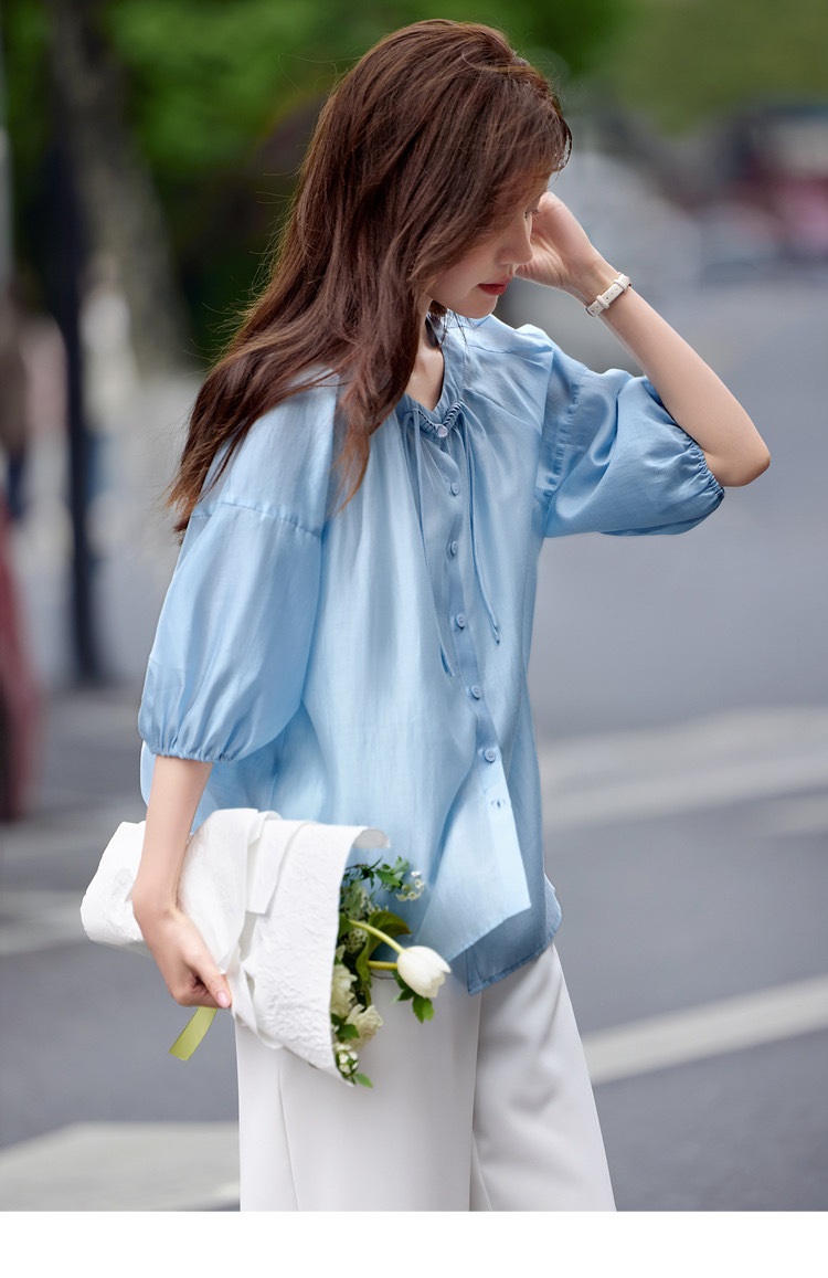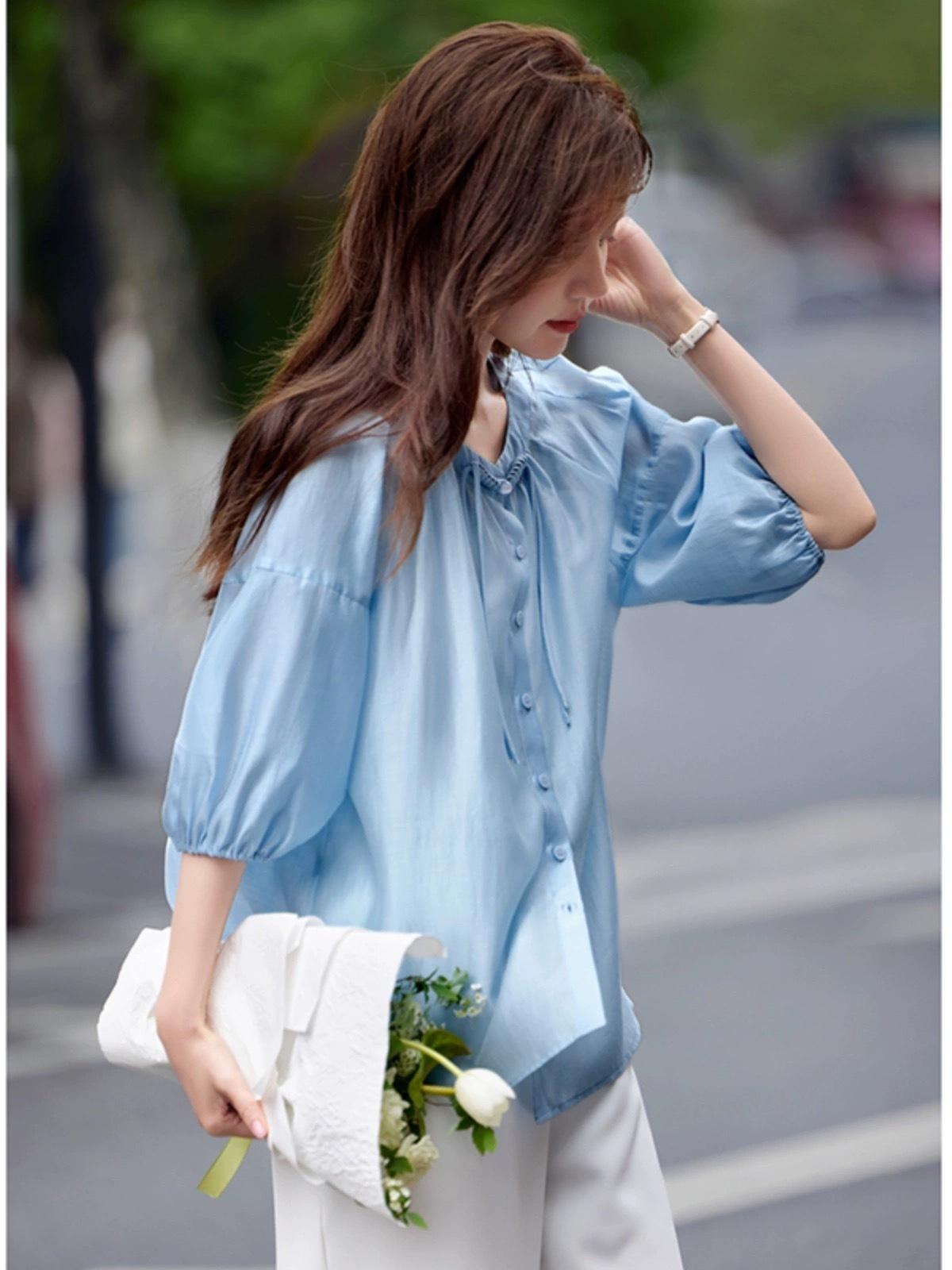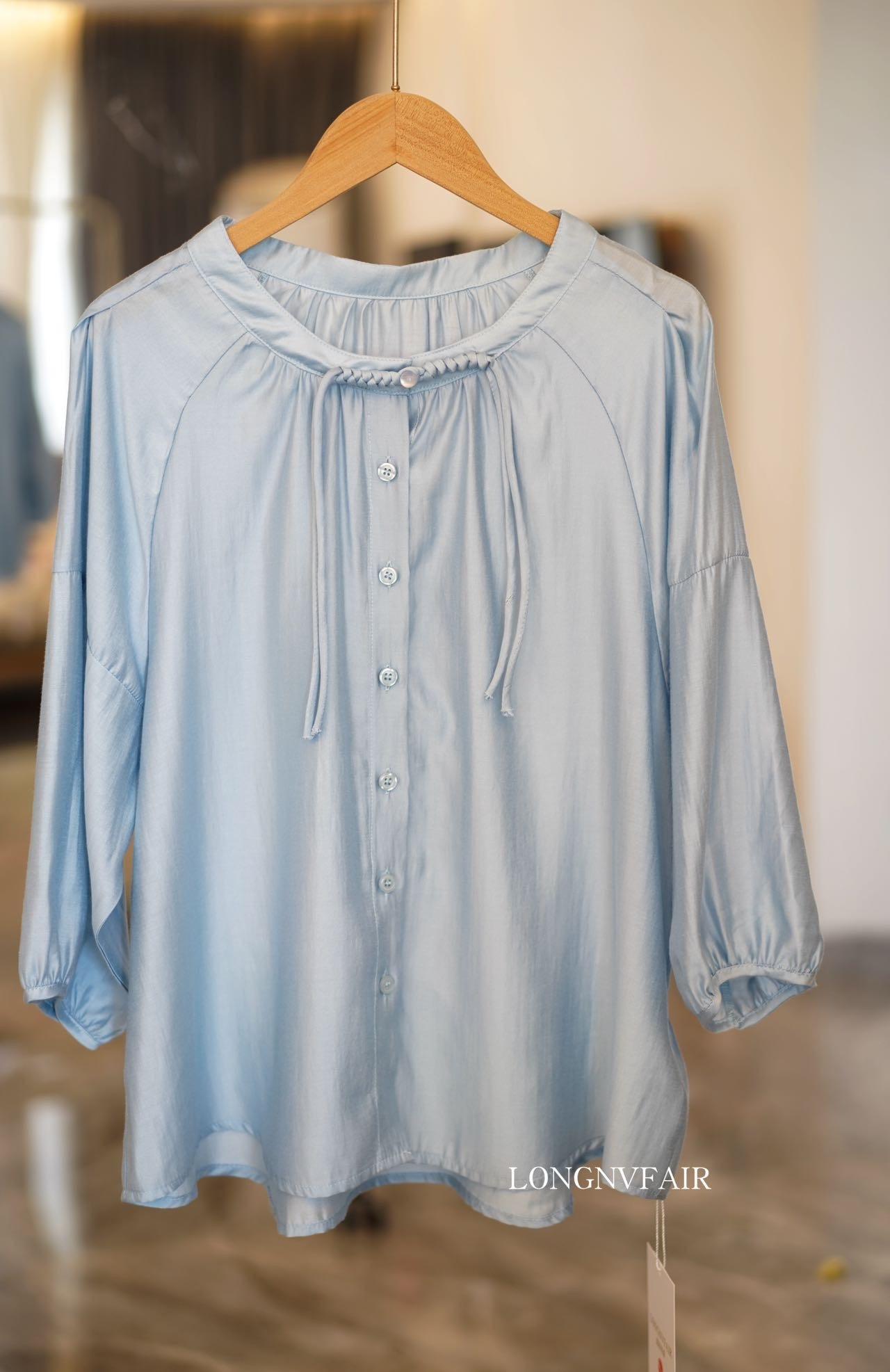 【下单后7天发货】LONGNVFAIR 华菲中式蓝色莱赛尔防晒外套 国风天空蓝盘扣天丝衬衣
