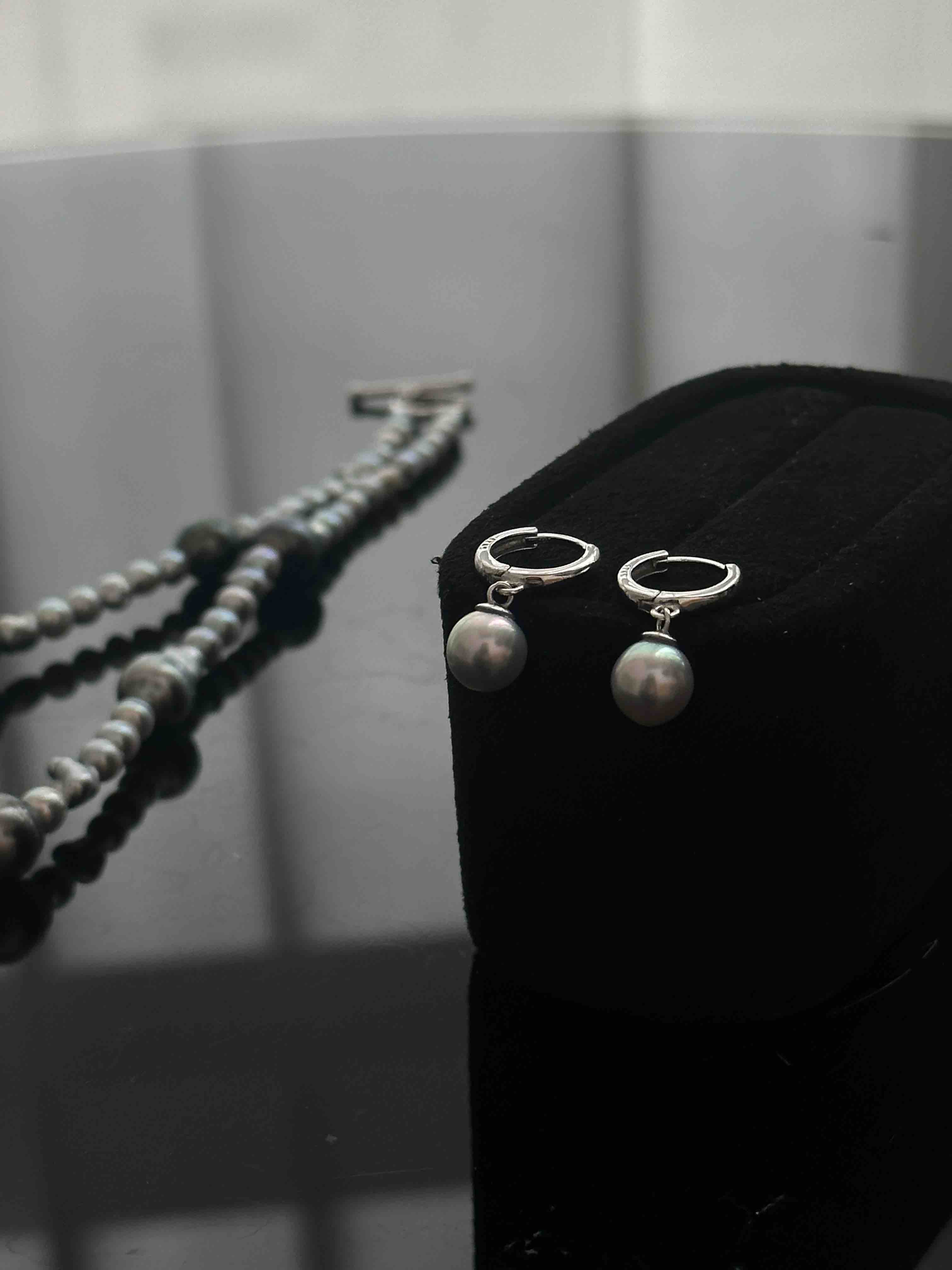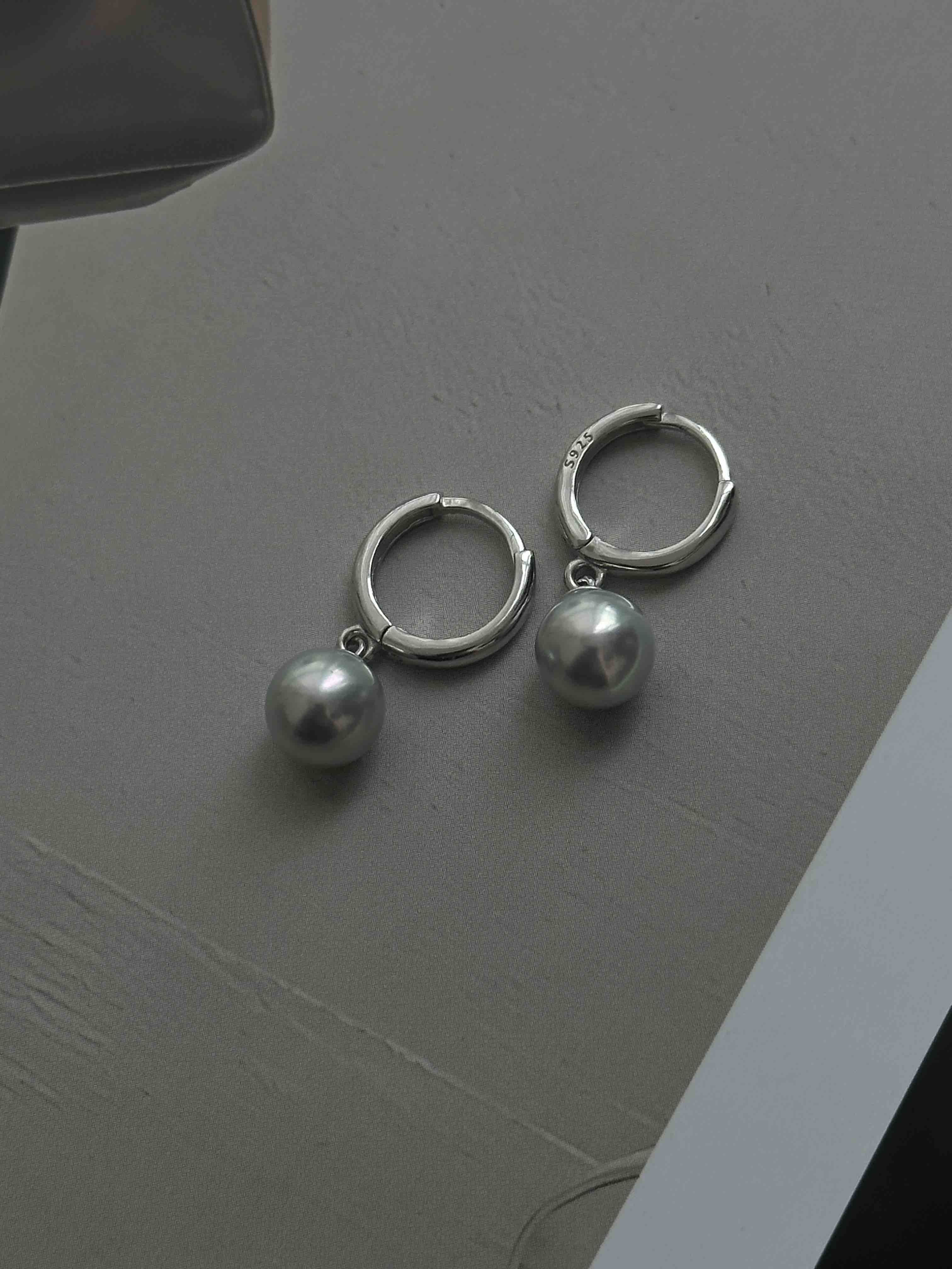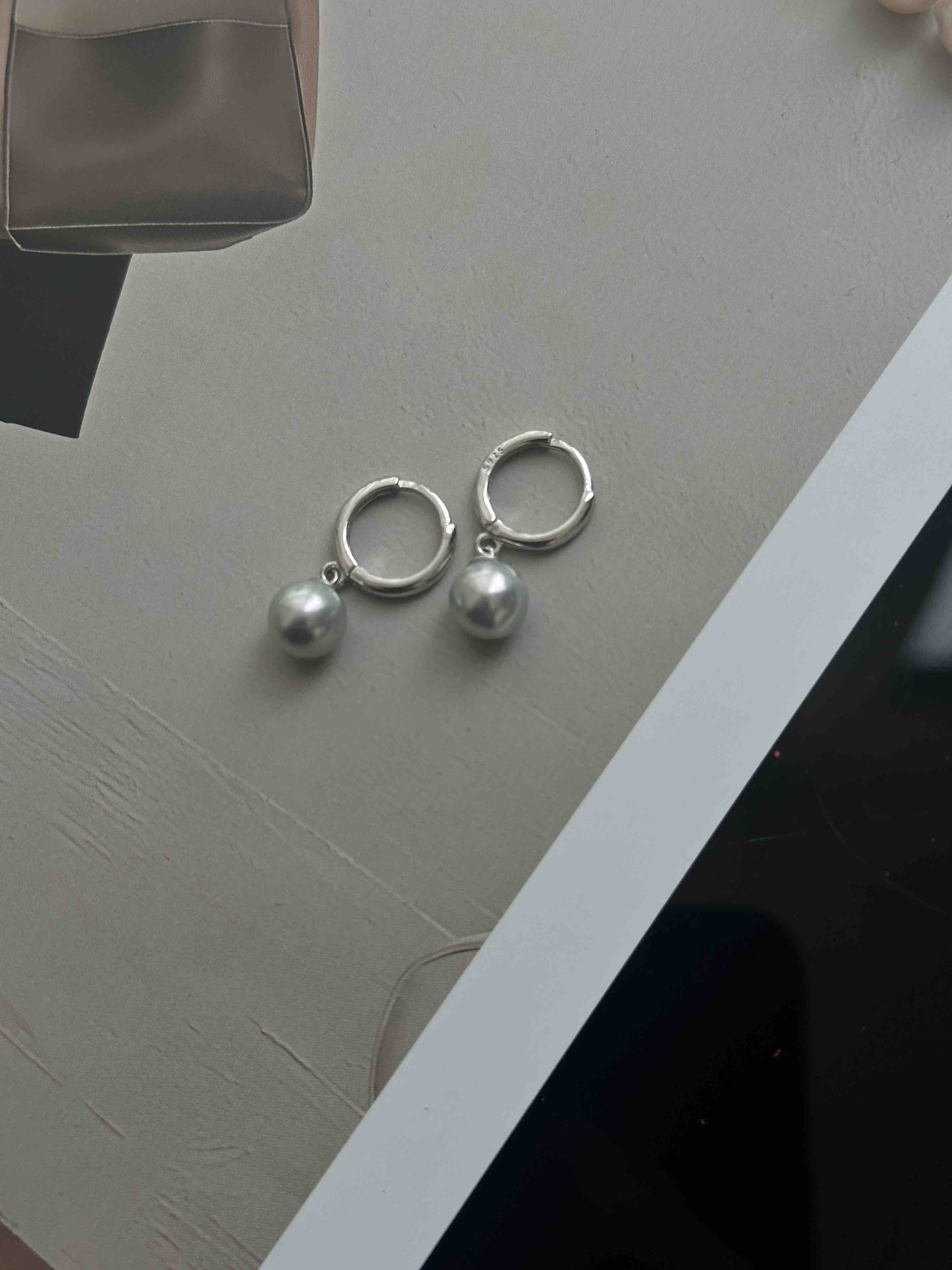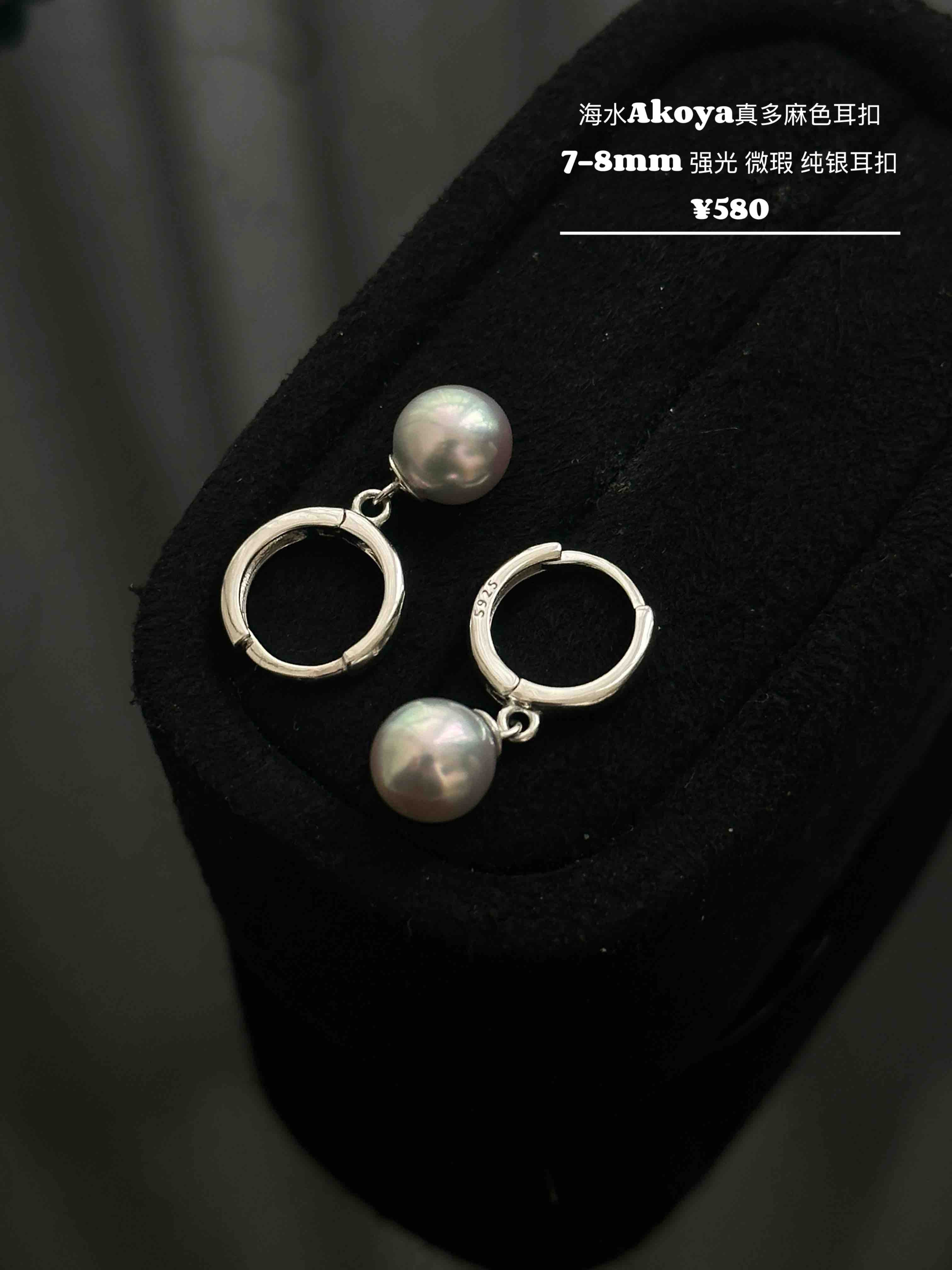7-8mm Akoya真多麻色海水珠,强光 微瑕,泛着清冷的银灰光泽 纯银耳扣,舒适又百搭