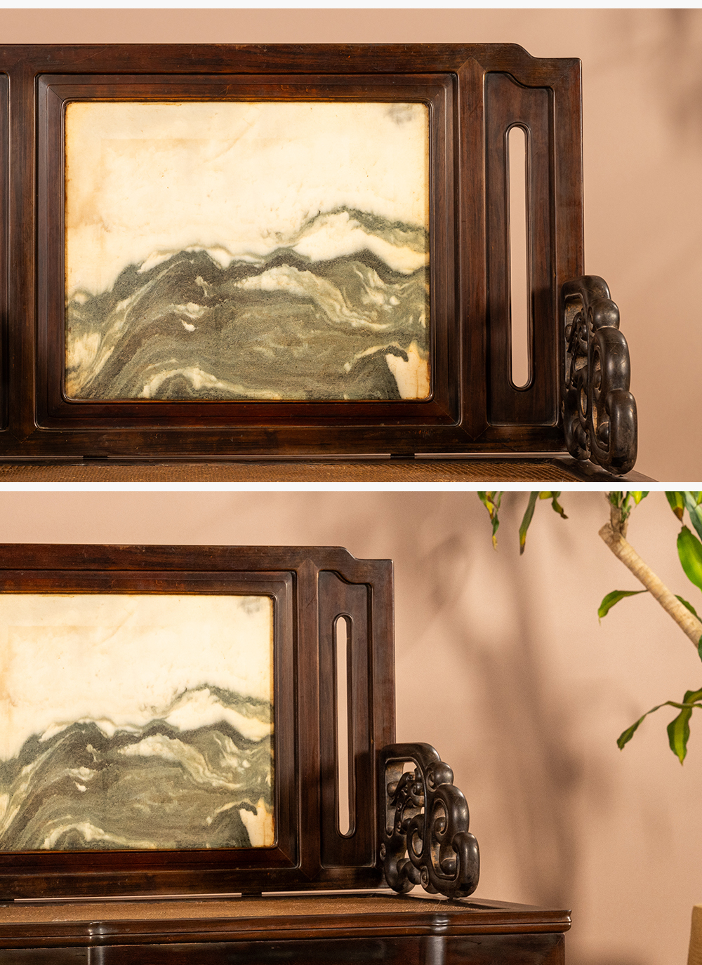 清代 红木镶瘿木嵌寿山石山水人物插屏