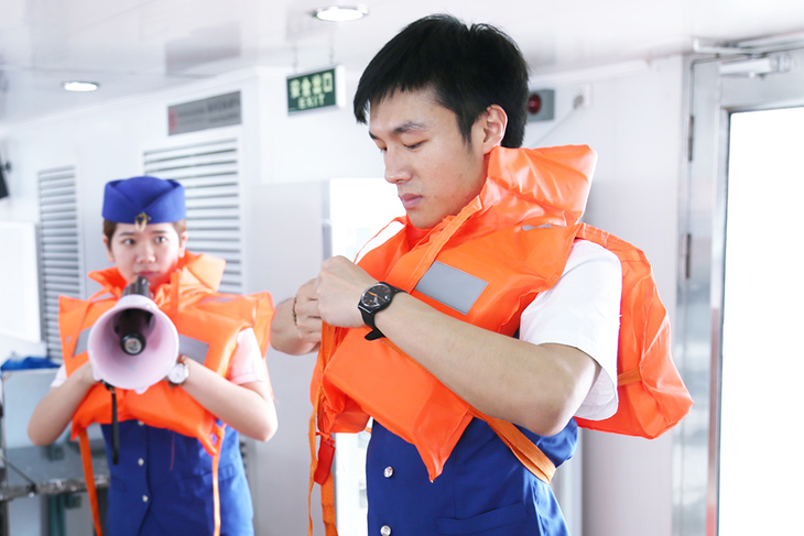 学习海上逃生技能(穿戴救生衣、打绳结或包扎等)——船员必备常识,船员哥哥/姐姐现场教学演示教你如何如何穿戴救生衣。