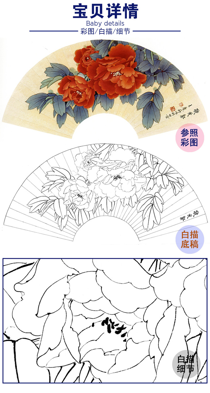 工笔花鸟白描底稿-牡丹花扇面小品-王庆升《状元红》-多种白描尺寸可选-SL11