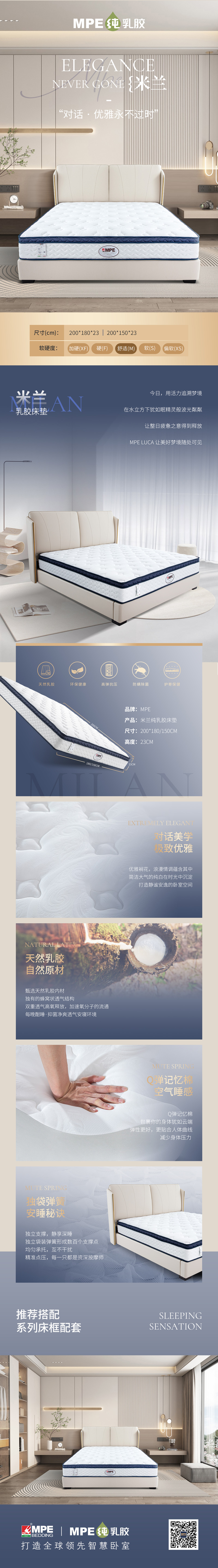 MPE寝具,1956年创立于意大利Corona Portabella(VA),是深度睡眠系统倡导者。长期致力于推动人类健康深度睡眠事业,是国内最早推出科技智能睡床和纯乳胶健康睡床的高端专业品牌。
