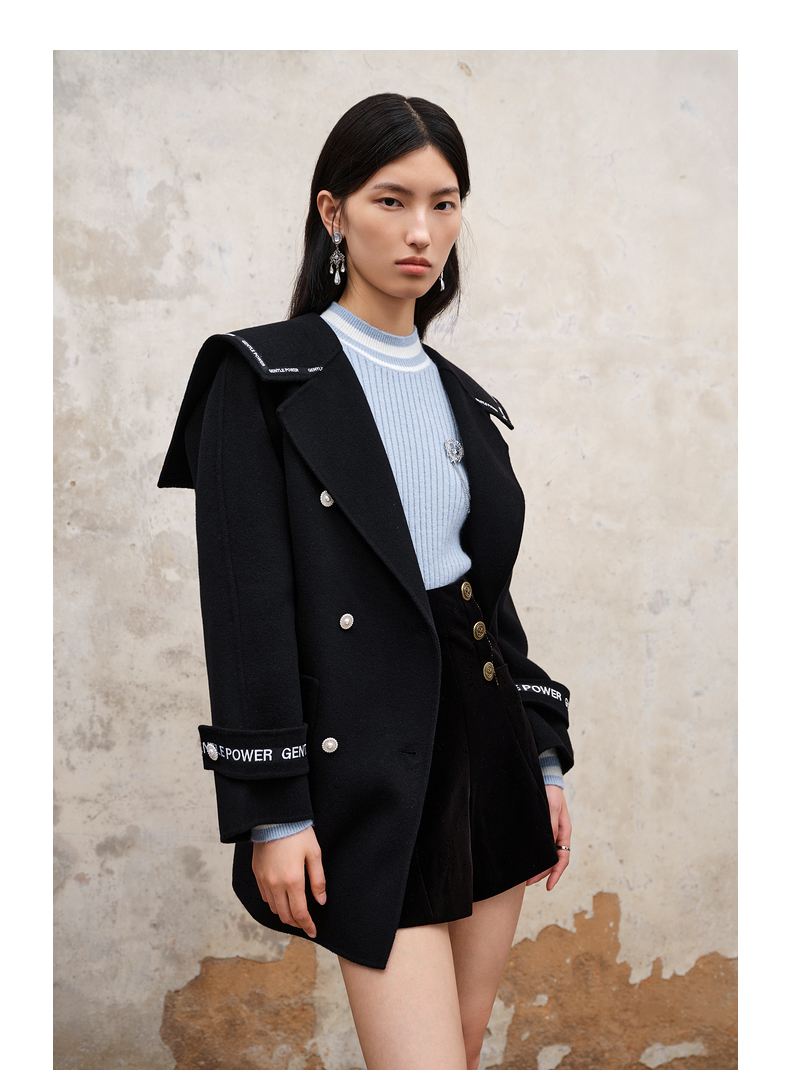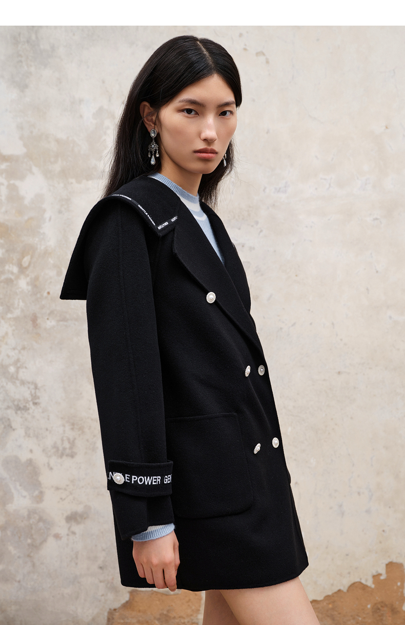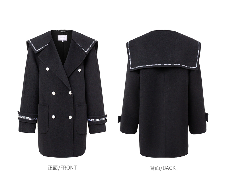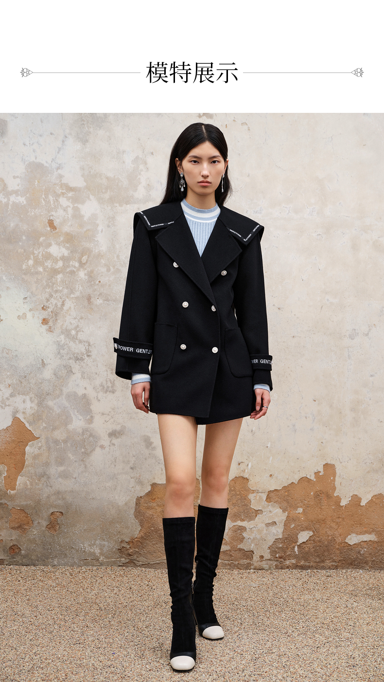 MAXRIENY军旅风黑色复古大翻领大衣双面呢羊毛外套(货号:MS88CT521)