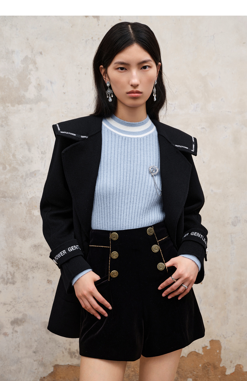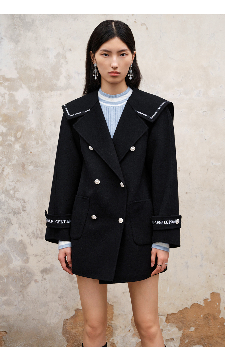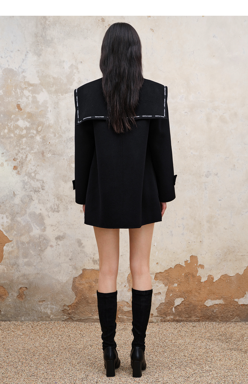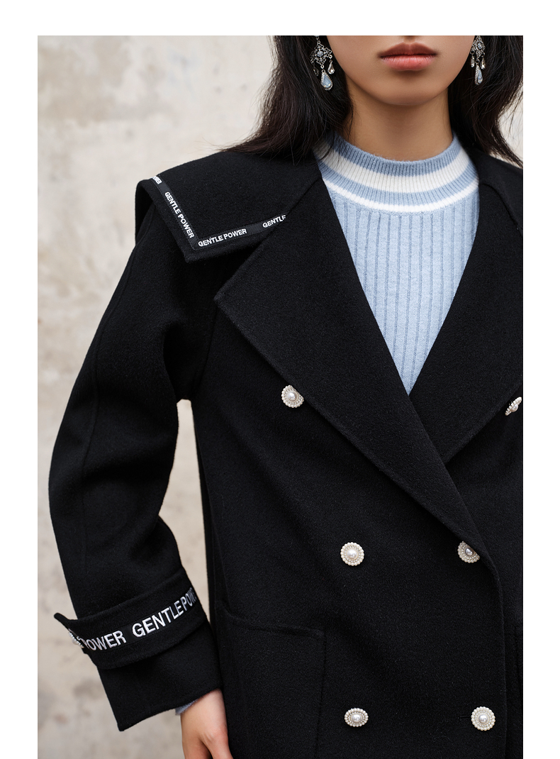 MAXRIENY军旅风黑色复古大翻领大衣双面呢羊毛外套(货号:MS88CT521)
