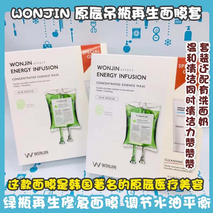 WONJIN 原辰吊瓶再生面膜套(10片+80ml洁面)👍林允种草❣这款面膜是韩国🇰🇷著名的原辰医疗美容👉专为术后修复所研制的哦!绿瓶再生修复面膜💚,调节水油平衡〽,适合油痘肌🙋,补水镇静舒缓,晒后修复☀,安全到副乳期都可以用的面膜哦✅,含有水光针36项再生物质,恢复弹力和抗老管理☺。套装还配有洗面奶💭,温和清洁同时清洁力赞赞赞👅!
