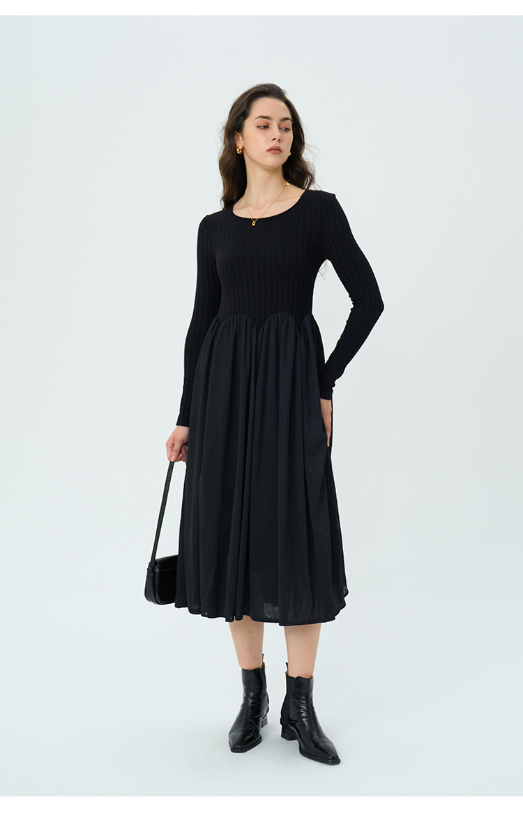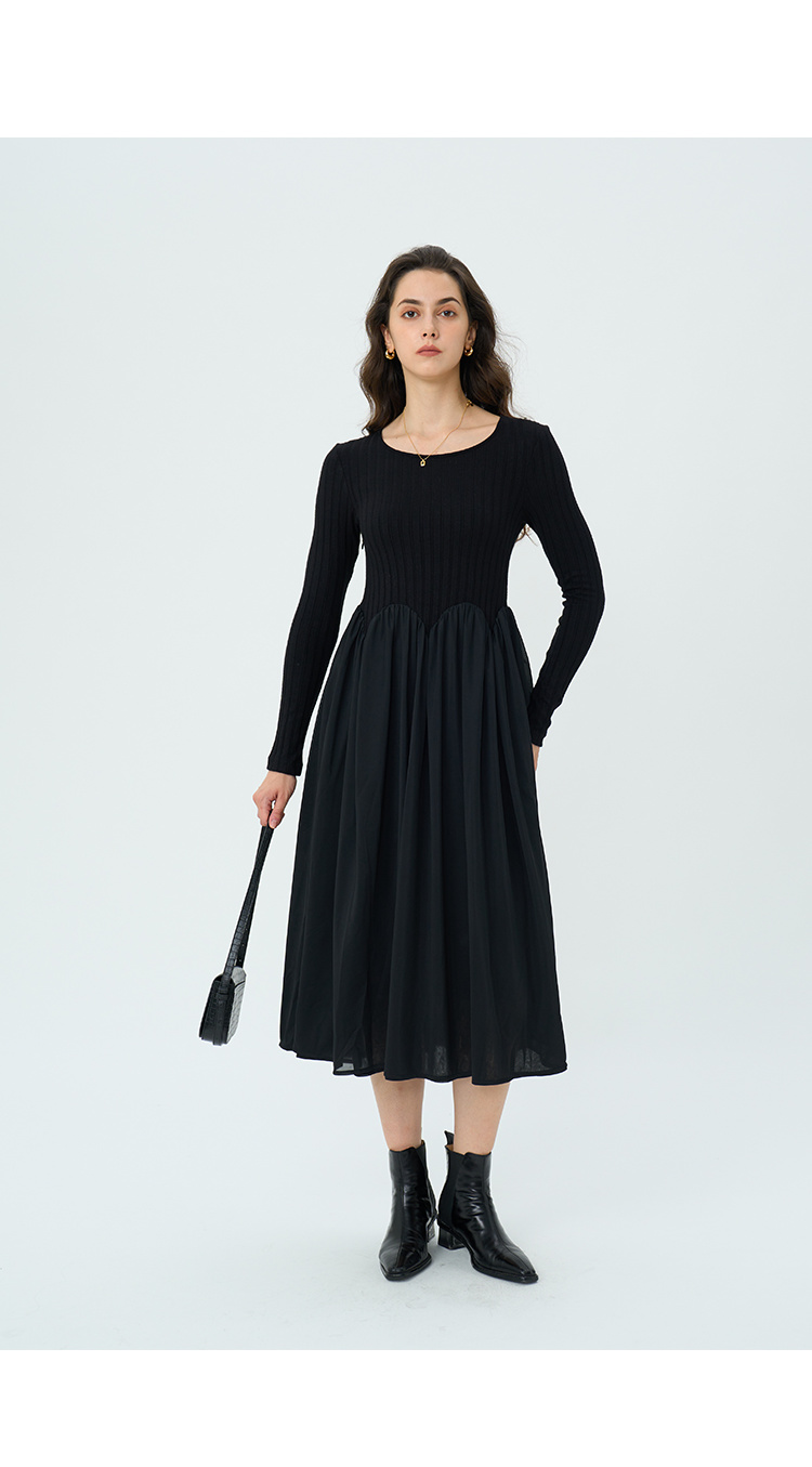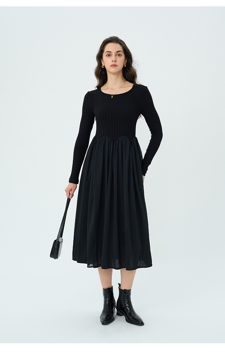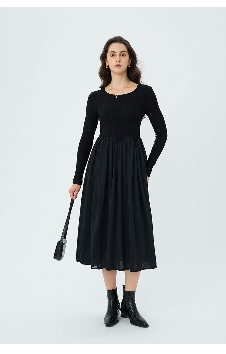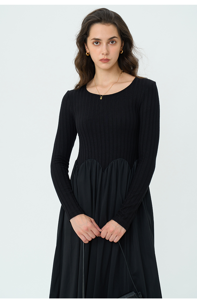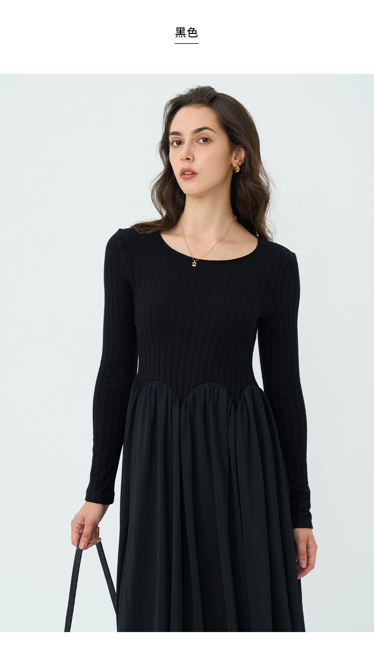 HeyDress针织拼接连衣裙女秋季法式圆领坑条显瘦小黑裙气质裙子