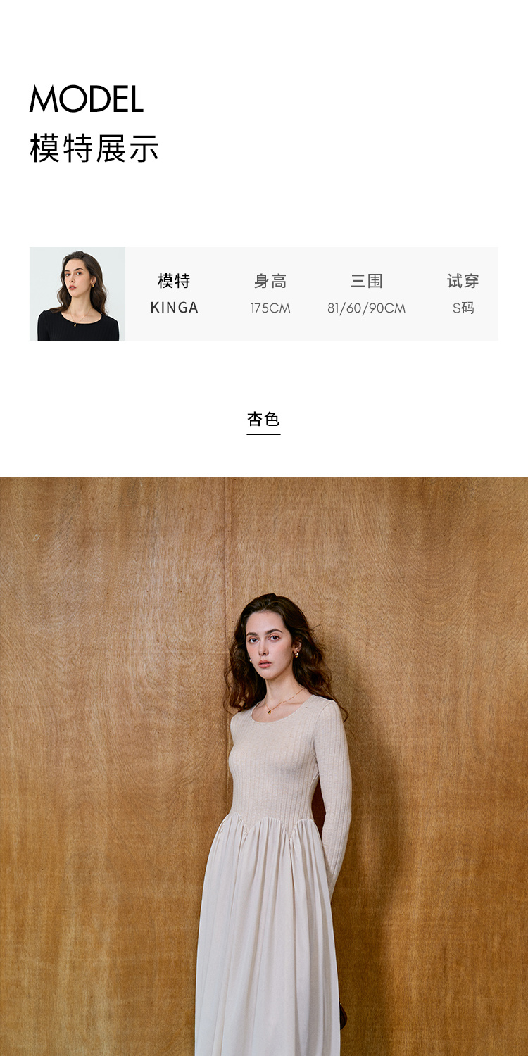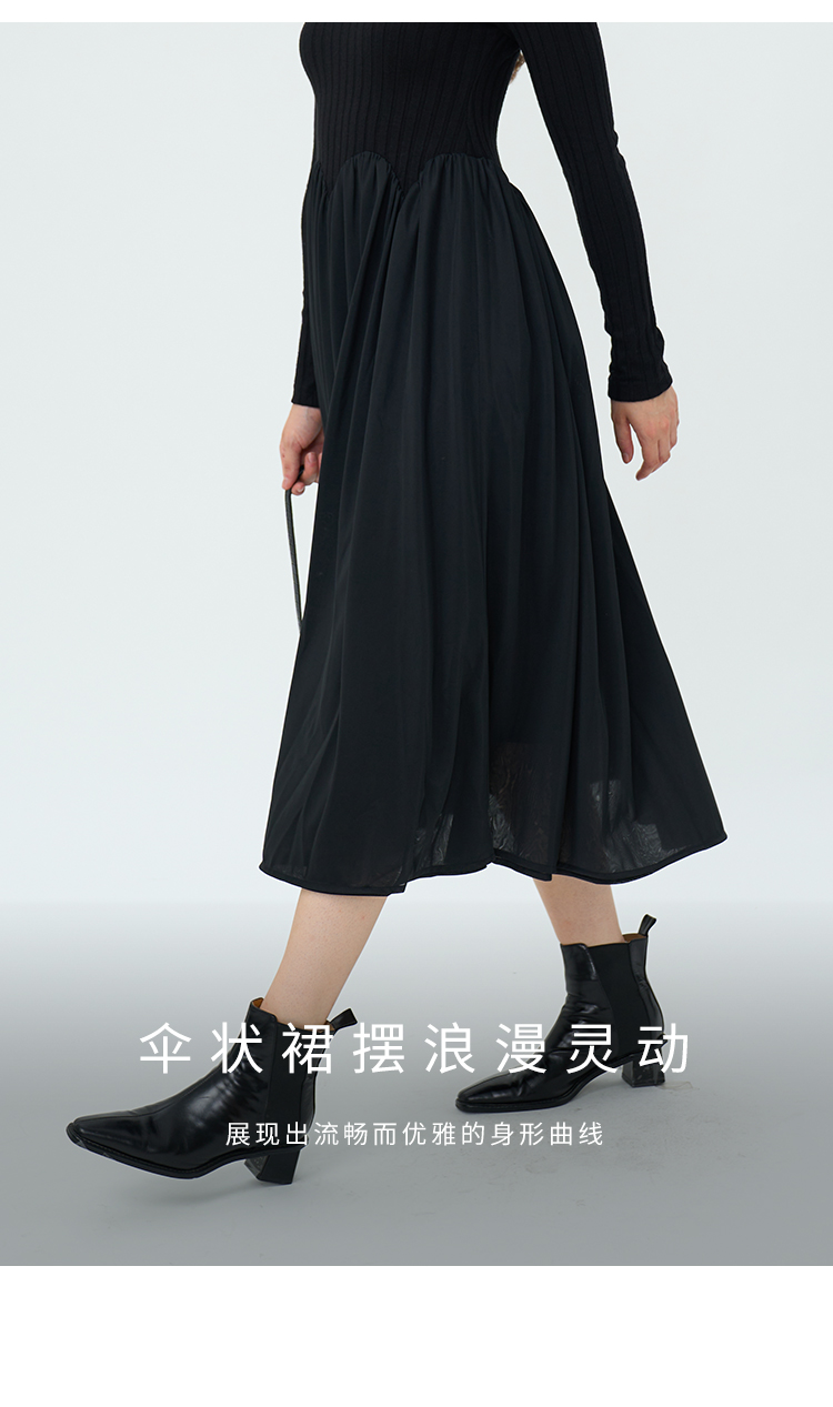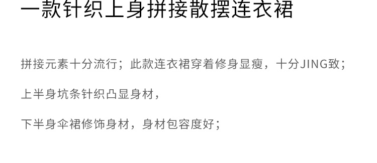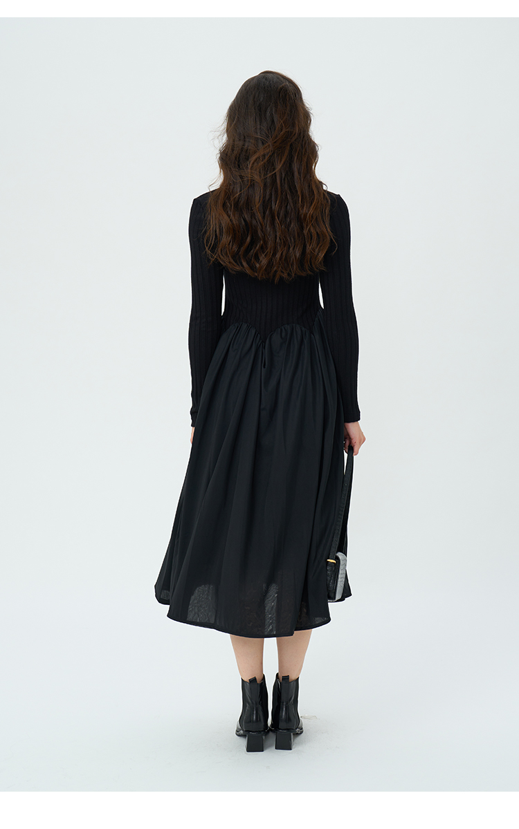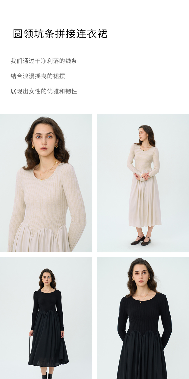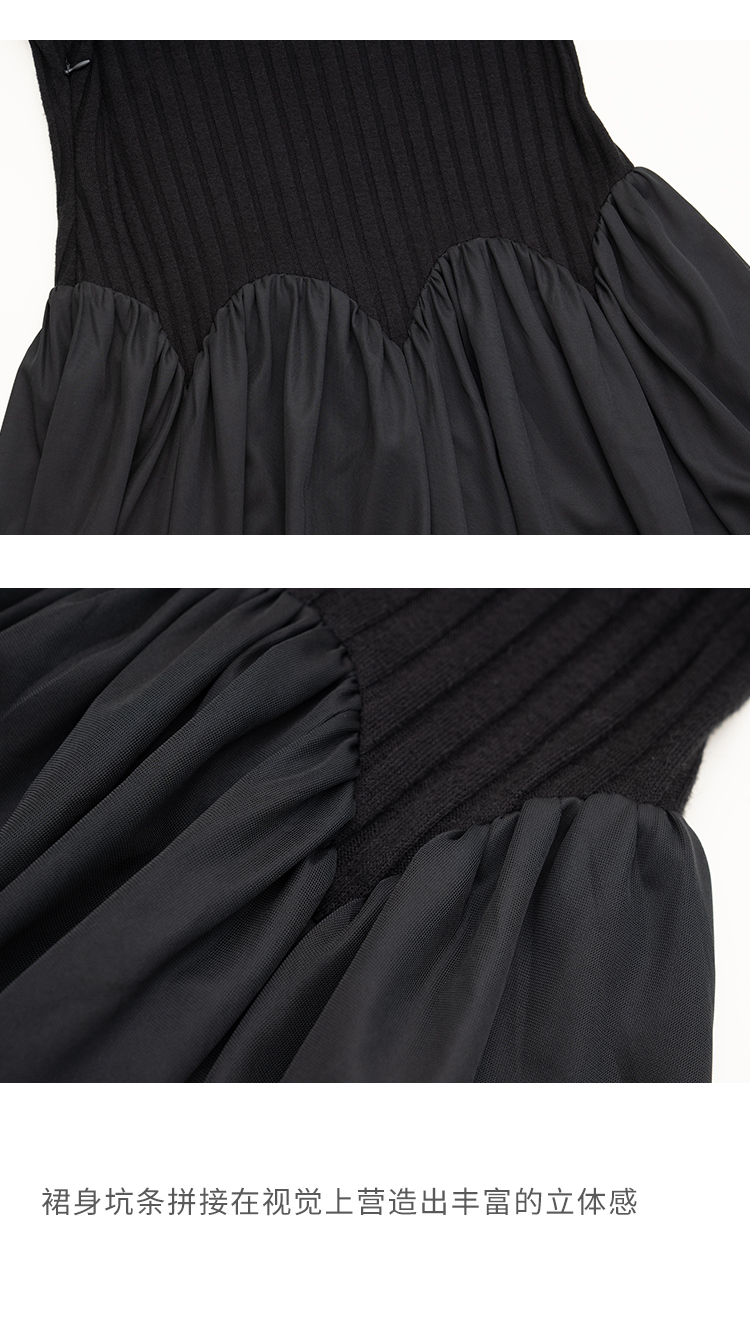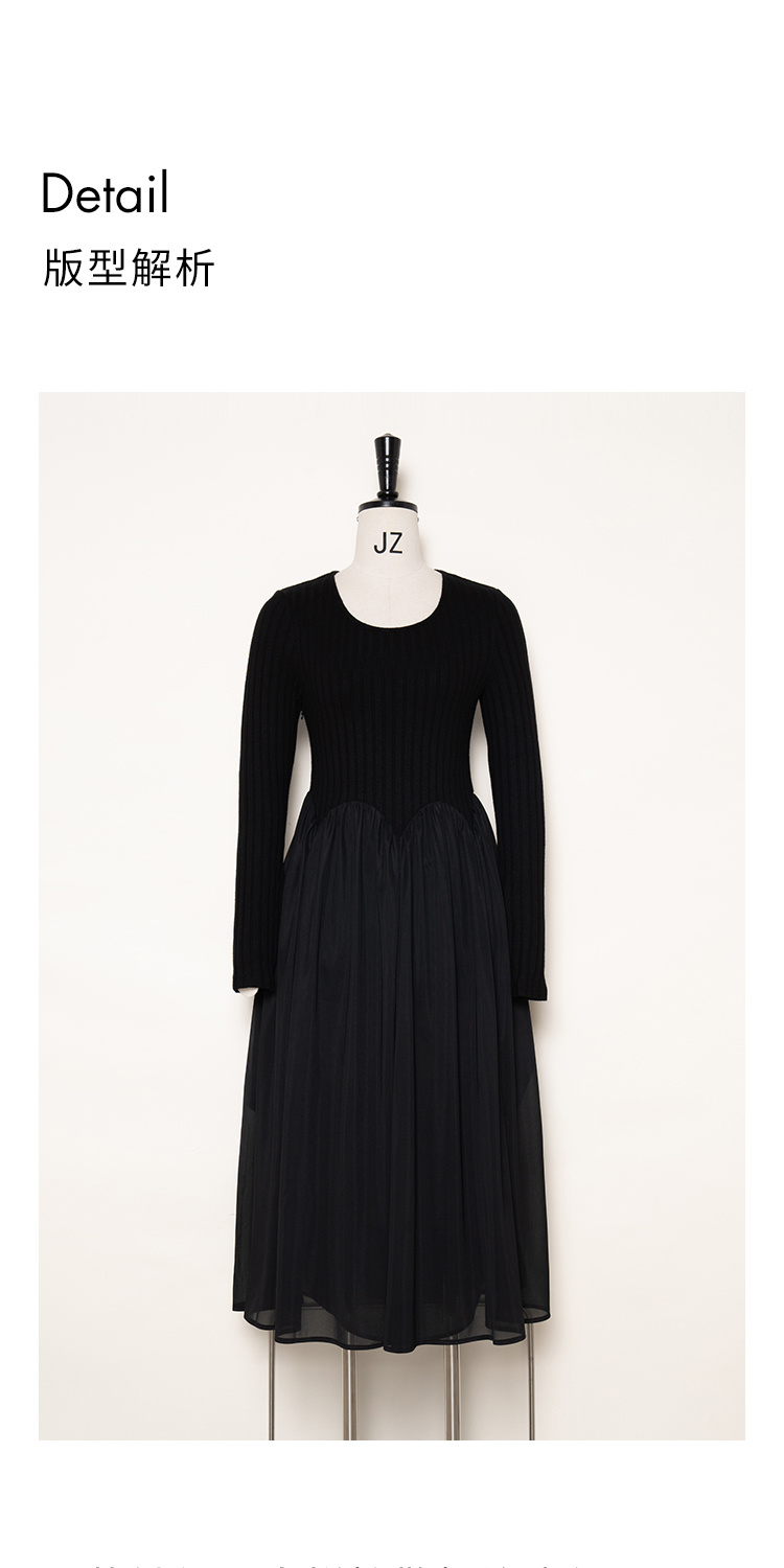 HeyDress针织拼接连衣裙女秋季法式圆领坑条显瘦小黑裙气质裙子