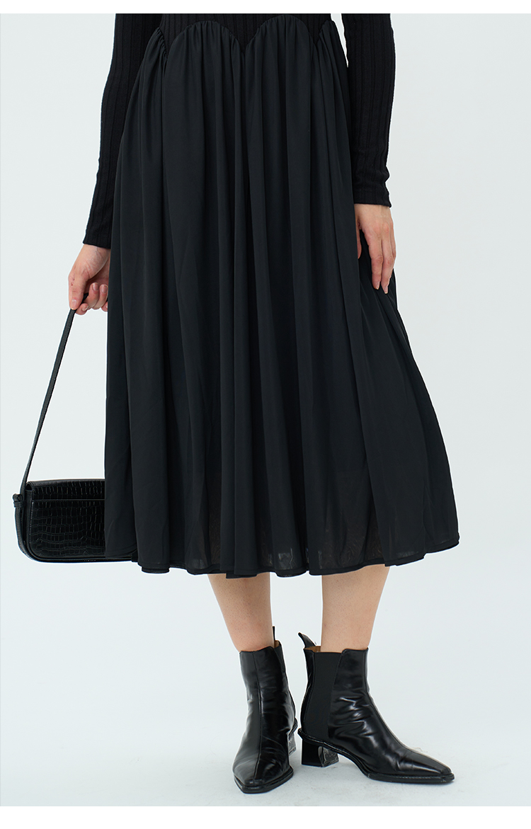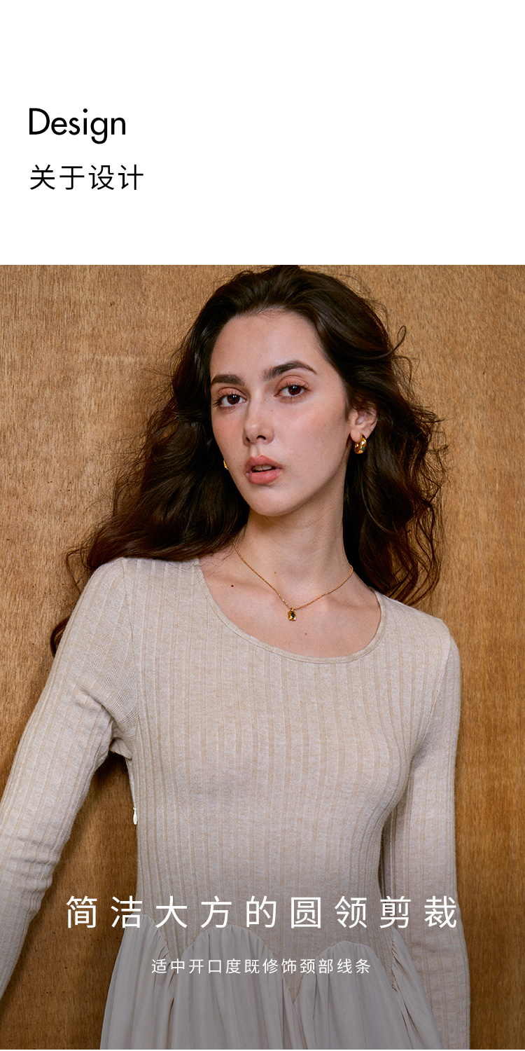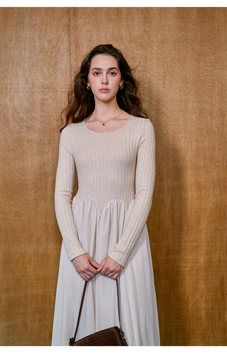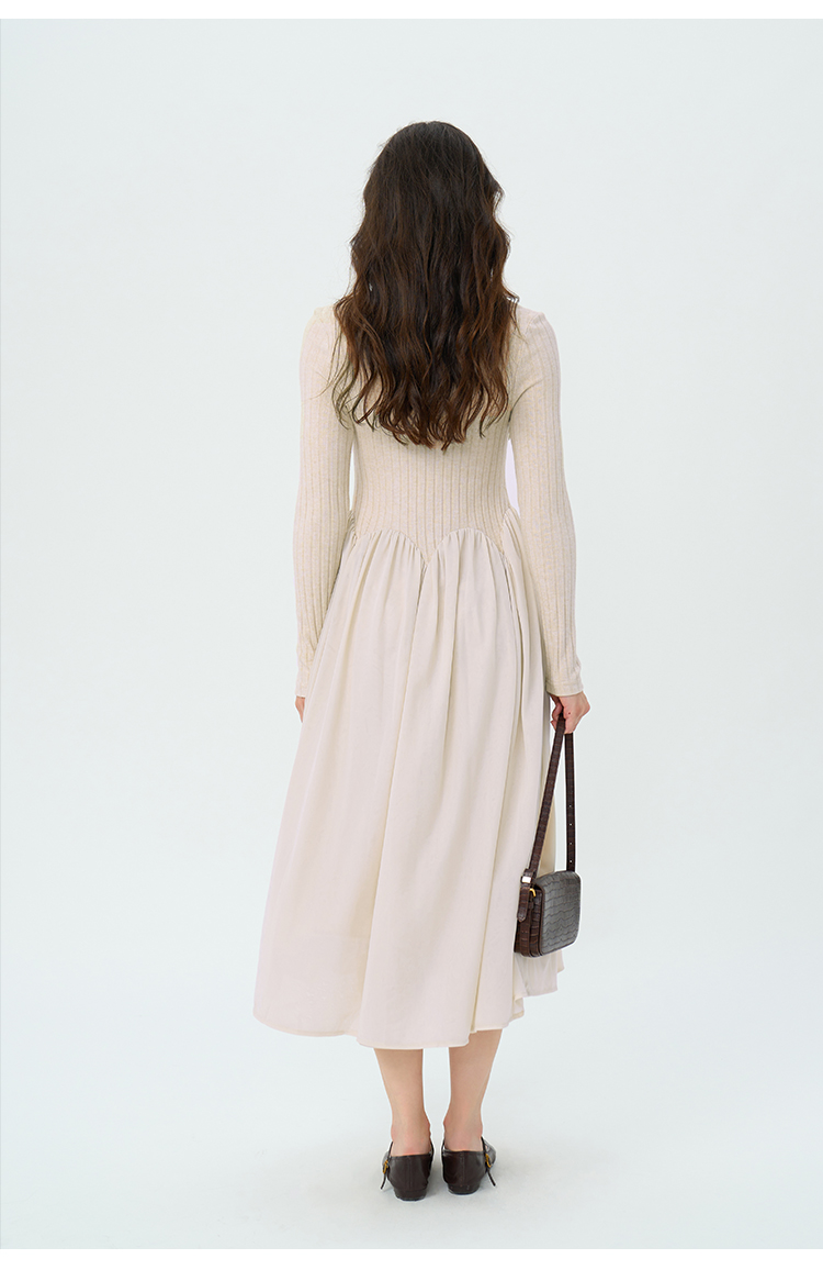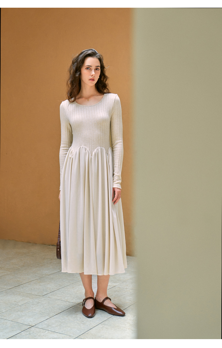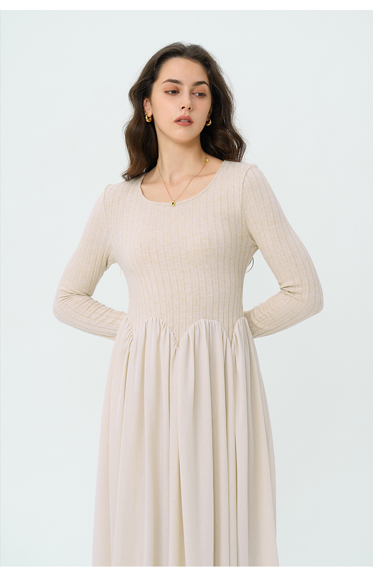 HeyDress针织拼接连衣裙女秋季法式圆领坑条显瘦小黑裙气质裙子