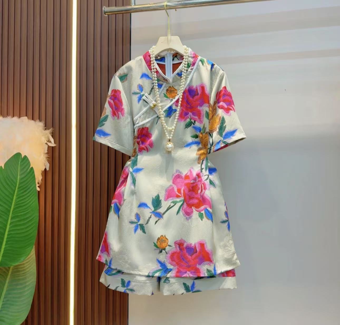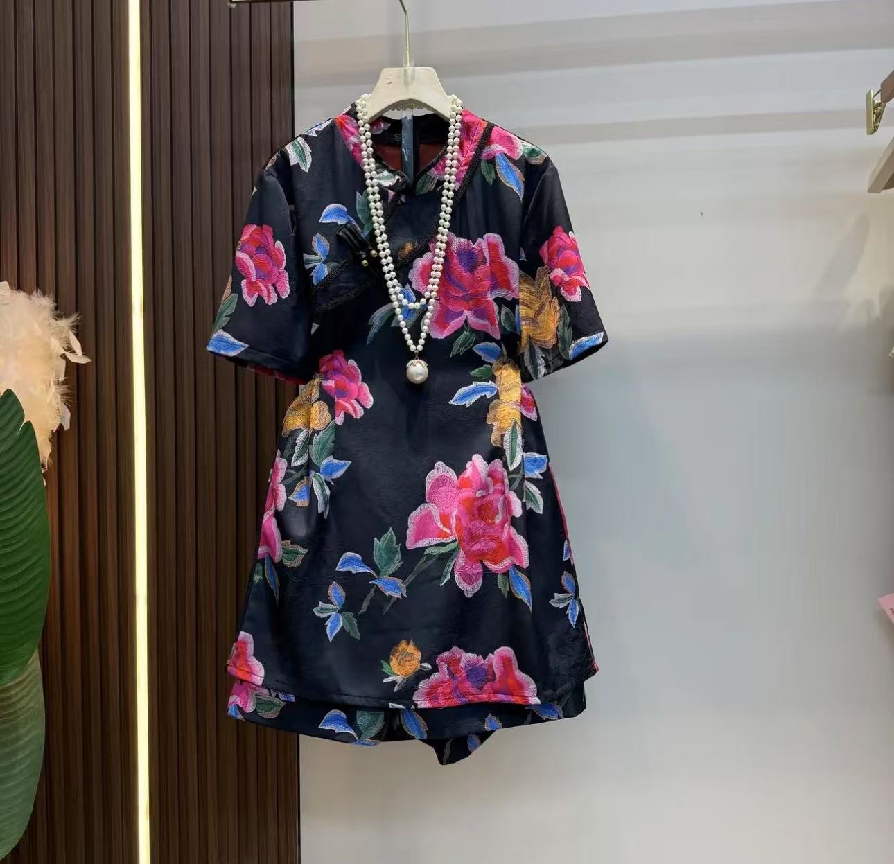 丁摩 夏季新中式女装国风改良旗袍裙子上衣短裤高端两件套装5ZF-047