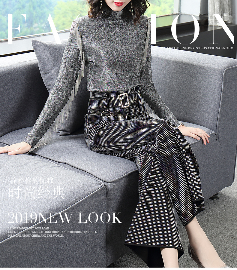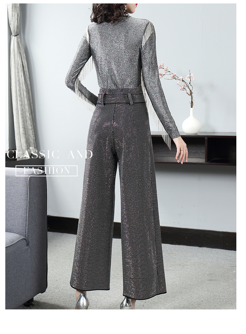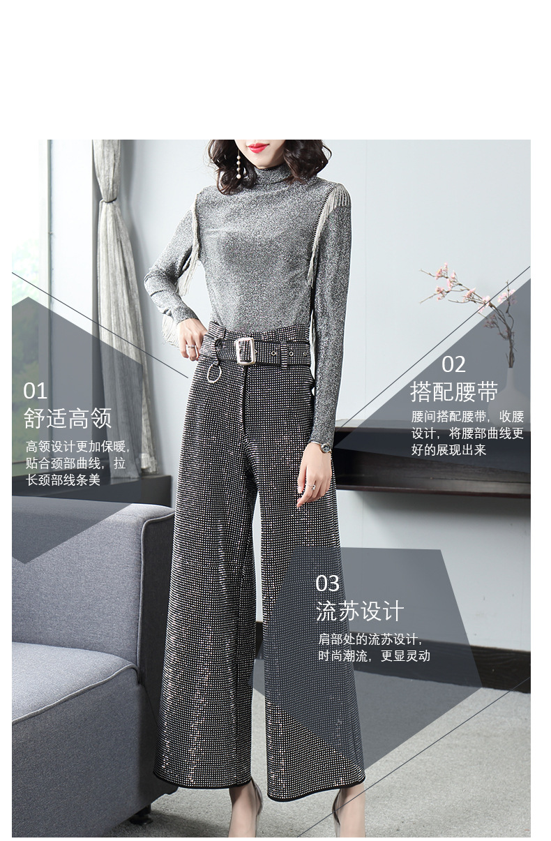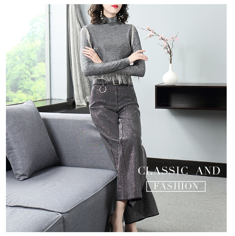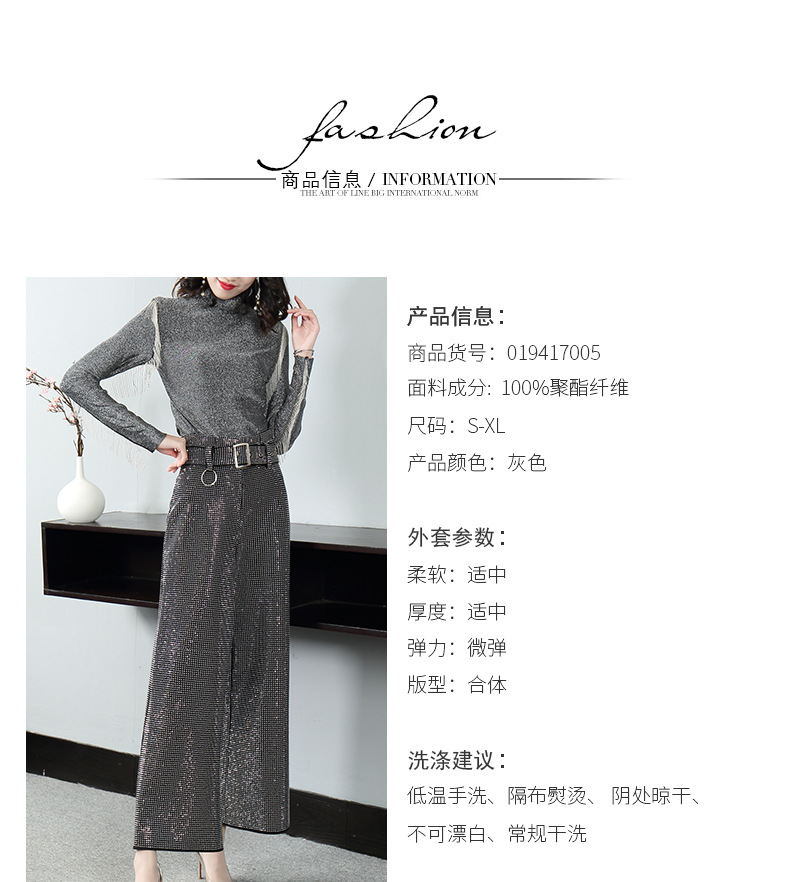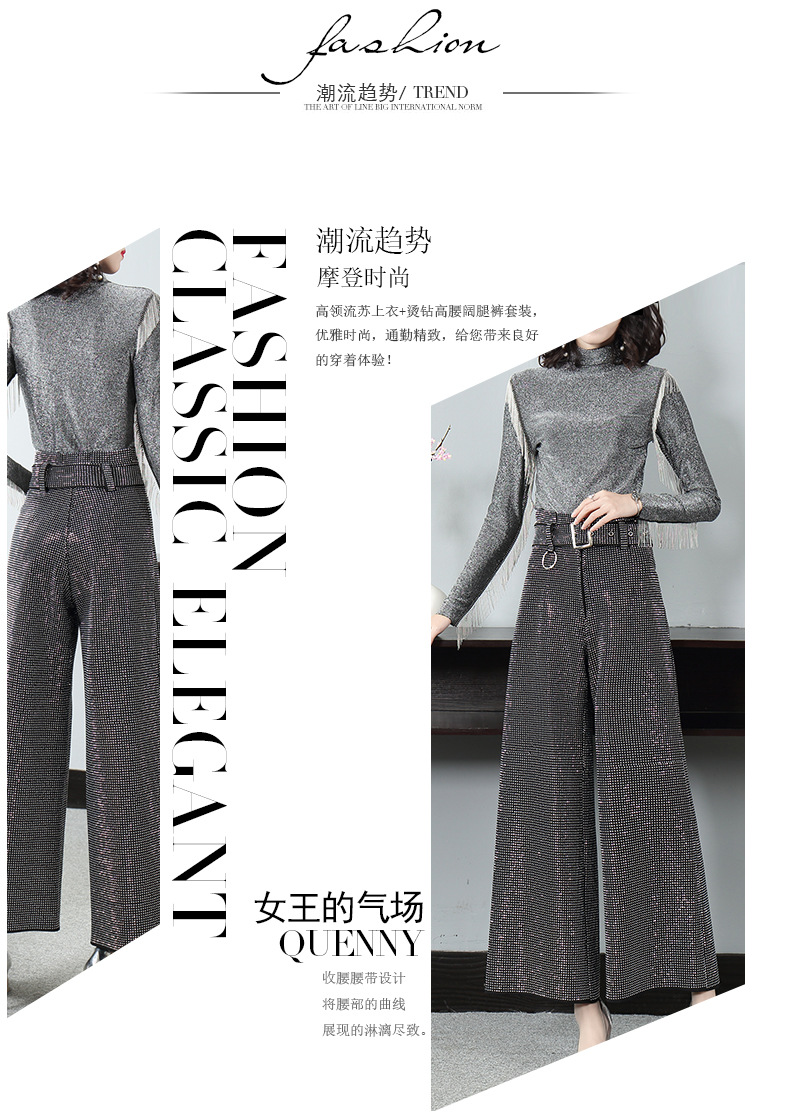 THX-019417005秋冬新款高领长袖流苏上衣+烫钻高腰阔腿裤时尚套装