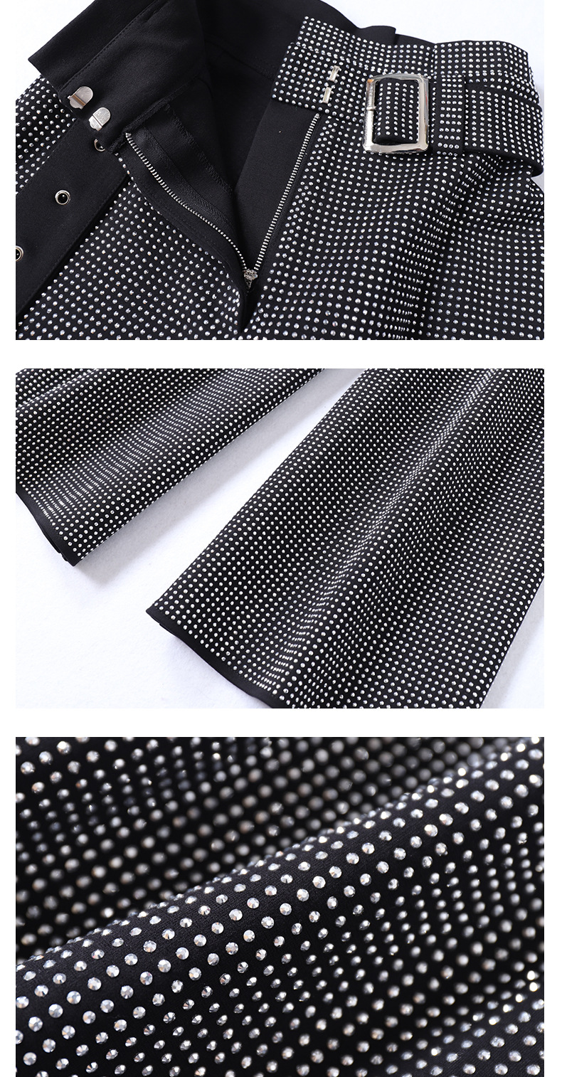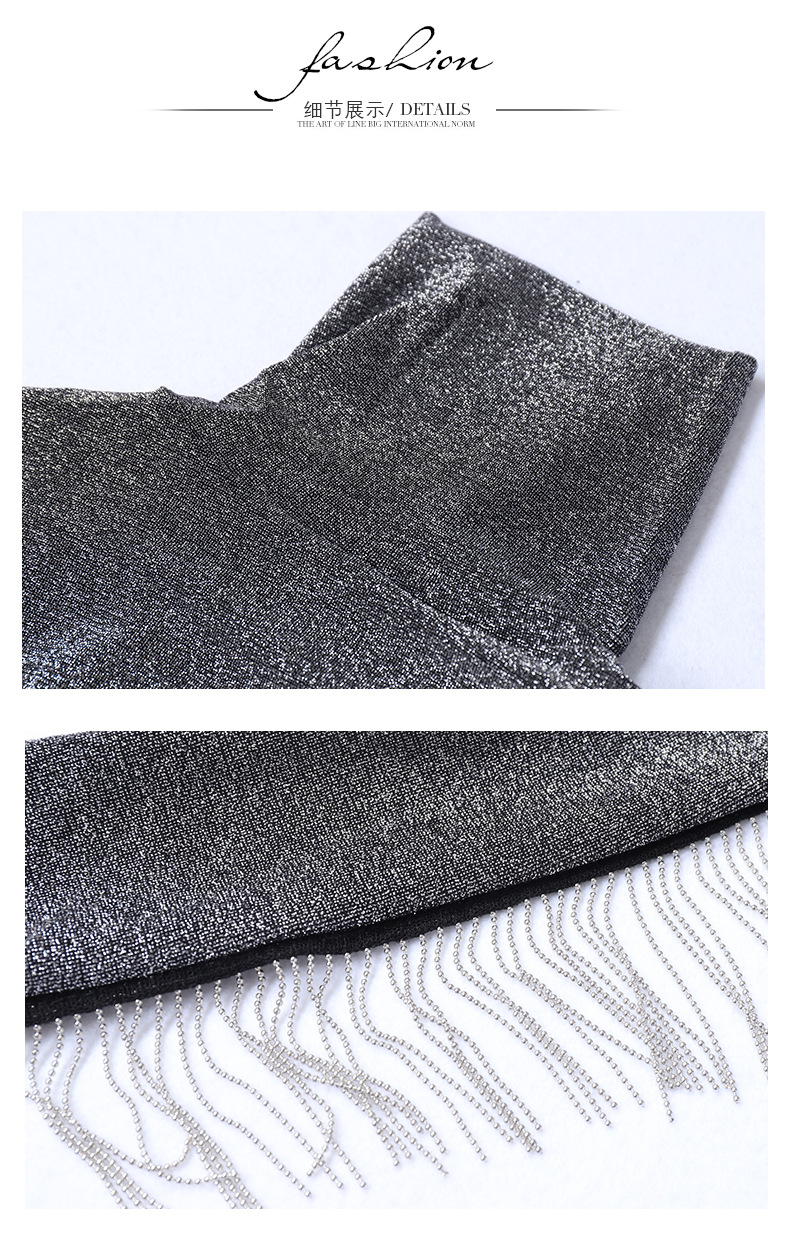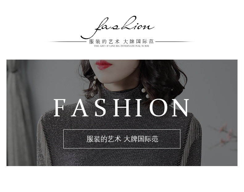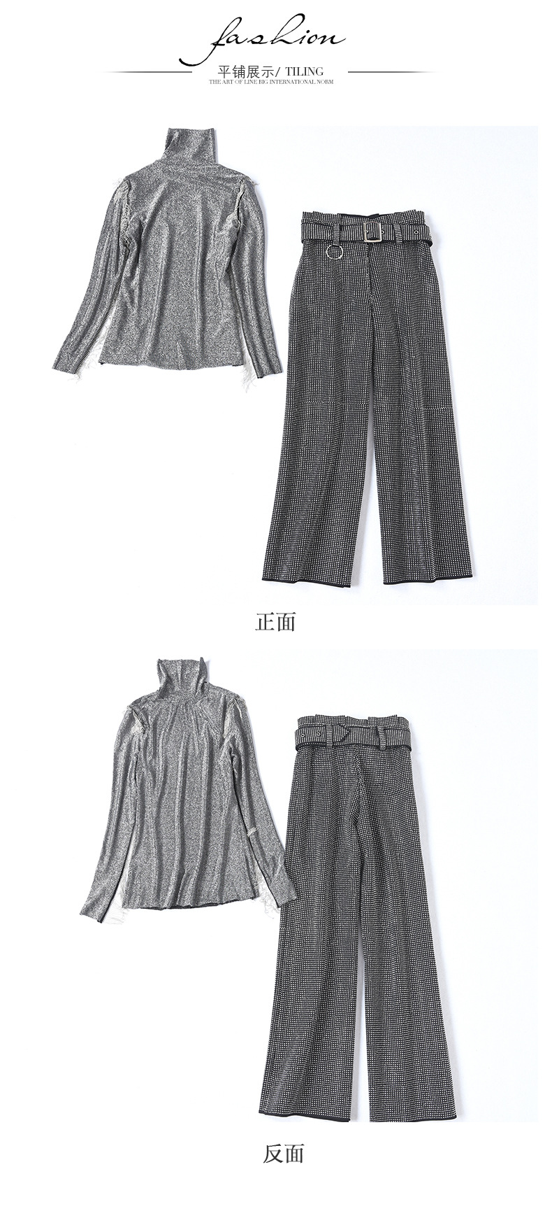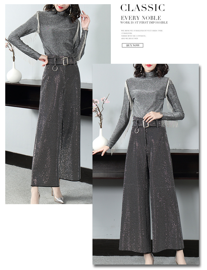 THX-019417005秋冬新款高领长袖流苏上衣+烫钻高腰阔腿裤时尚套装
