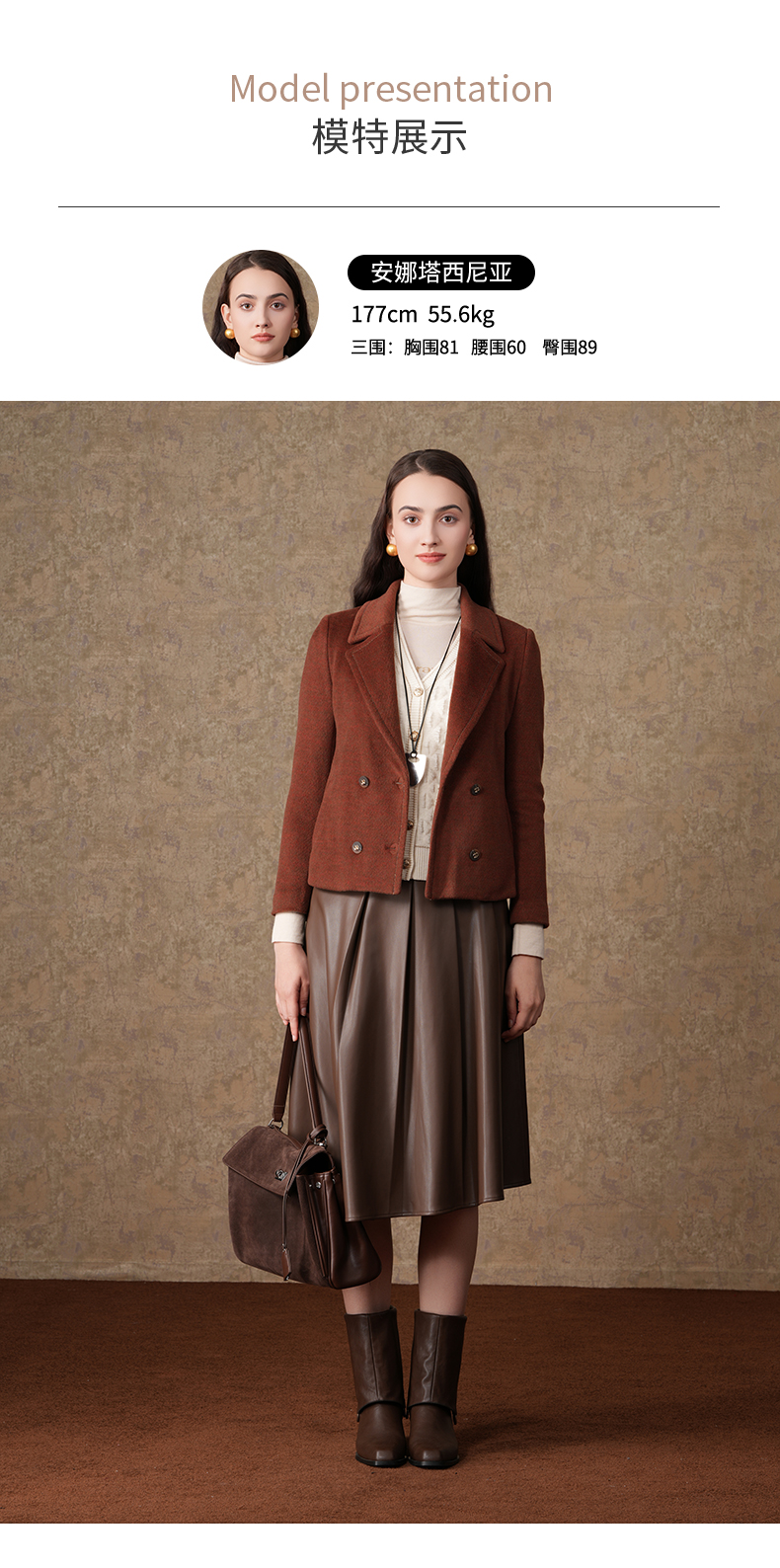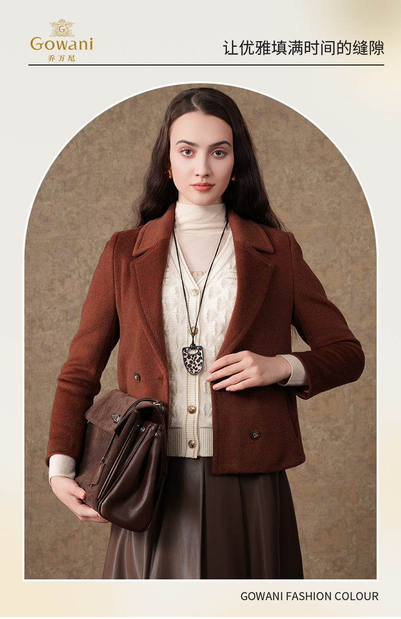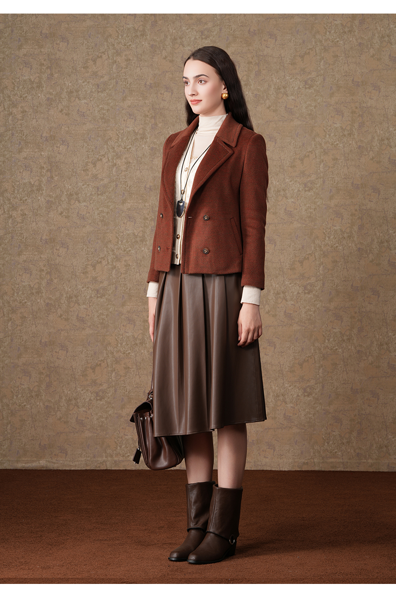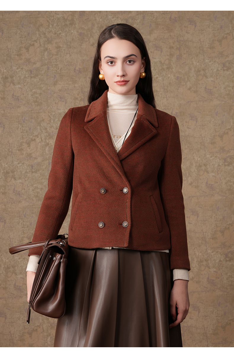 乔万尼100%绵羊毛短款翻领双排扣正肩利落感羊毛外套短大衣EF4B178